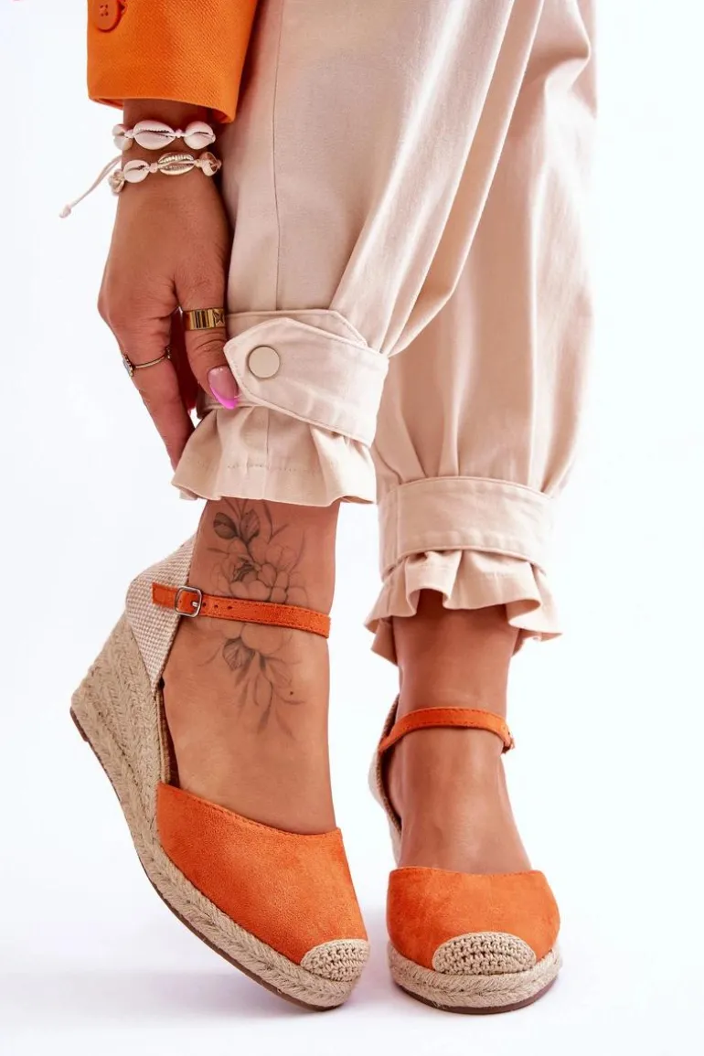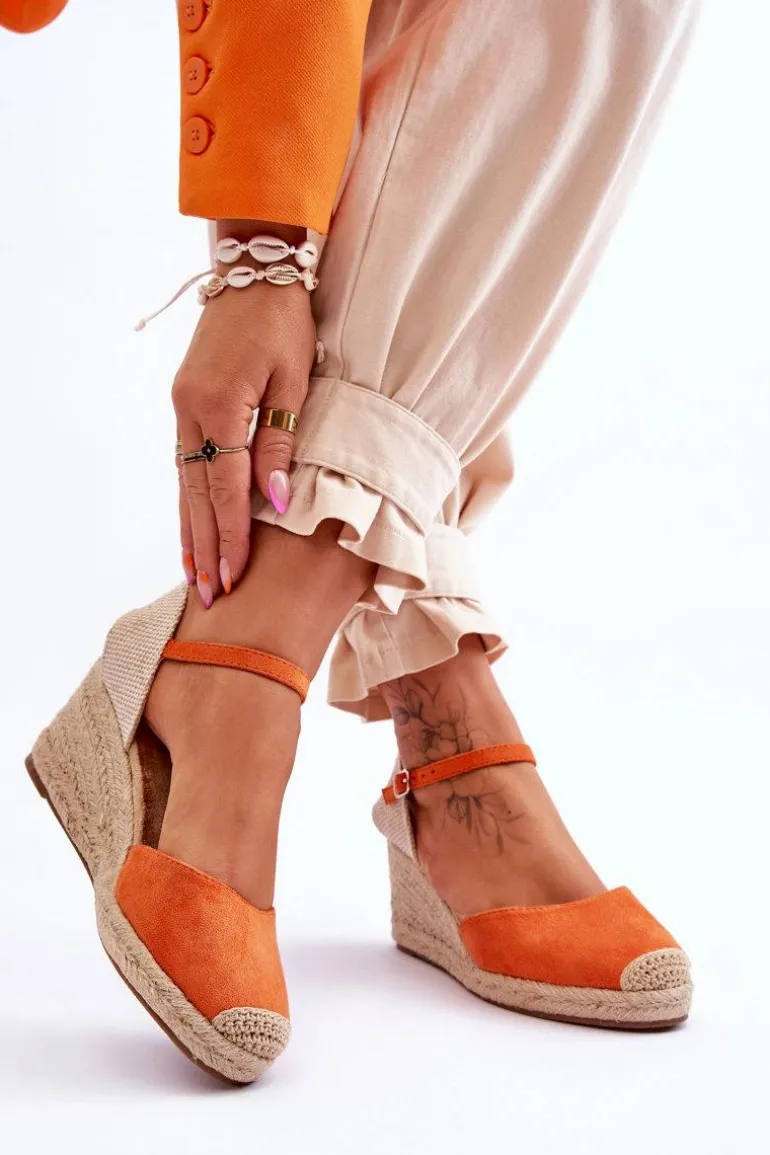 Klasyczne sandały damskie o fasonie espadryli zostały wykonane z połączenia eko zamszu oraz tkaniny. Sandałki te posiadają regulowany pasek zapinany na sprzączkę wokół kostki. Osadzono na koturnie i platformie zdobioną jutową plecionką. Podeszwa w tych butach jest gumowa i antypoślizgowa. Miękka, eko zamszowa wkładka zadba o Twój komfort i wygodę. Przy wyborze rozmiaru prosimy sugerować się tabelą rozmiarów.