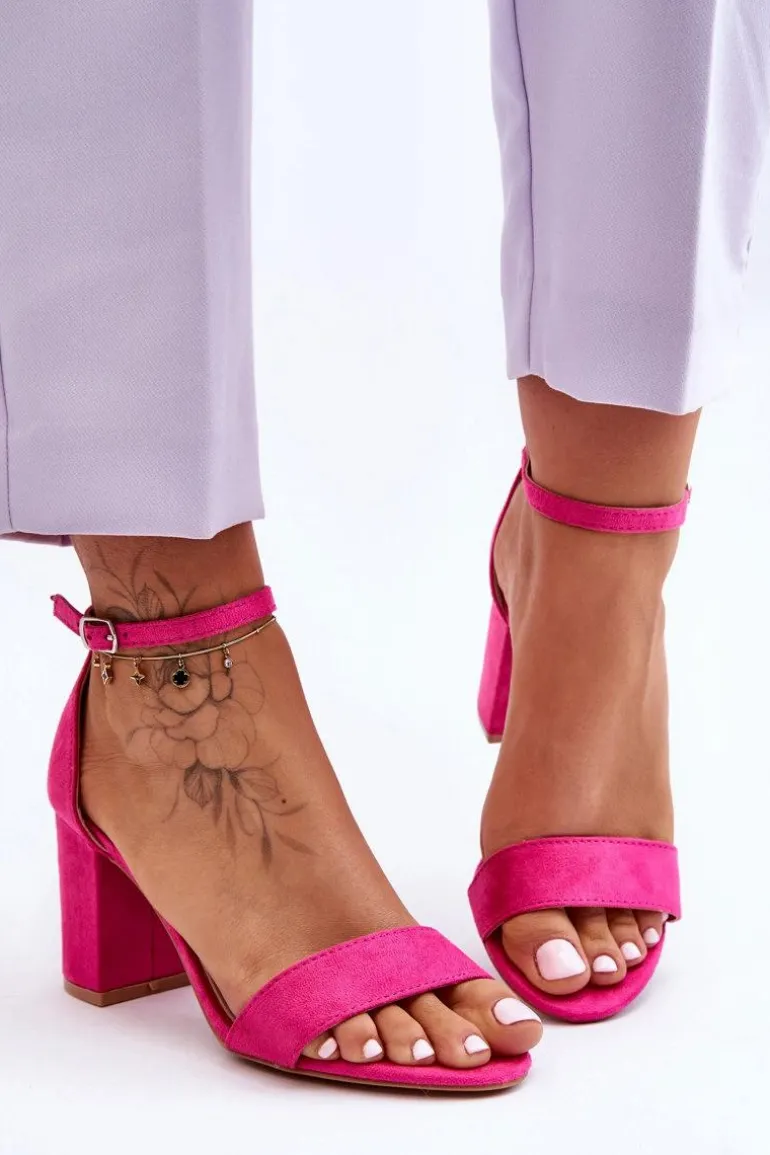 Klasyczne sandałki damskie osadzono na obcasie w postaci stabilnego słupka. Buty te zostały wykonane z eko zamszu. Nosek jest odkryty, zaokrąglony. Miękka wkładka z eko skóry zapewni komfort podczas użytkowania. Buty posiadają regulowany pasek zapinany na sprzączkę wokół kostki. Model ten wykorzystasz w wielu stylizacjach. Dodatkowo zapiętek został delikatnie usztywniony. Przy wyborze rozmiaru prosimy sugerować się tabelą rozmiarów.