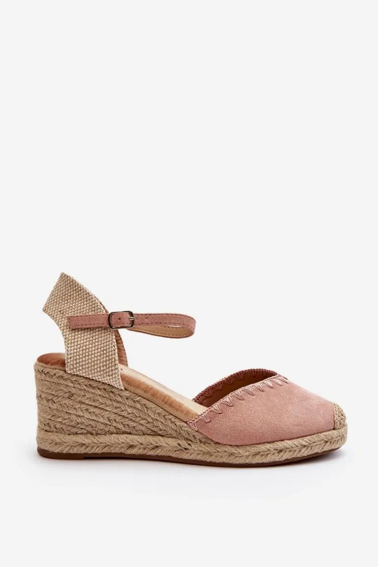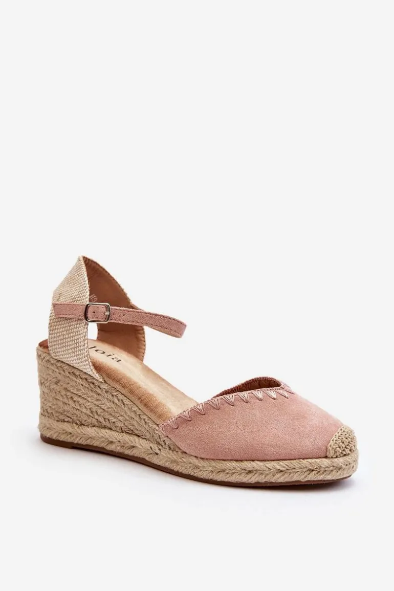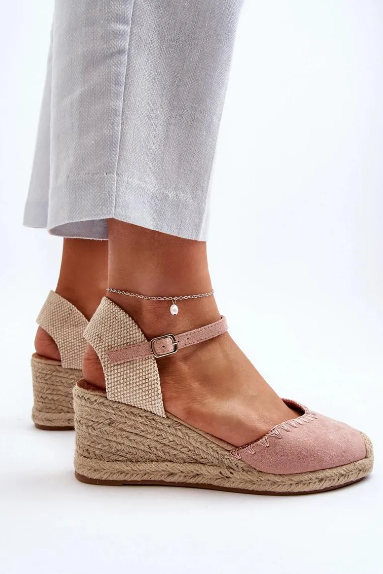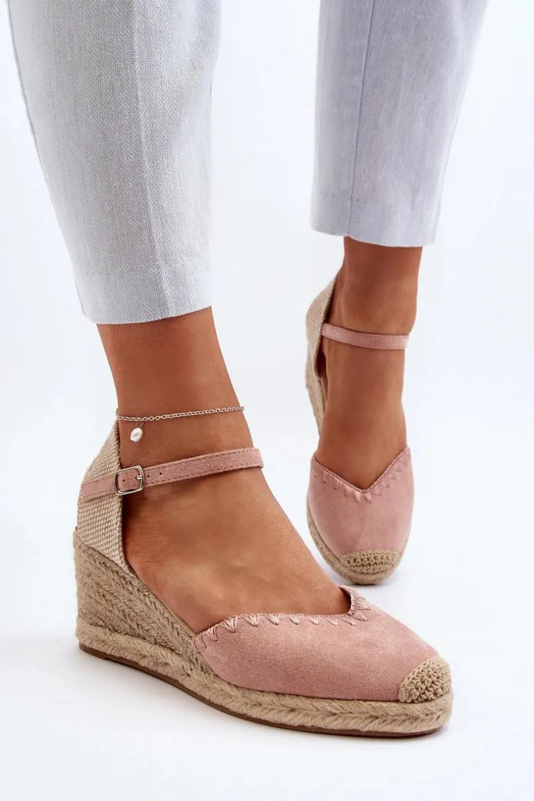 Sandały damskie w stylu espadryli. Wykonane z połączenia eko zamszu i tkaniny. Ich regulowany pasek zapinany na sprzączkę wokół kostki zapewnia idealne dopasowanie. Osadzone na koturnie i platformie zdobionej jutową plecionką, która dodaje subtelnego uroku i letniego charakteru. Miękka wkładka z eko zamszu gwarantuje komfort i wygodę podczas noszenia. Model ten to doskonały wybór na ciepłe dni! Przy wyborze rozmiaru prosimy sugerować się tabelą rozmiarów.