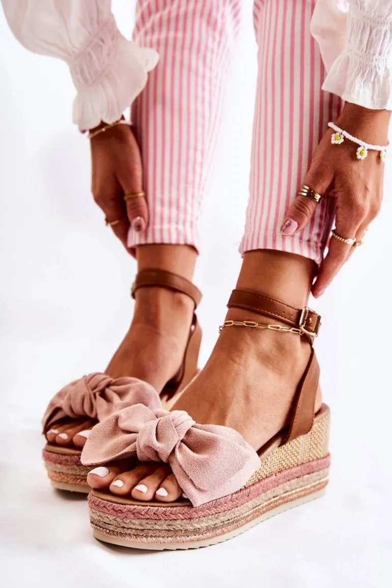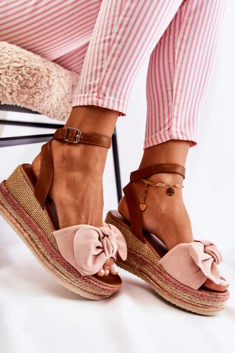 Sandały damskie wykonane z eko zamszu. Regulowane zapinanie ze sprzączką. Głównym elementem zdobienia jest piękna kokarda z eko zamszu. Koturn posiada trzy kolorowe, plecione paski. Podeszwa jest gumowa i antypoślizgowa. Eko skórzana wkładka zadba o Twój komfort i wygodę. Sandały świetnie sprawdzą się w letnich stylizacjach. Przy wyborze rozmiaru prosimy sugerować się tabelą rozmiarów.