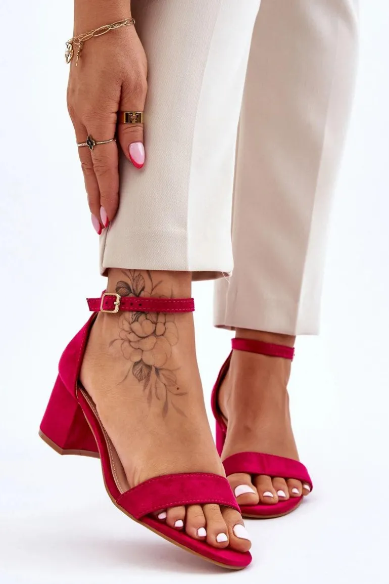 Wyjątkowe sandałki na niewysokim obcasie w postaci stabilnego słupka. Wykonane z przyjemnego w dotyku eko zamszu. Sandałki te posiadają usztywniany zapiętek. Wkładka wykonana z eko skóry zapewni komfortowe użytkowanie. Nosek odkryty, zaokrąglony. Zapinane wokół kostki na regulowany pasek ze sprzączką. Na pewno wykorzystasz je w wielu sytuacjach! Przy wyborze rozmiaru prosimy sugerować się tabelą rozmiarów.