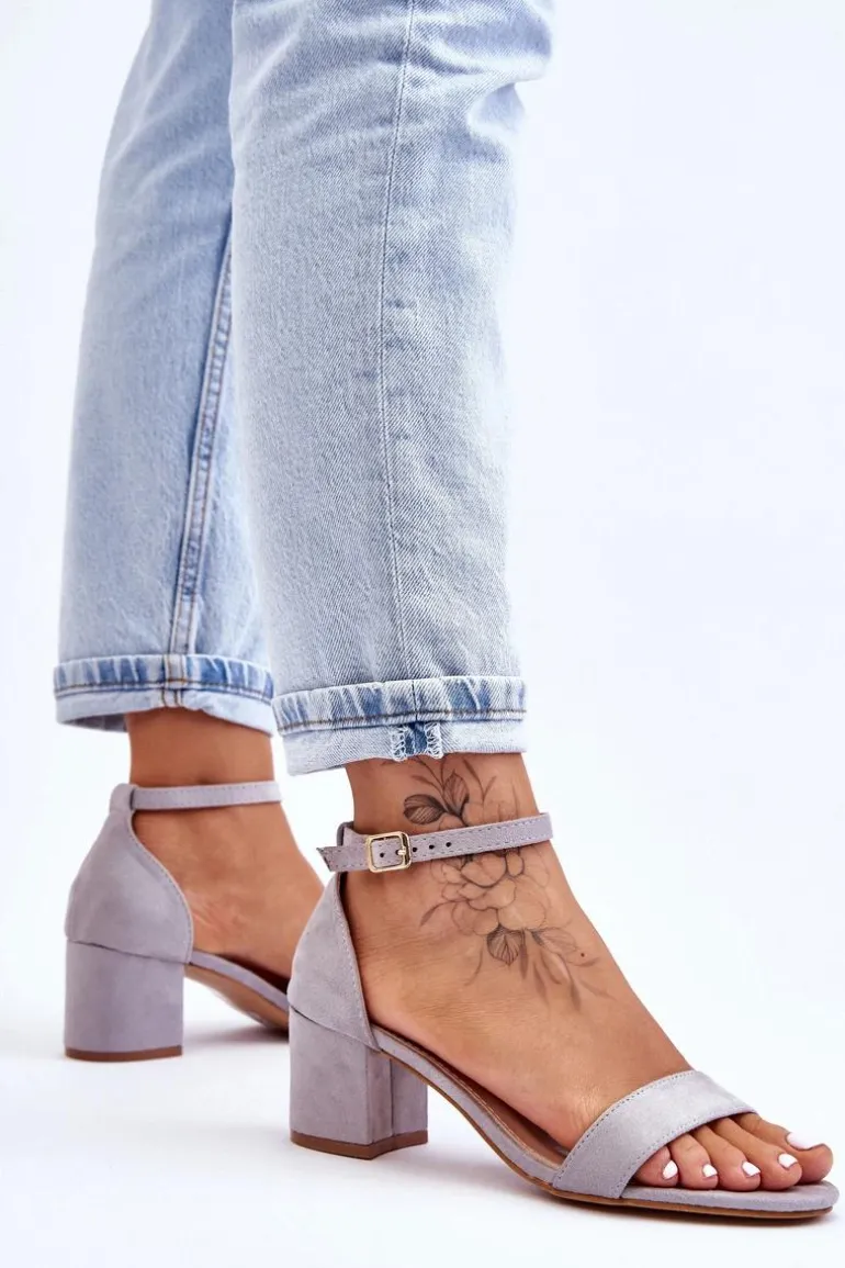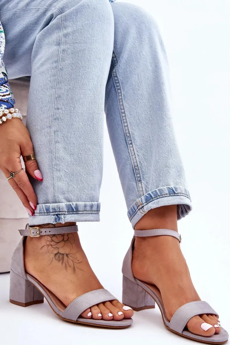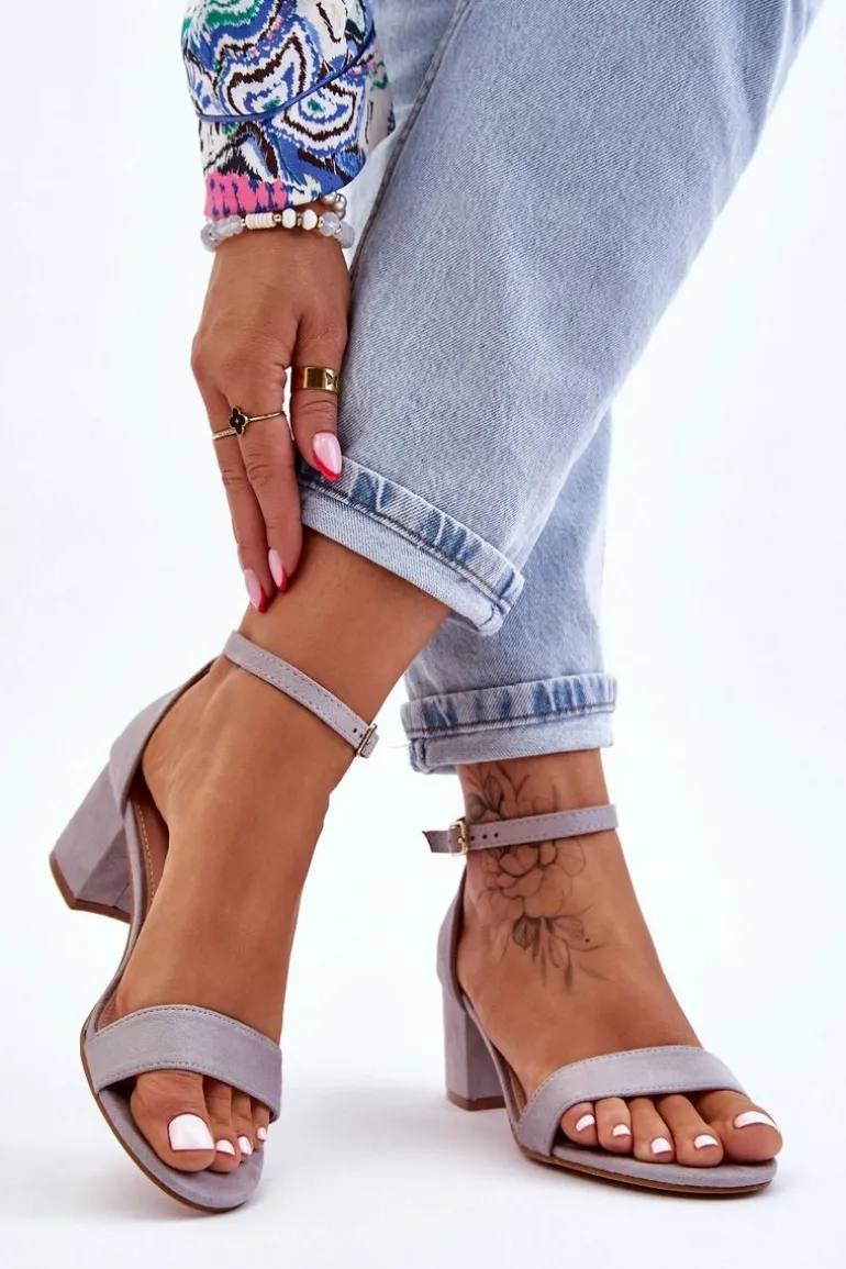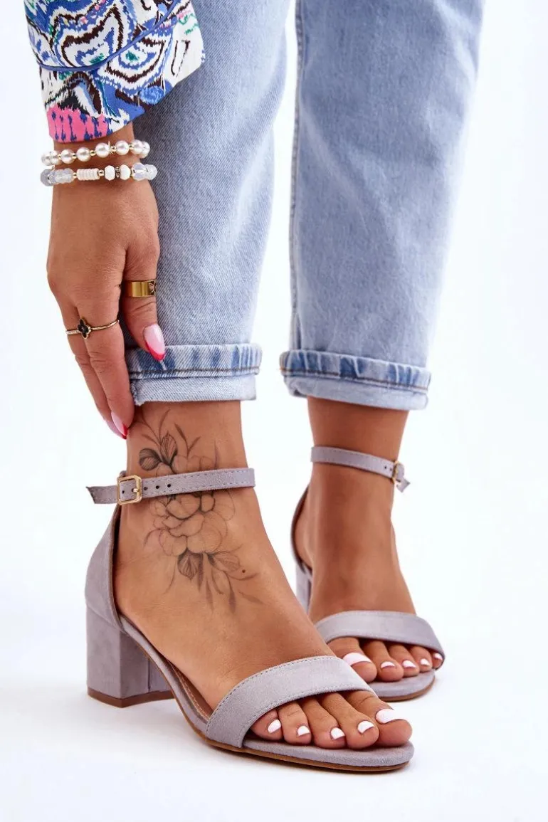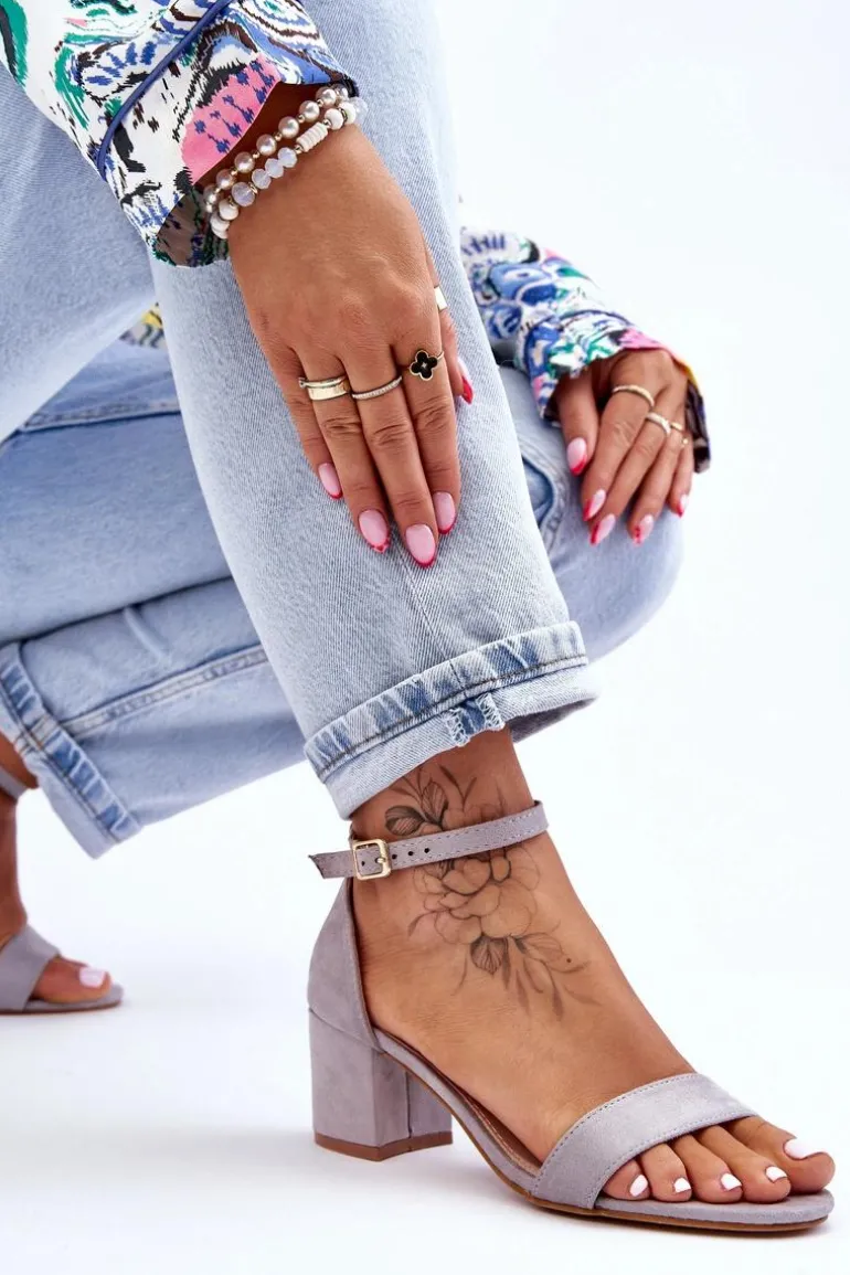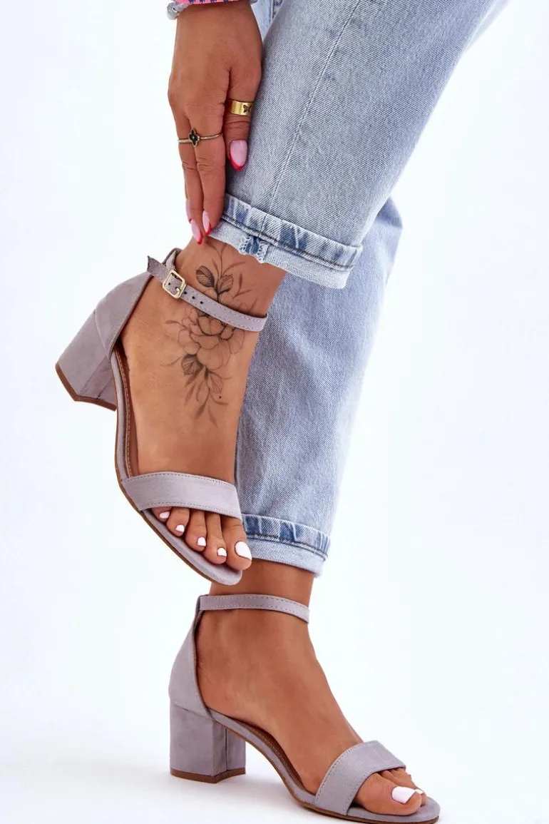 Wyjątkowe sandałki na niewysokim obcasie w postaci stabilnego słupka. Wykonane z przyjemnego w dotyku eko zamszu. Sandałki te posiadają usztywniany zapiętek. Wkładka wykonana z eko skóry zapewni komfortowe użytkowanie. Nosek odkryty, zaokrąglony. Zapinane wokół kostki na regulowany pasek ze sprzączką. Na pewno wykorzystasz je w wielu sytuacjach! Przy wyborze rozmiaru prosimy sugerować się tabelą rozmiarów.
