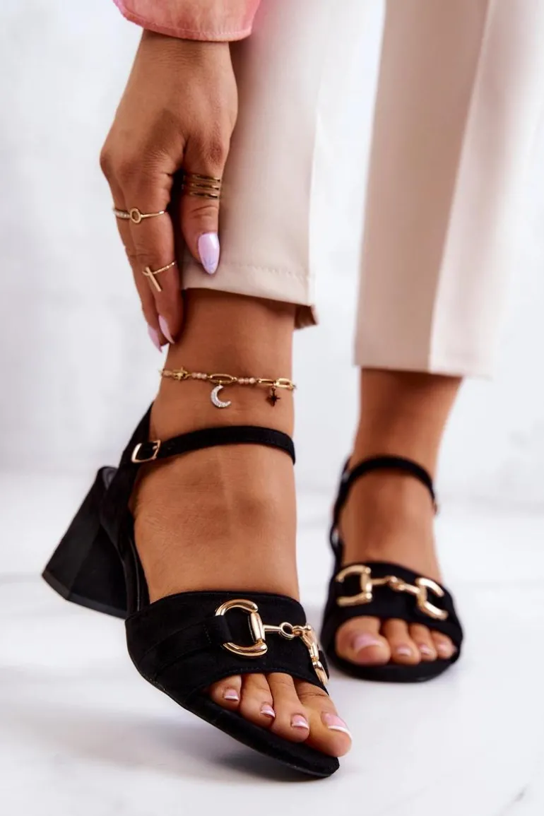 Eleganckie sandały na obcasie w postaci słupka. Wykonane z eko zamszu. Posiadają ozdobny element na przodzie obuwia. Nosek odkryty, zaokrąglony. Zapinane wokół kostki na sprzączkę z regulowanym paskiem. Miękka wkładka Comfort Shoes z eko skóry oraz wygodny obcas zapewnią komfort. Podeszwa wykonana z tworzywa sztucznego. Idealne na upalne dni zarówno do sukienek, spódniczek, a także eleganckich spodni. Świetnie sprawdzą się na spotkania biznesowe, uroczystości rodzinne czy romantyczny spacer. Przy wyborze rozmiaru prosimy sugerować się tabelą rozmiarów.