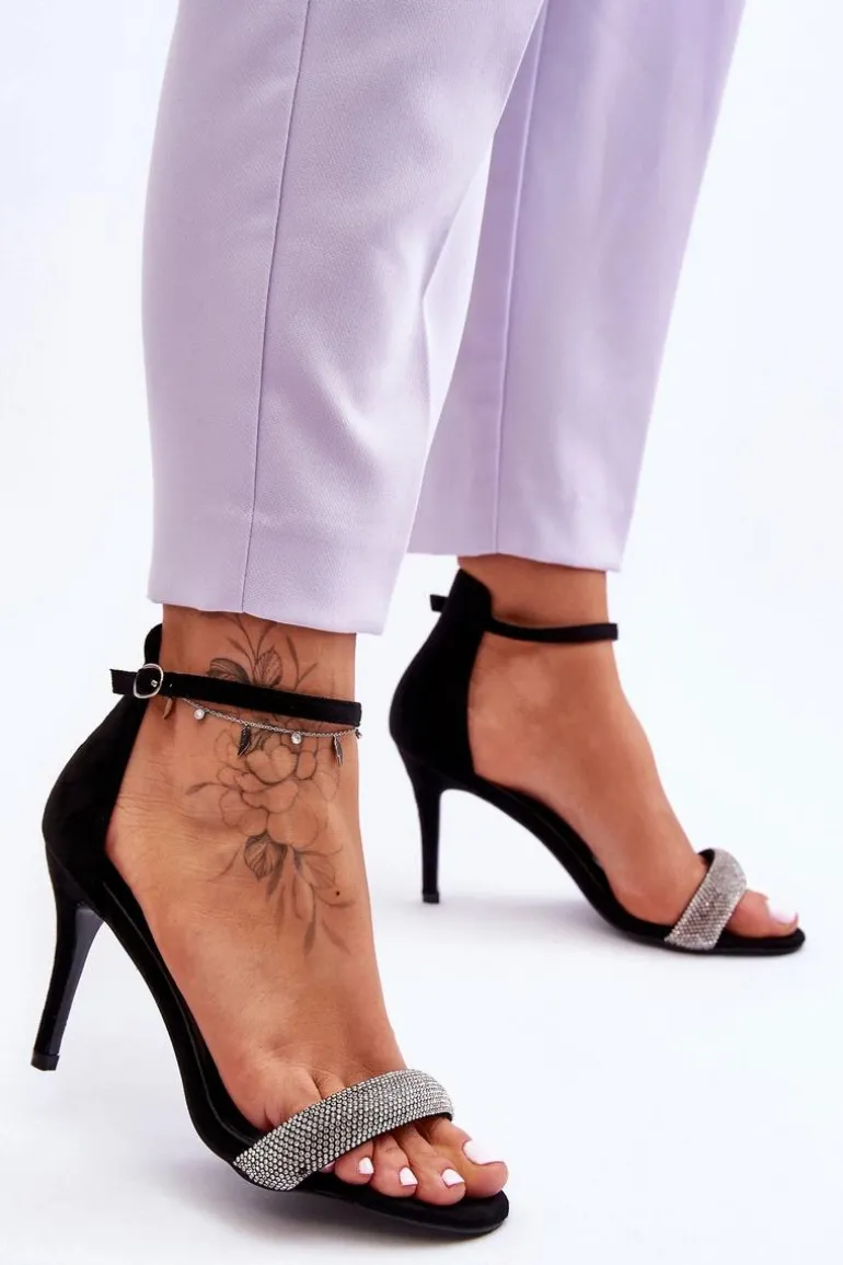 Klasyczne sandały zostały wykonane z eko zamszu. Osadzono je na obcasie w postaci szpilki. Sandałki posiadają usztywniany zapiętek. Dodatkowo paseczek z przodu został ozdobiony dżetami imitującymi cyrkonie. Model z odkrytym, zaokrąglonym noskiem. Sandały są zapinane wokół kostki na regulowany pasek ze sprzączką. Przy wyborze rozmiaru prosimy sugerować się tabelą rozmiarów.