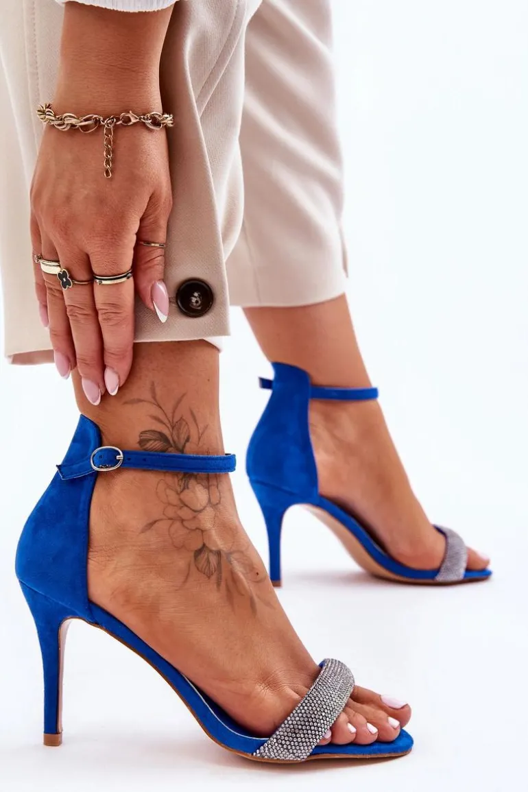 Klasyczne sandały zostały wykonane z eko zamszu. Osadzono je na obcasie w postaci szpilki. Sandałki posiadają usztywniany zapiętek. Dodatkowo paseczek z przodu został ozdobiony dżetami imitującymi cyrkonie. Model z odkrytym, zaokrąglonym noskiem. Sandały są zapinane wokół kostki na regulowany pasek ze sprzączką. Przy wyborze rozmiaru prosimy sugerować się tabelą rozmiarów.