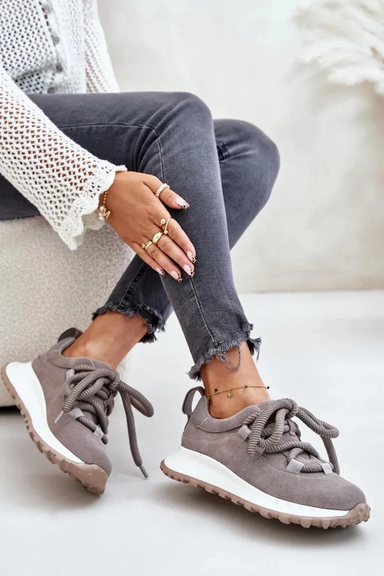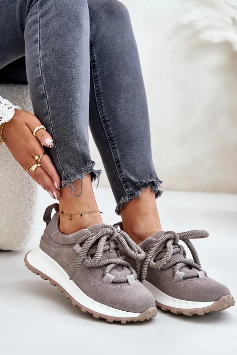 Damskie sneakersy wykonane z naturalnego zamszu. Osadzone na platformie, która nie tylko dodaje lekkości krokowi, ale także podnosi sylwetkę o kilka centymetrów. Charakterystyczne dla tego modelu jest grube sznurowanie, które przyciąga wzrok i nadaje unikalny wygląd. Idealnie sprawdzą się w codziennych stylizacjach. Wybierz te sneakersy, aby wyróżnić się w tłumie i cieszyć się komfortem na każdym kroku. Przy wyborze rozmiaru prosimy kierować tabelą rozmiarów.