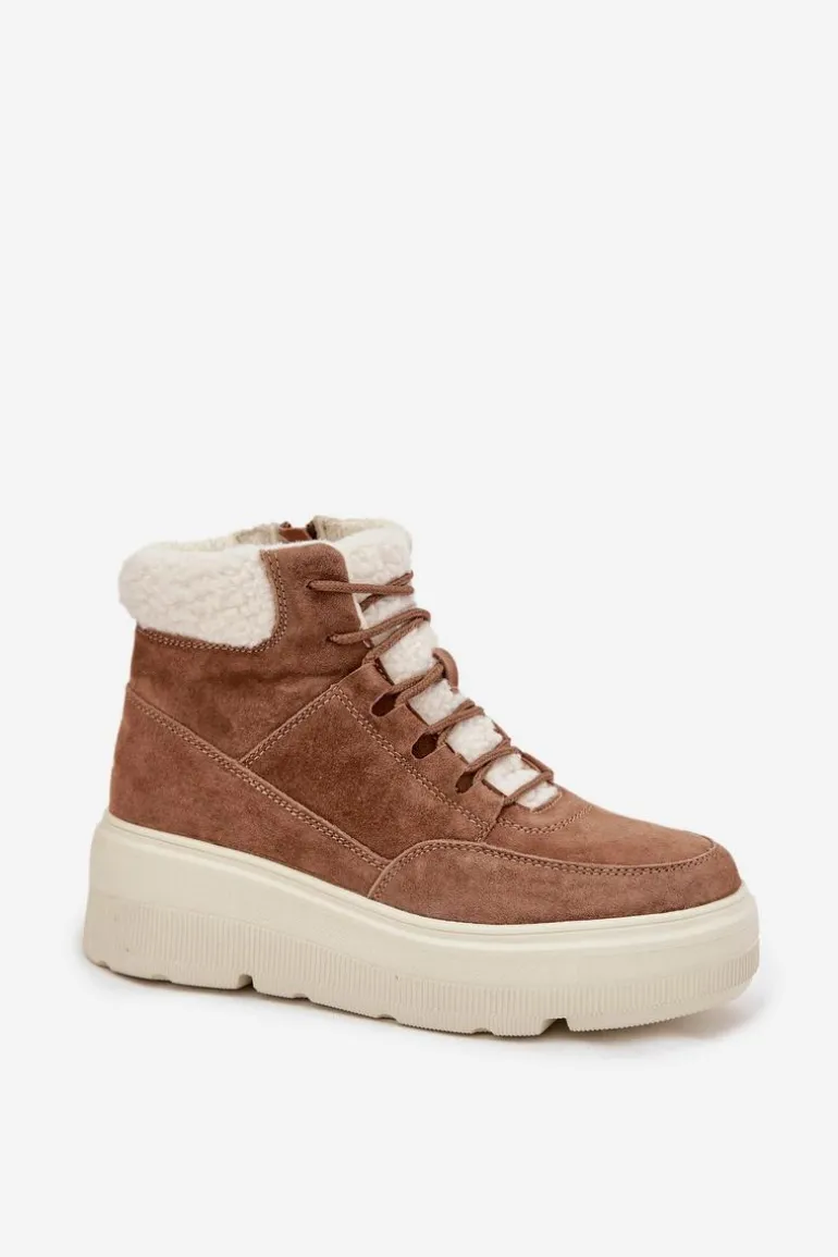 Śniegowce damskie od marki Vinceza to idealny wybór na zimowe dni! Wykonane z naturalnego zamszu, osadzone na masywnej platformie, która skutecznie izoluje stopę od zimnego podłoża. Model jest sznurowany i zapinany na zamek, co pozwala na idealne dopasowanie, a wnętrze ocieplone gwarantuje ciepło i komfort. Dodatkowe ozdobne wykończenie kożuszkiem dodaje przytulnego, modnego charakteru. Przy wyborze rozmiaru prosimy sugerować się tabelą rozmiarów.