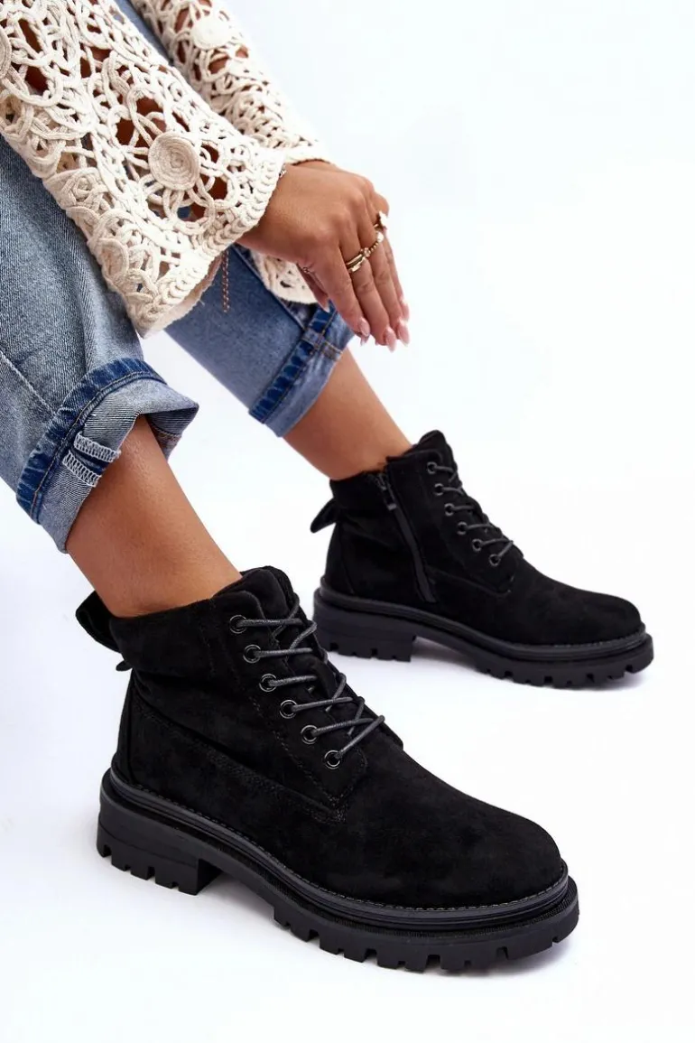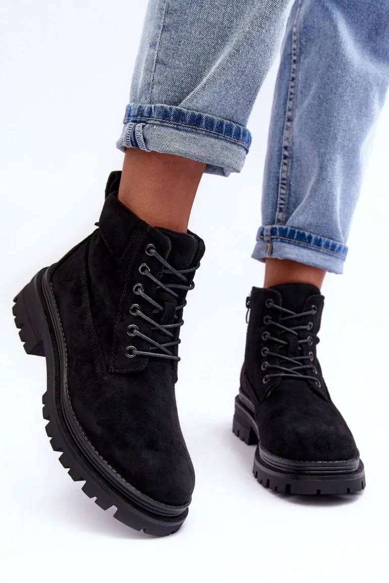 Trapery damskie wykonane z eko zamszu. Osadzone na płaskim, stabilnym obcasie i platformie. Wewnątrz znajduje się ciepłe i miłe w dotyku futerko. Zapinane na suwak oraz dodatkowo posiadają sznurowanie. Zapiętek usztywniony. Buty idealnie sprawdzą się w zimowe dni! Przy wyborze rozmiaru prosimy sugerować się tabelą rozmiarów.