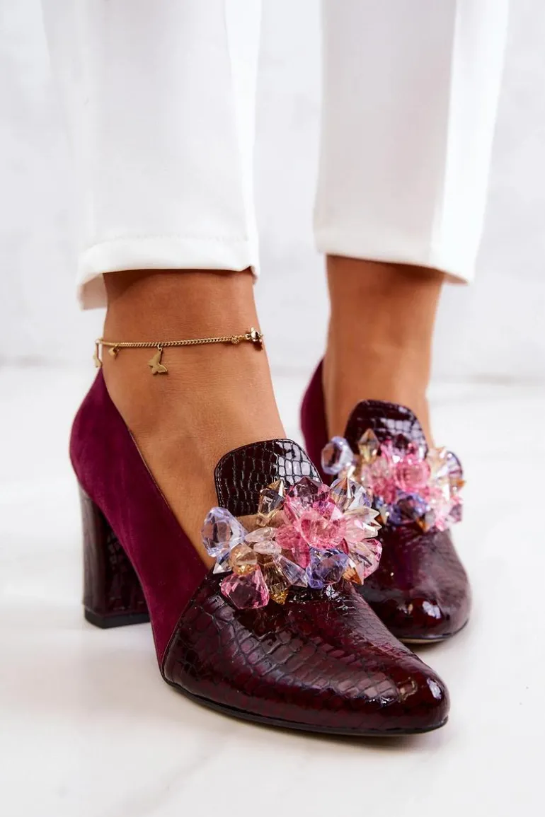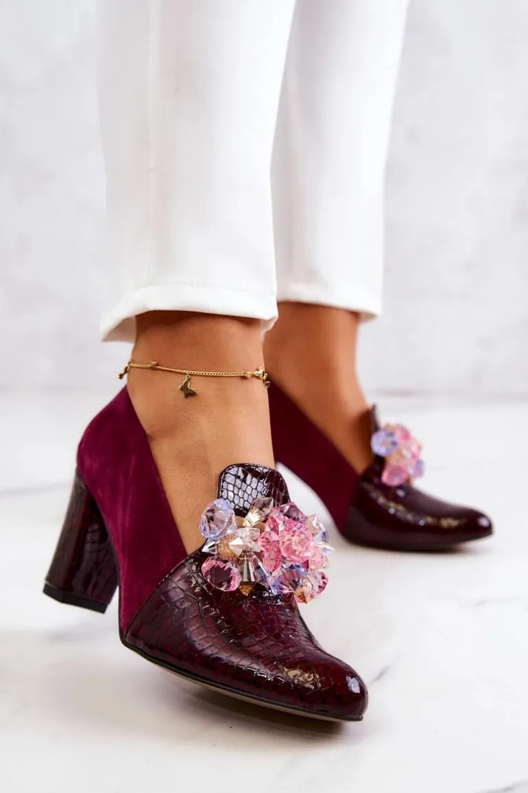 Zamszowe Wężowe Czółenka Z Ozdobą Bordowe Mallory