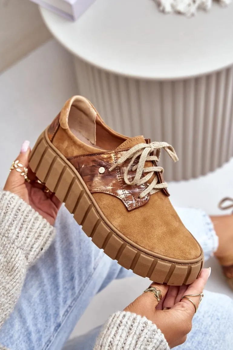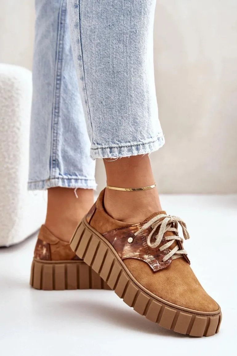 Półbuty posiadają wiązanie na płaskie, ozdobione błyszczącą nicią sznurowadła. Osadzone na masywnej platformie ze żłobieniami po bokach. Wewnątrz wygodna wkładka z naturalnej skóry, która jest dodatkowo profilowana. Cholewka przed kostkę została wykonana z naturalnego zamszu z efektem metalicznym. Bardzo lekkie i komfortowe w użytkowaniu. Idealne do eleganckich spodni, tiulowych spódnic czy dzianinowych sukienek. Możesz je łączyć z różnymi stylizacjami – zawsze będą wyglądać świetnie! Te cudne buty zdecydowanie muszą znaleźć się w Twojej garderobie! Przy wyborze rozmiaru prosimy sugerować się tabelą rozmiarów.