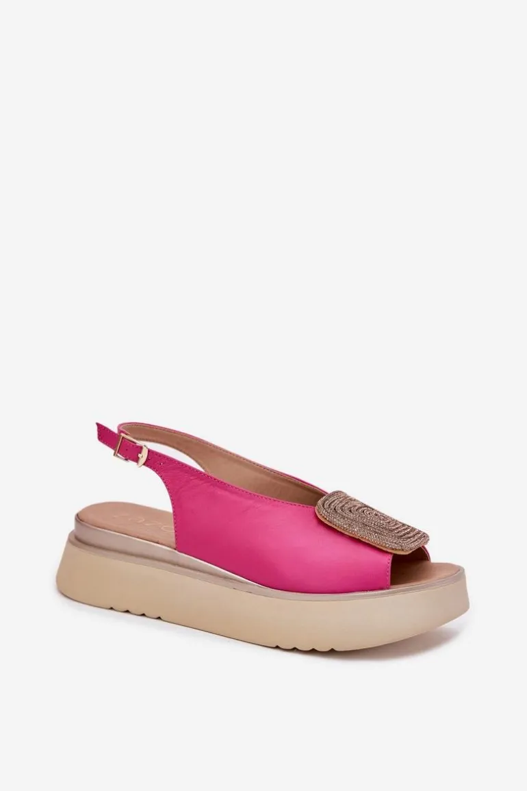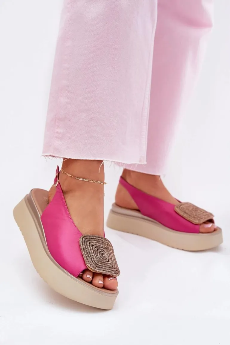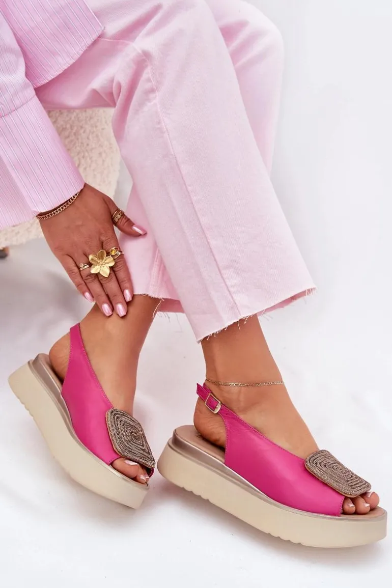 Sandały damskie z naturalnej skóry to połączenie klasyki i wygody. Osadzone na platformie, zapewniają stabilność i komfort podczas noszenia. Ozdoba z przodu dodaje blasku, podkreślając ich wyjątkowy wygląd. Zapinane na regulowany pasek ze sprzączką gwarantują idealne dopasowanie do stopy. Te sandały są nie tylko stylowe, ale także praktyczne i funkcjonalne – idealne na różne okazje. Przy wyborze rozmiaru prosimy kierować się tabelą rozmiarów.