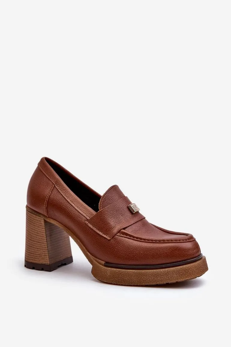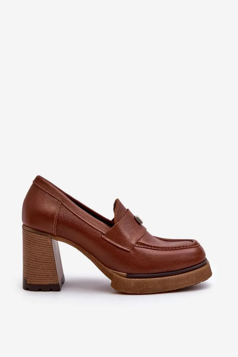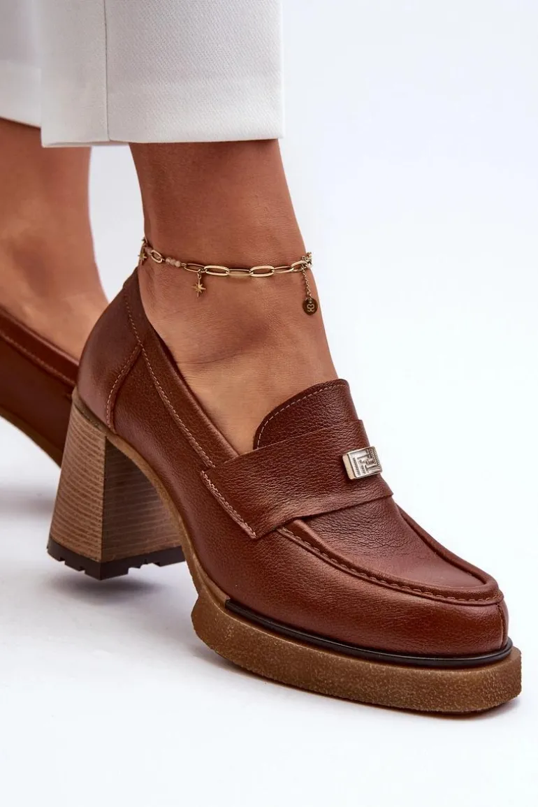 Damskie półbuty na obcasie w postaci słupka z delikatną platformą. Wykonane ze skóry naturalnej. Model ten posiada zaokrąglone noski. Podeszwa wykonana z gumowego tworzywa. Usztywniony zapiętek dodatkowo stabilizuje stopę. Na przodzie pasek z małą ozdobą. Idealne do wiosennych stylizacji! Koniecznie powinnaś je mieć! Przy wyborze rozmiaru prosimy sugerować się tabelą rozmiarów.