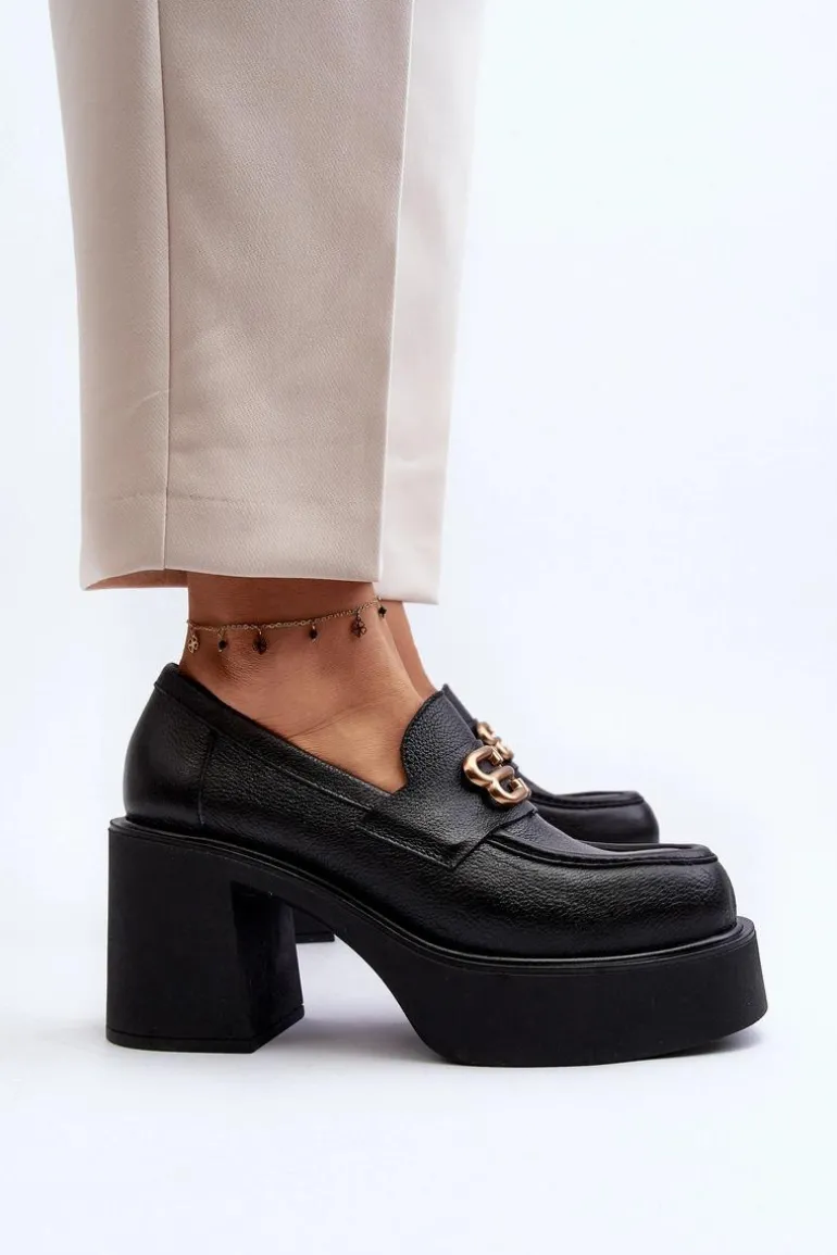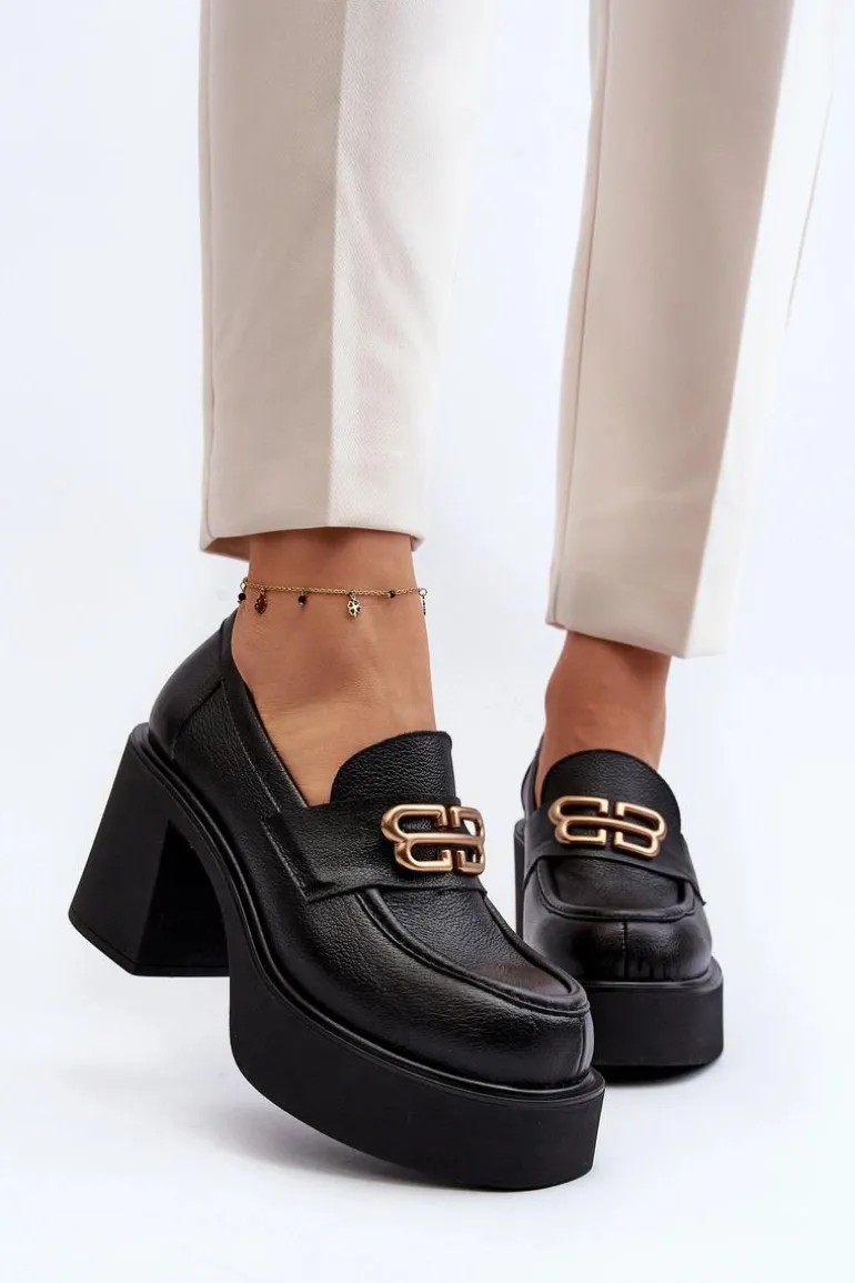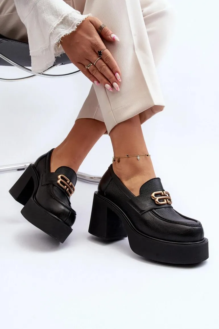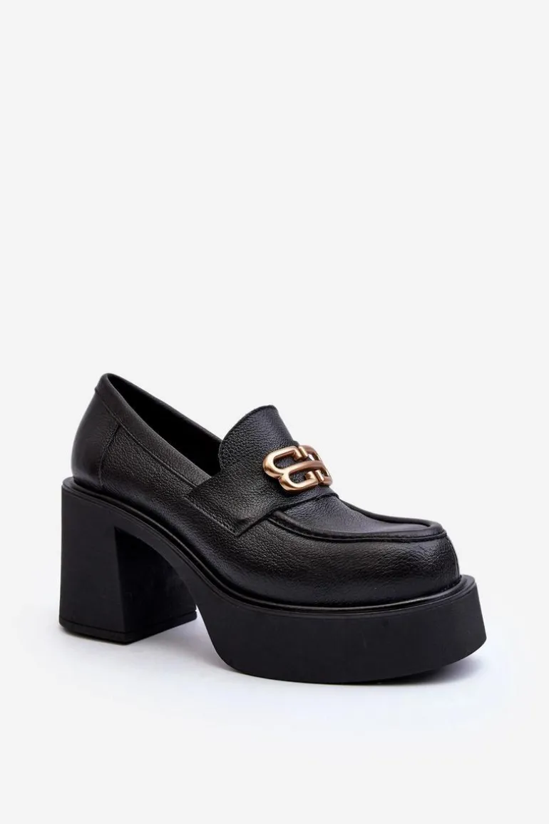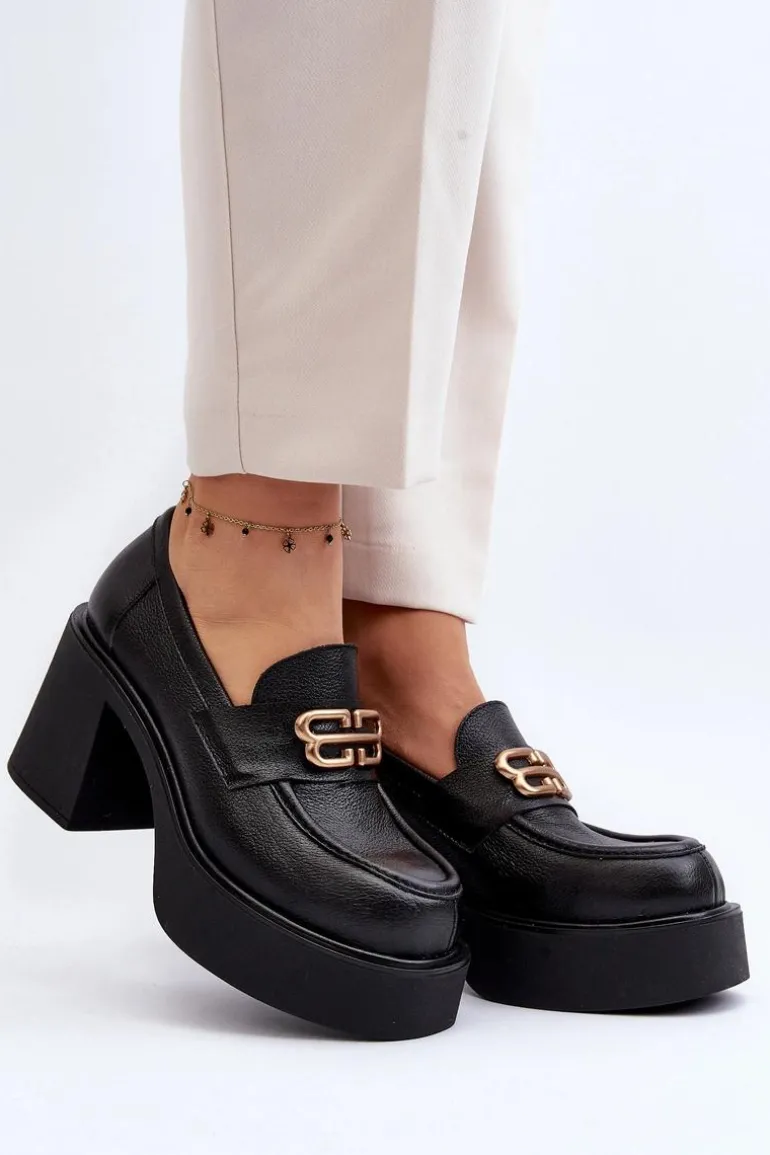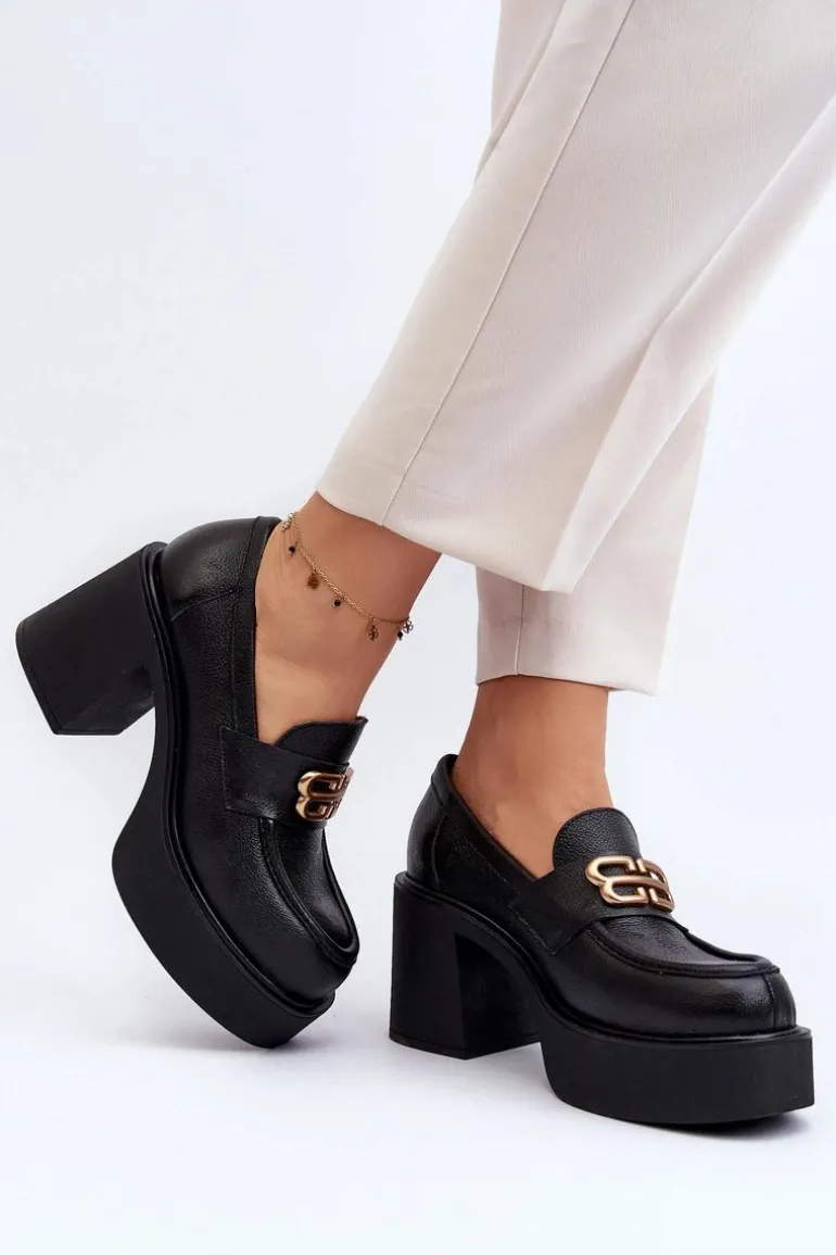 Damskie półbuty na obcasie z cholewką wykonaną ze skóry naturalnej. Osadzone na grubej podeszwie oraz obcasie w postaci masywnego słupka. Model ten posiada zaokrąglone noski. Skórzana wkładka zapewni wygodę podczas użytkowania. Z przodu pasek oraz ozdoba. Przy wyborze rozmiaru prosimy sugerować się tabelą rozmiarów.