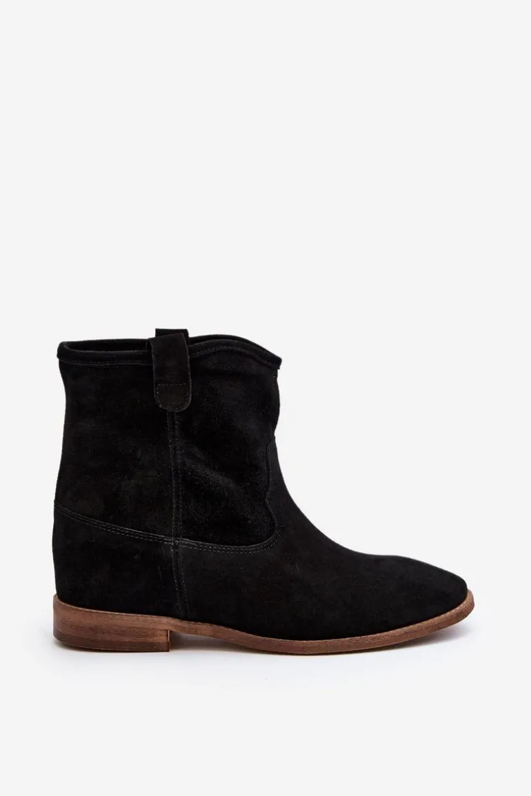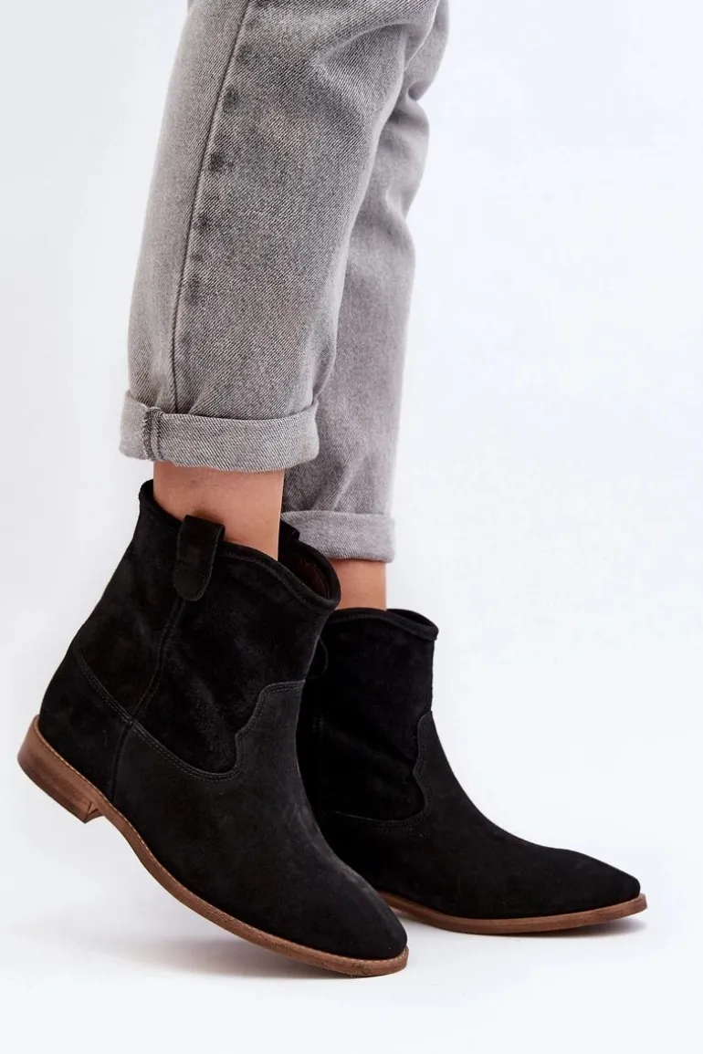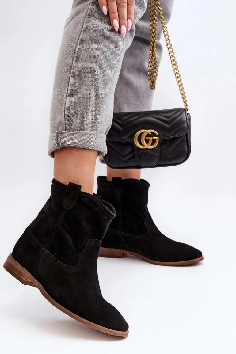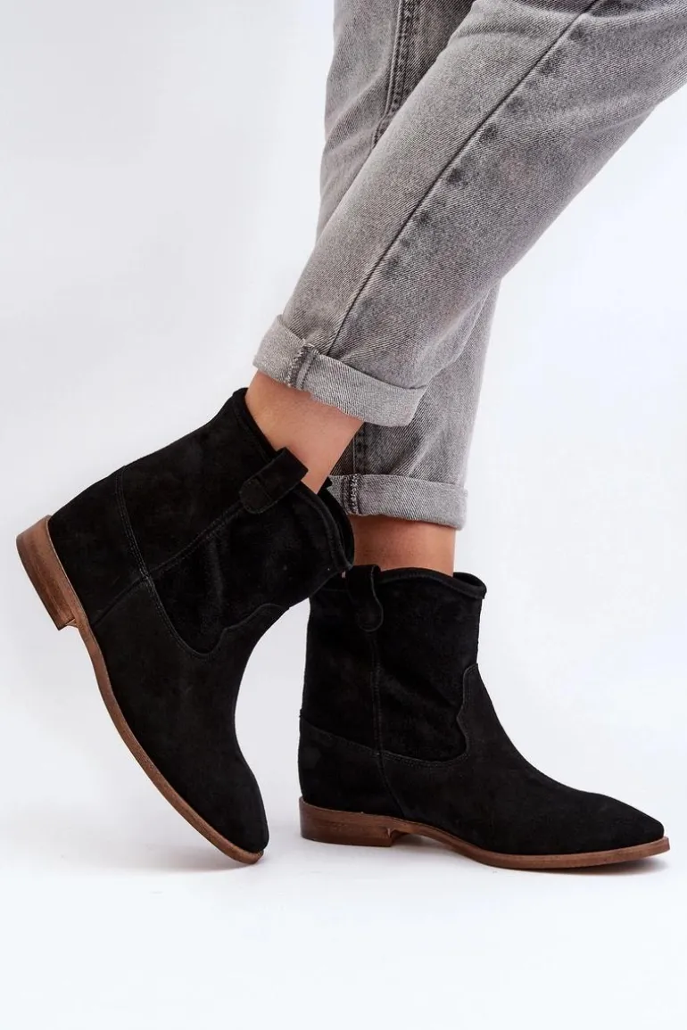 Botki damskie wykonane z naturalnego zamszu. Osadzone na płaskim obcasie z ukrytym koturnem. Noski zaokrąglone. Wkładka z naturalnej skóry zapewni komfort podczas użytkowania. Ten klasyczny model dopasujesz do wielu stylizacji! Przy wyborze rozmiaru prosimy kierować się tabelą rozmiarów