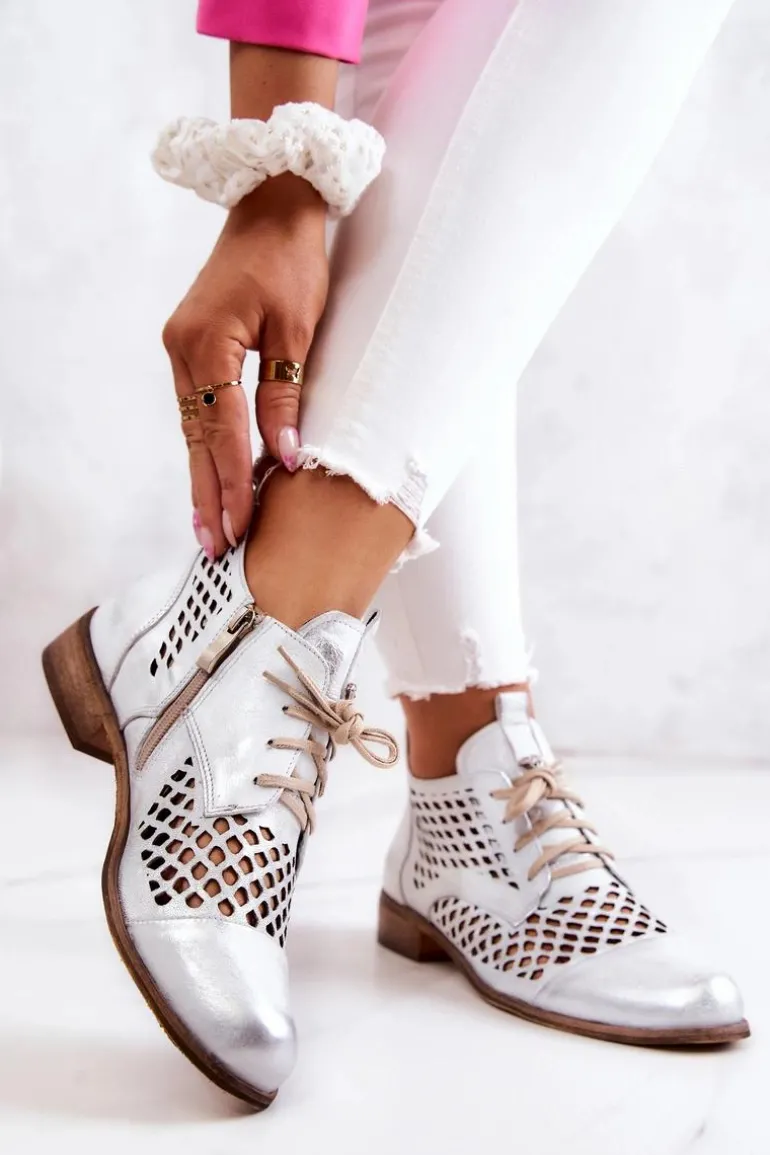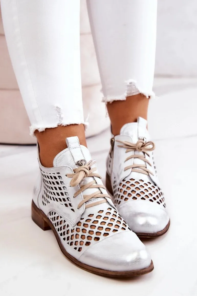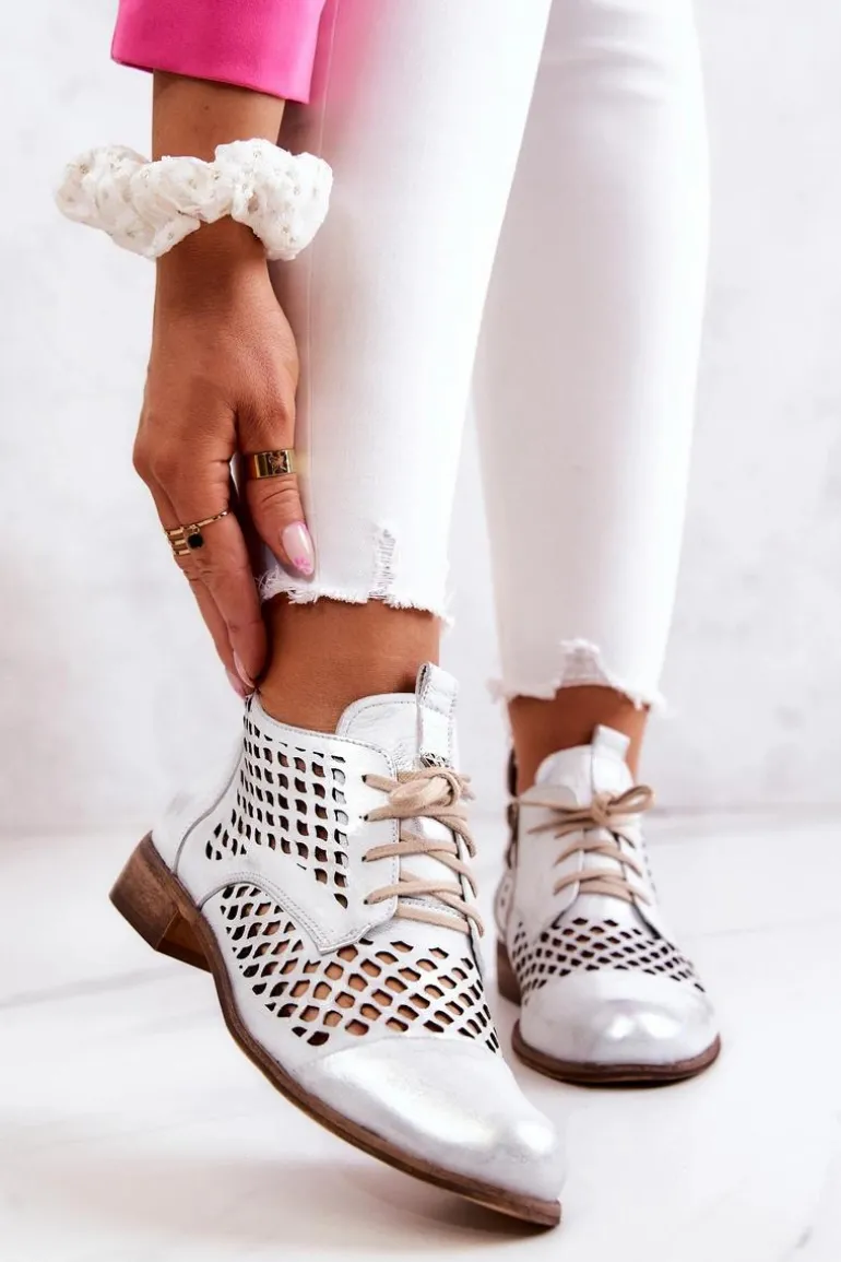 Zazoo 2704 Skórzane Ażurowe Botki Biało-Srebrne