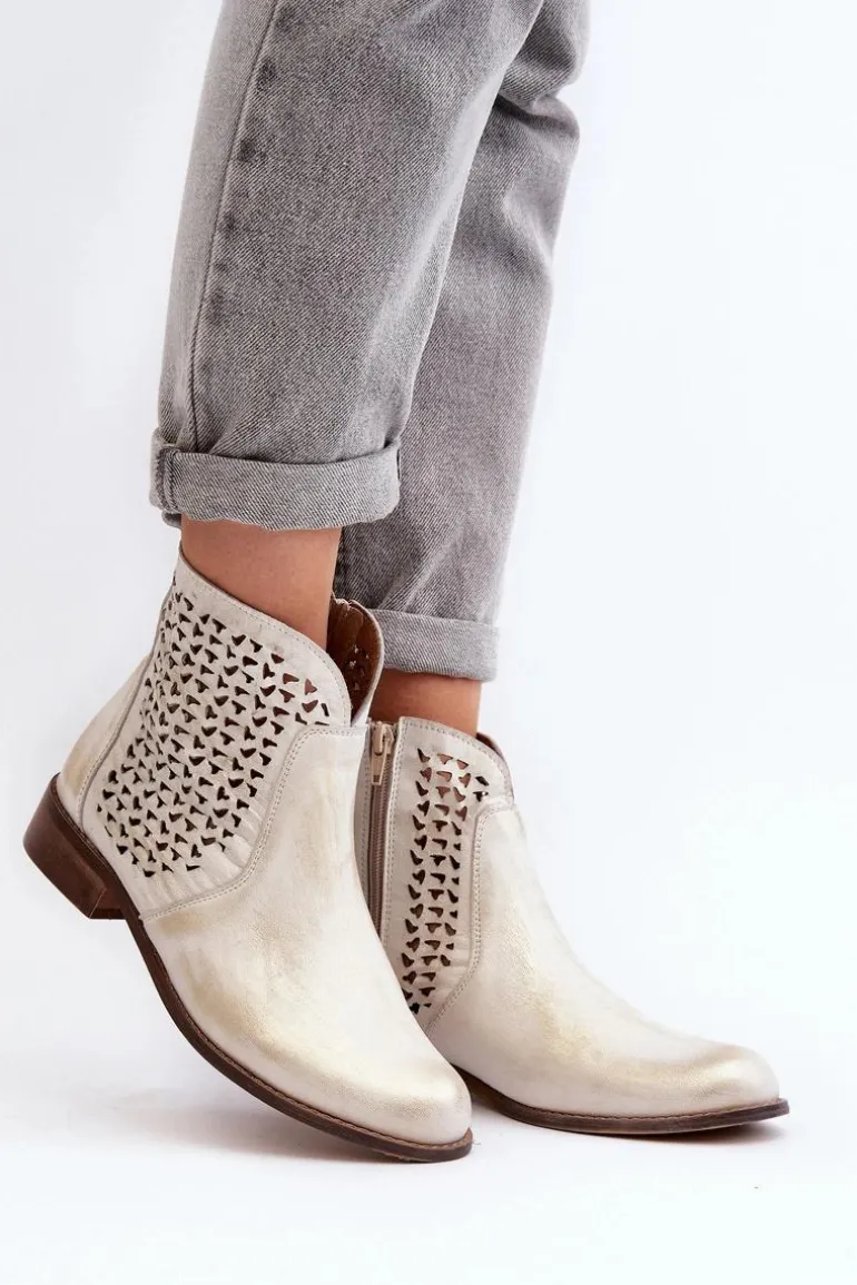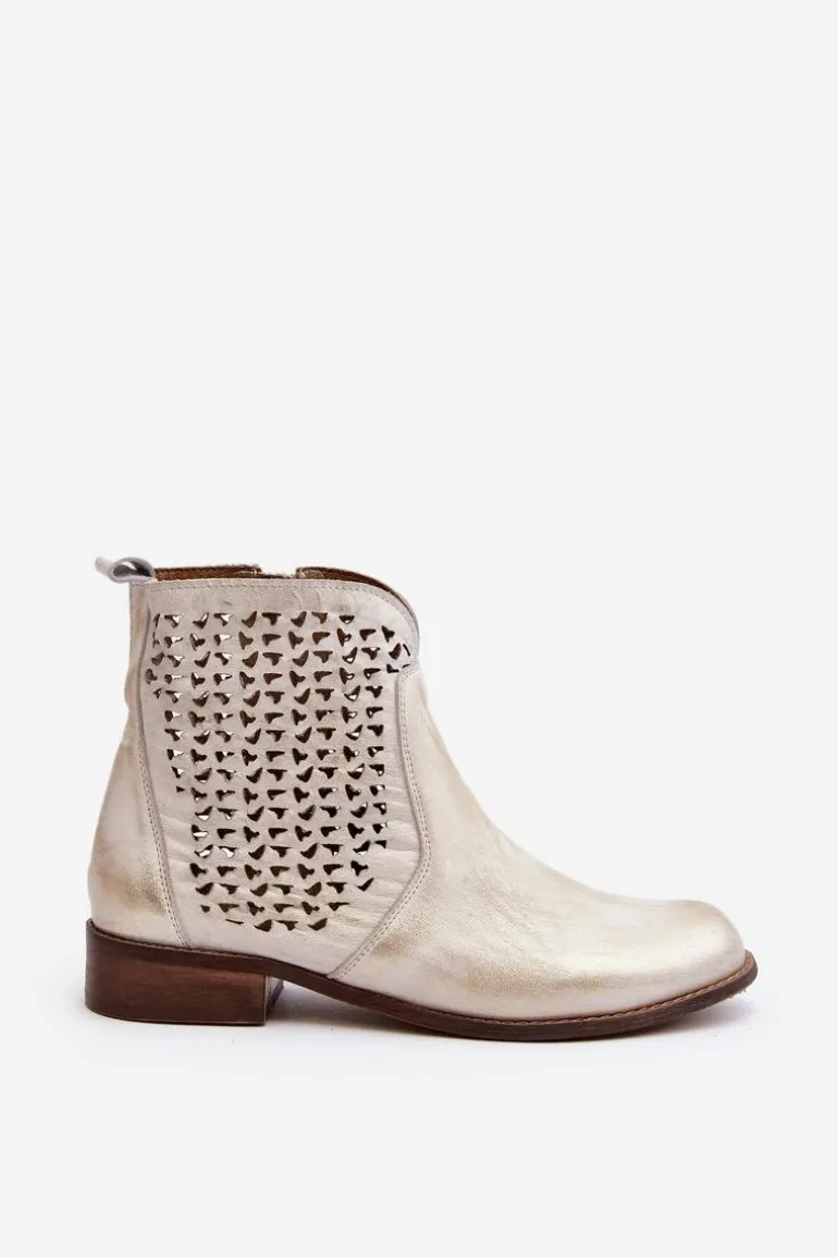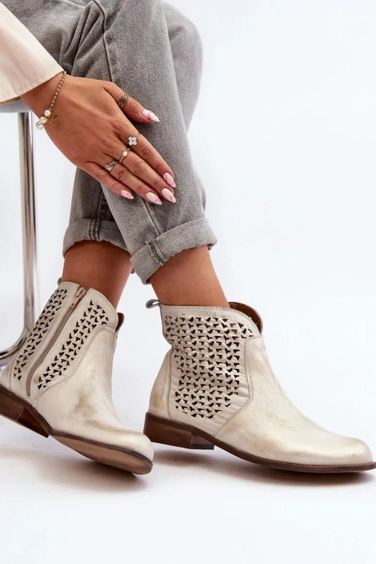Botki zostały wykonane ze skóry naturalnej. Zakładanie ułatwi wszyty na boku suwak. Botki posiadają ażurowy wzorek. Posiadają płaski obcas oraz wygodną, wykonaną z naturalnej skóry wkładkę. Ten niezwykle komfortowy model powinien znaleźć się w Twojej szafie! Przy wyborze rozmiaru prosimy sugerować się tabelą rozmiarów.