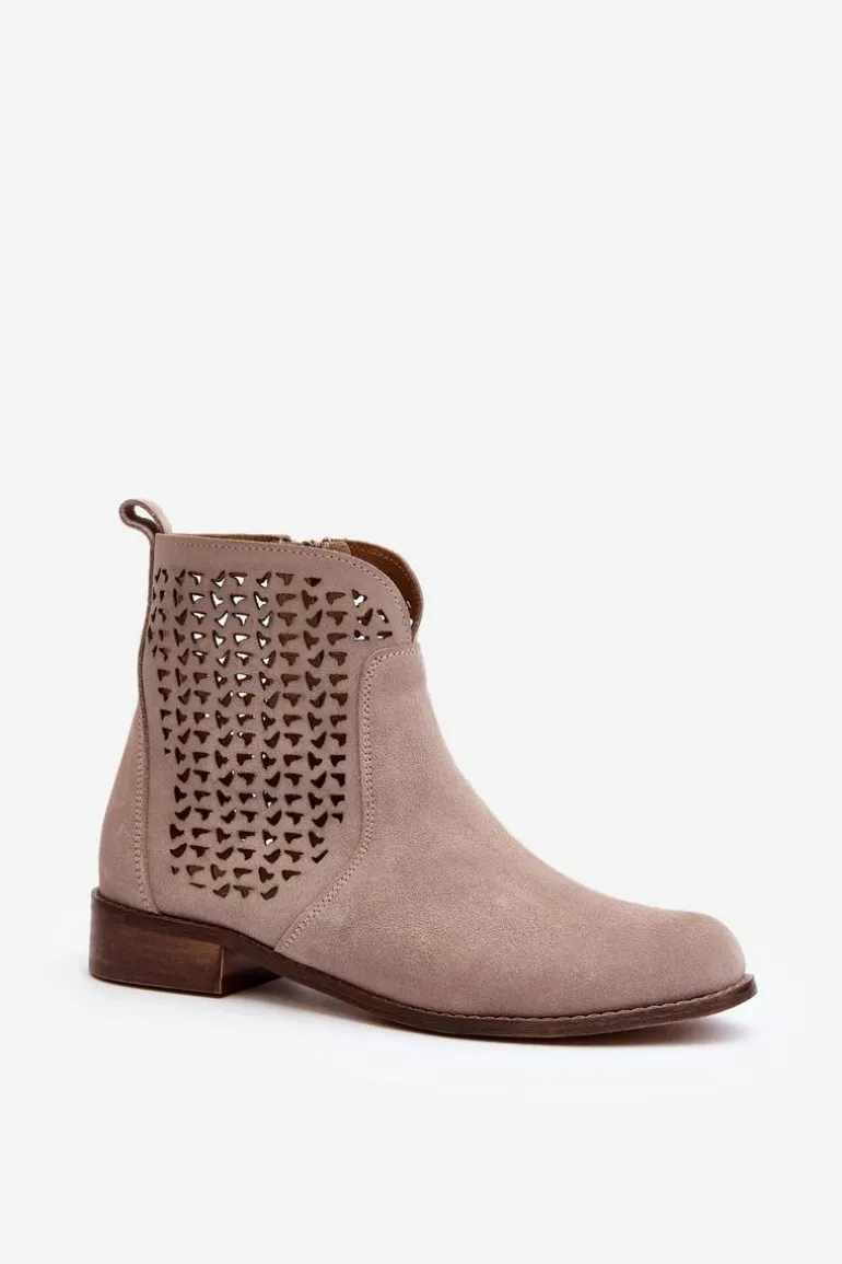 Botki zostały wykonane z naturalnego zamszu. Zakładanie ułatwi wszyty na boku suwak. Botki posiadają ażurowy wzorek. Posiadają płaski obcas oraz wygodną, wykonaną z naturalnej skóry wkładkę. Ten niezwykle komfortowy model powinien znaleźć się w Twojej szafie! Przy wyborze rozmiaru prosimy sugerować się tabelą rozmiarów.