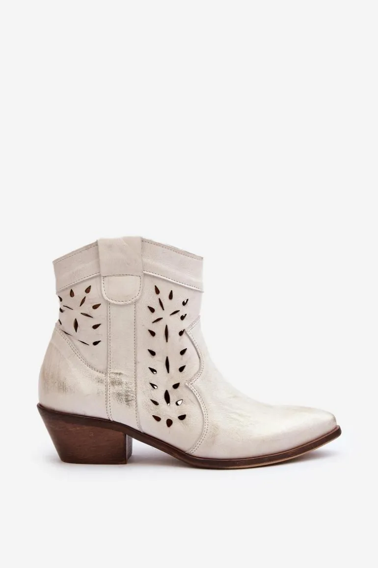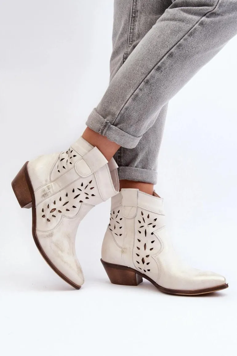 Damskie botki w stylu kowbojek zostały wykonane ze skóry naturalnej. Osadzone na niskim obcasie, który gwarantuje stabilność na każdym kroku. Noski w szpic optycznie wysmuklą nogi. Model wsuwany. Cholewka za kostkę. Przy wyborze rozmiaru prosimy sugerować się tabelą rozmiarów.