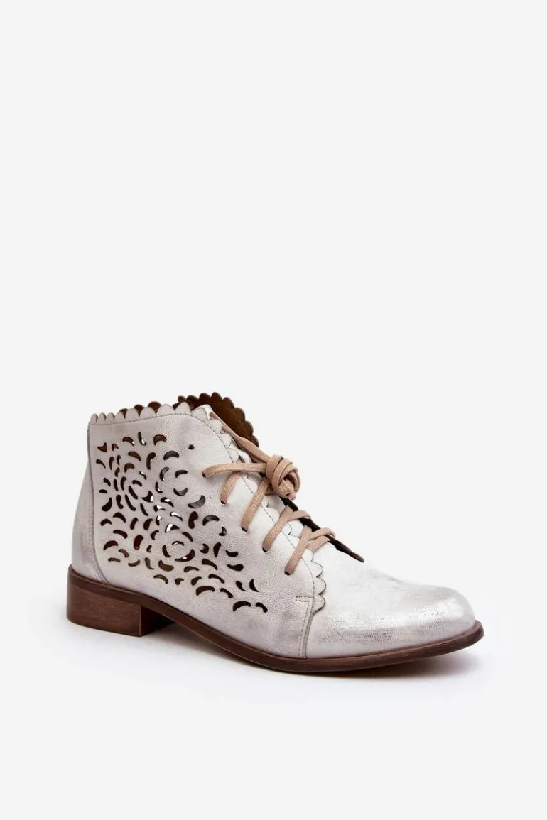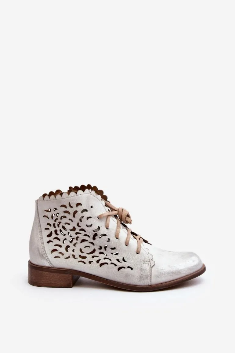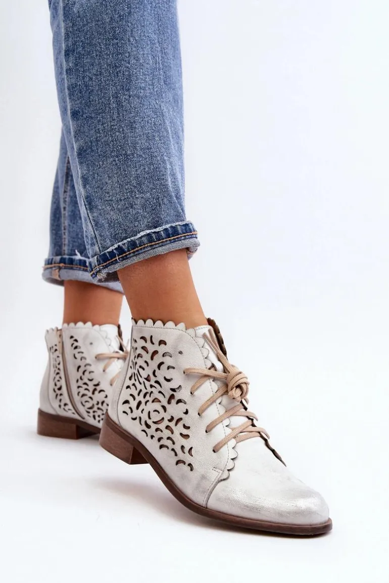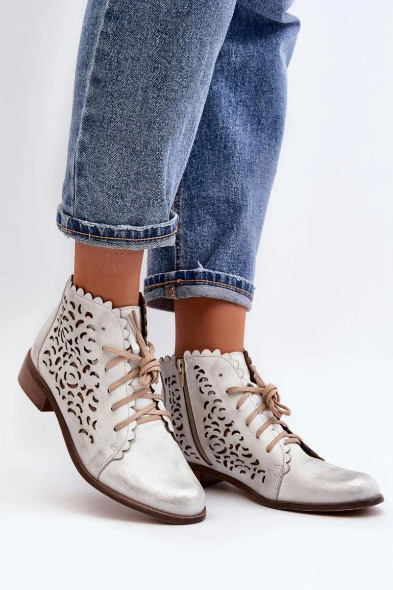 Botki damskie zostały wykonane z wysokiej jakości skóry naturalnej. Osadzone na płaskim obcasie. Cholewka za kostkę. Noski zaokrąglone. Wkładka z naturalnej skóry zapewni komfort podczas użytkowania. Model zapinany na suwak oraz dodatkowo posiada sznurowanie. Idealne do spodni, spódnic i sukienek. Koniecznie powinnaś je mieć! Przy wyborze rozmiaru prosimy sugerować się tabelą rozmiarów.