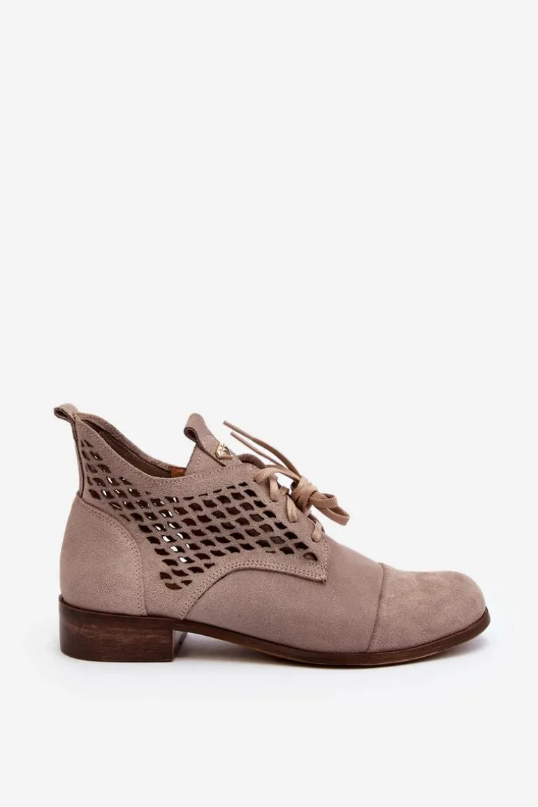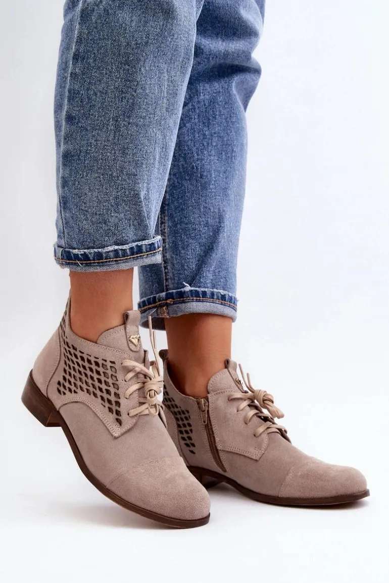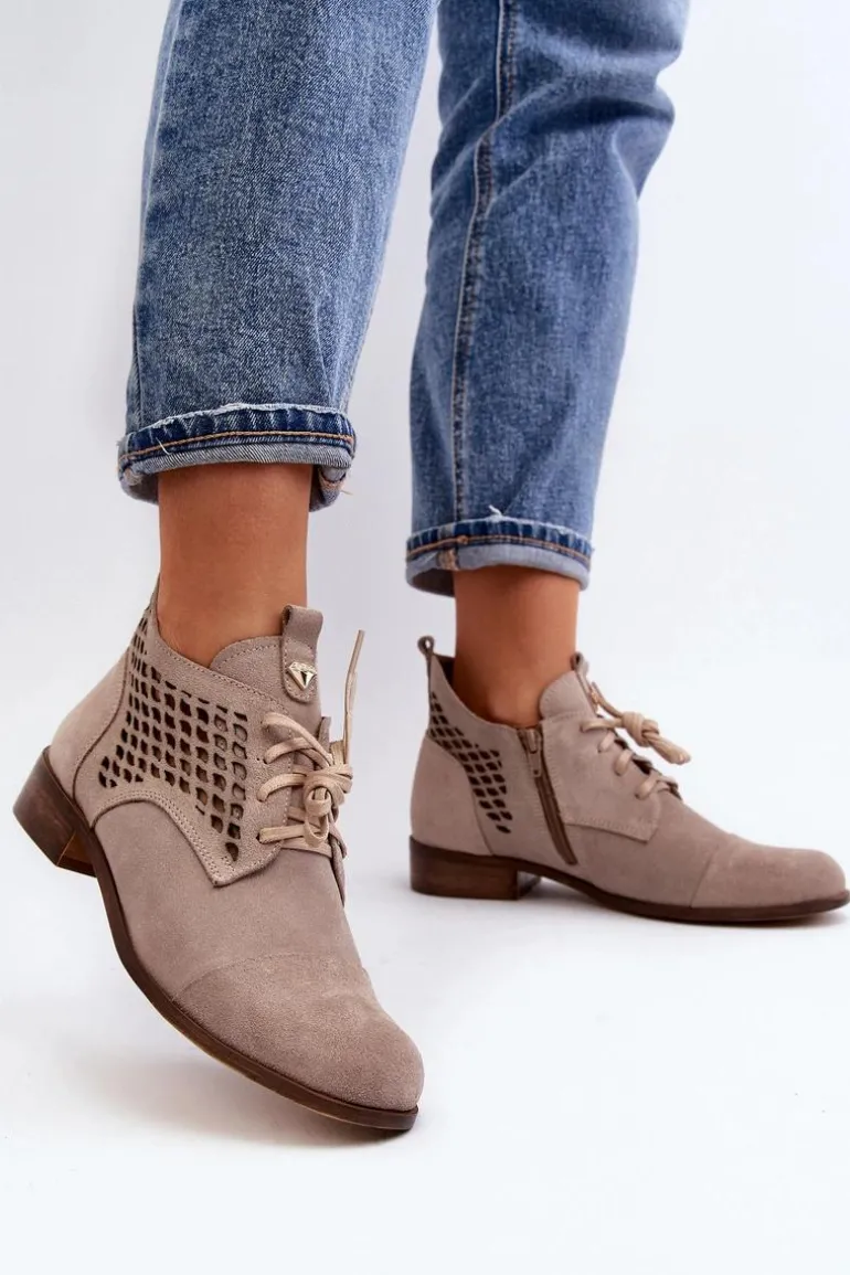 Zazoo 2878 Niskie Ażurowe Botki Damskie Zamszowe Beżowe