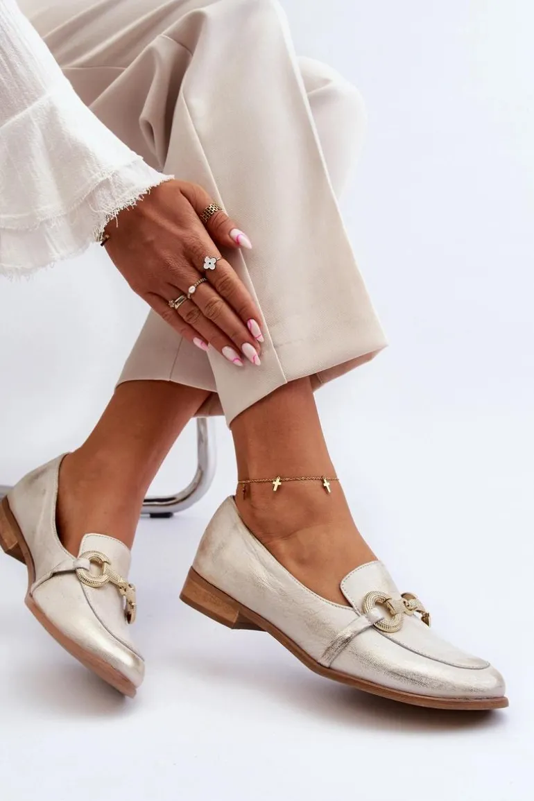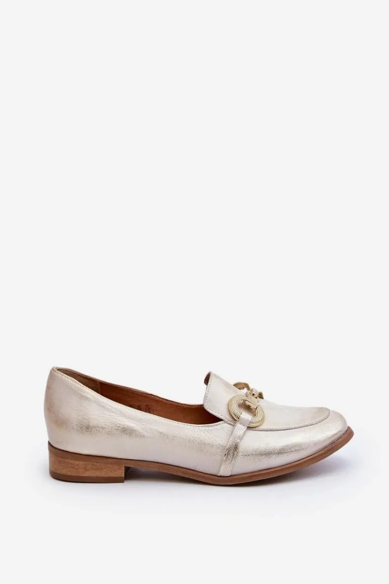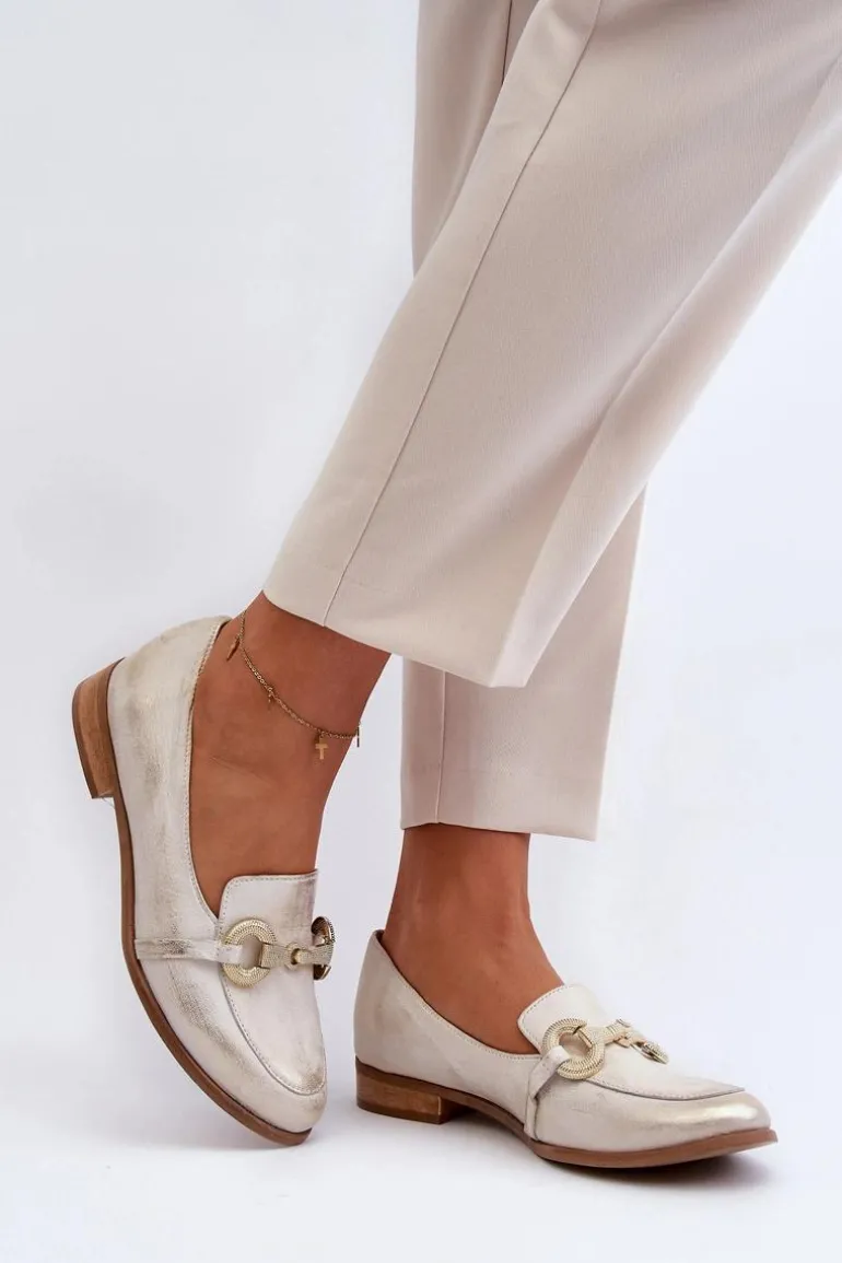 Eleganckie mokasyny damskie wykonane ze skóry naturalnej. Ten fason idealnie sprawdzi się w sezonie wiosenno-jesiennym. Noski zaokrąglone. Z przodu złota ozdoba. Usztywniony zapiętek. Wkładka ze skóry naturalnej zapewni komfort podczas noszenia. Ten model idealnie sprawdzi się zarówno w casualowych, jak i bardziej eleganckich outfitach! Przy wyborze rozmiaru prosimy sugerować się tabelą rozmiarów.