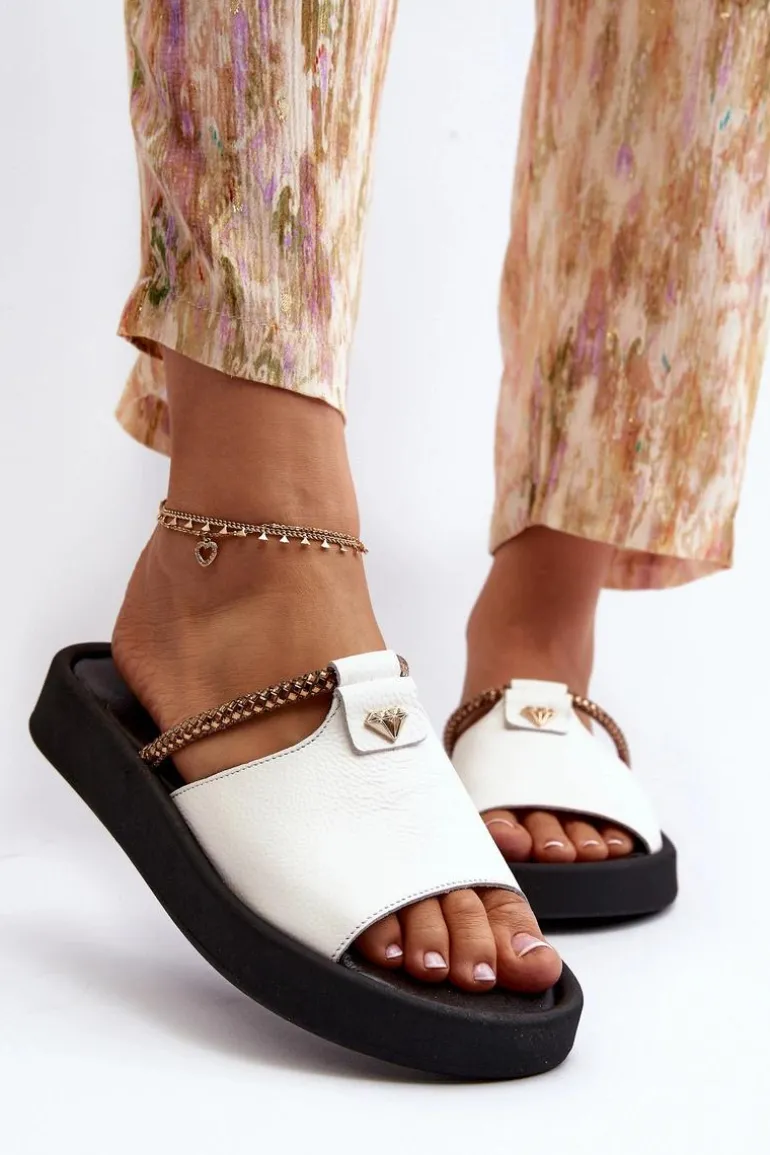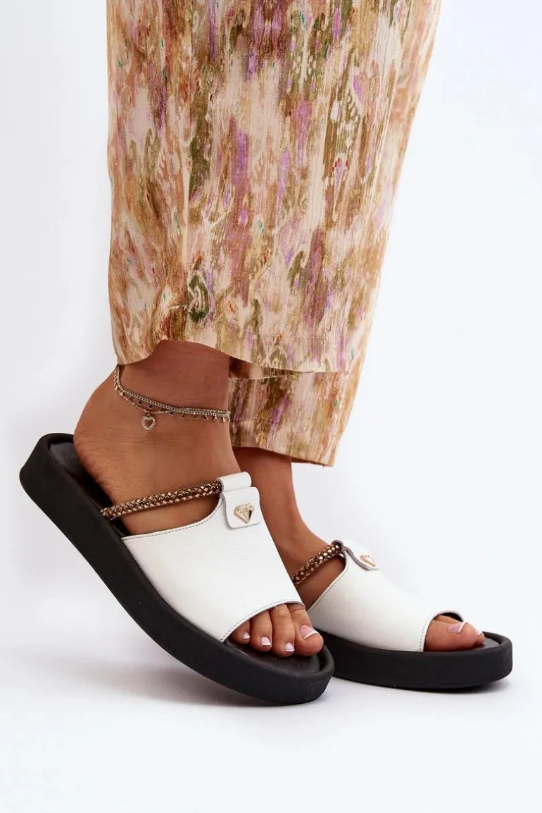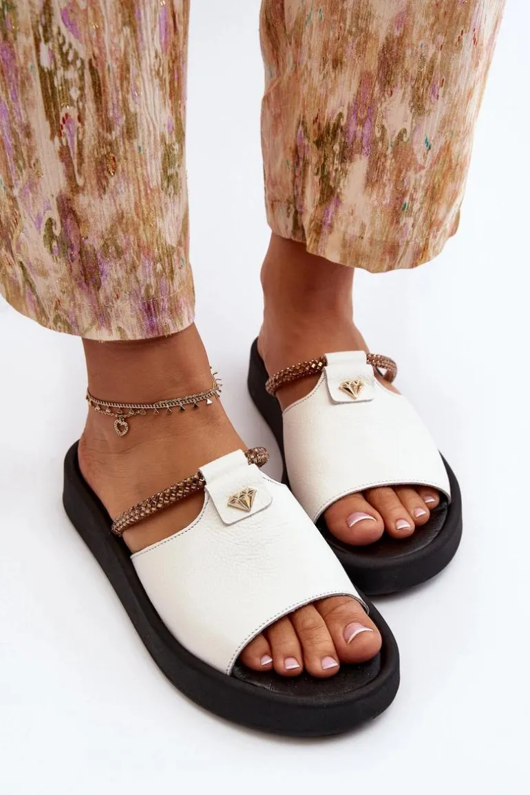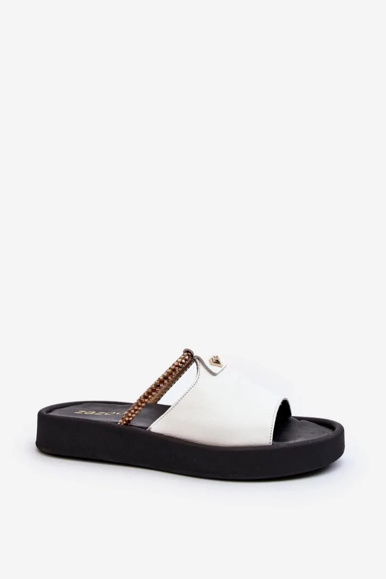 Wygodne klapki damskie wykonane ze skóry naturalnej. Osadzone na grubej podeszwie z gumowego tworzywa. Model ten posiada ozdobny paseczek z mieniącymi się dżetami. Miękka wkładka zapewni komfort nawet w upalne dni! Koniecznie sprawdź całą naszą kolekcję damskich klapek! Przy wyborze rozmiaru prosimy sugerować się tabelą rozmiarów.
