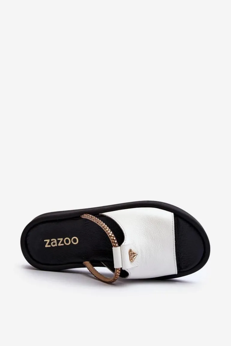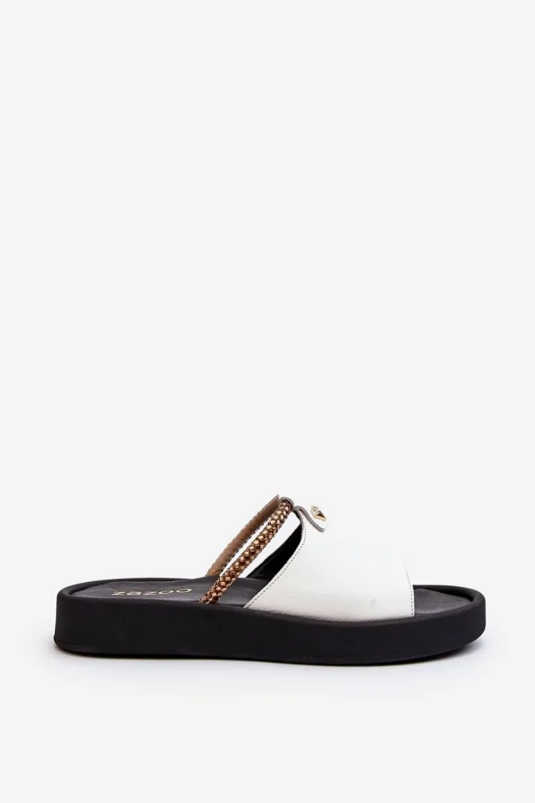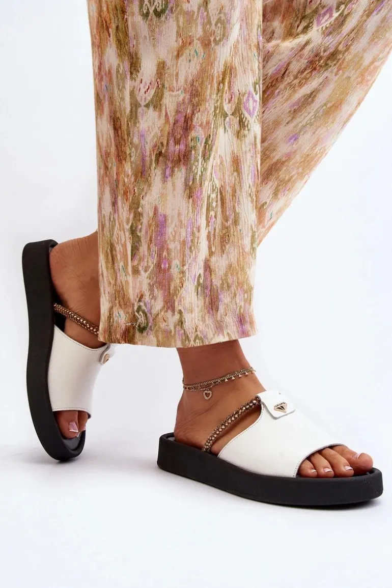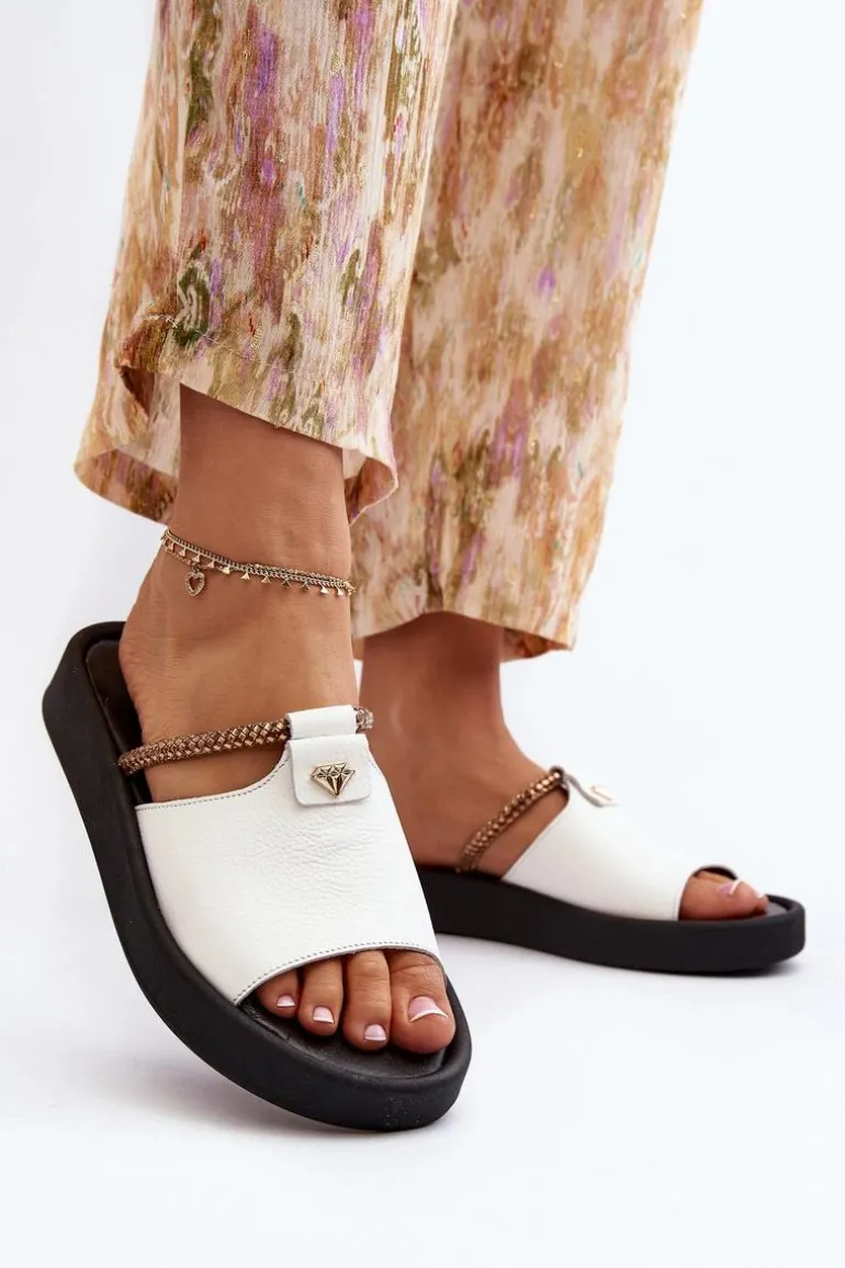 Wygodne klapki damskie wykonane ze skóry naturalnej. Osadzone na grubej podeszwie z gumowego tworzywa. Model ten posiada ozdobny paseczek z mieniącymi się dżetami. Miękka wkładka zapewni komfort nawet w upalne dni! Koniecznie sprawdź całą naszą kolekcję damskich klapek! Przy wyborze rozmiaru prosimy sugerować się tabelą rozmiarów.