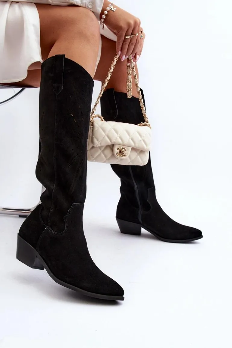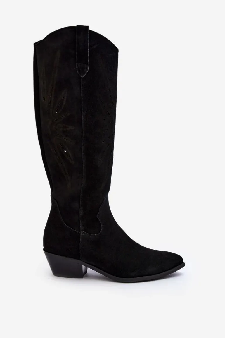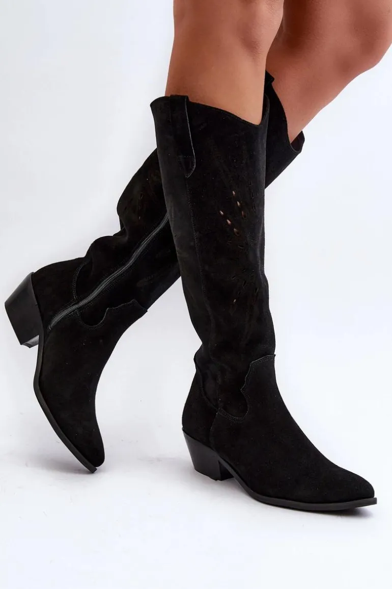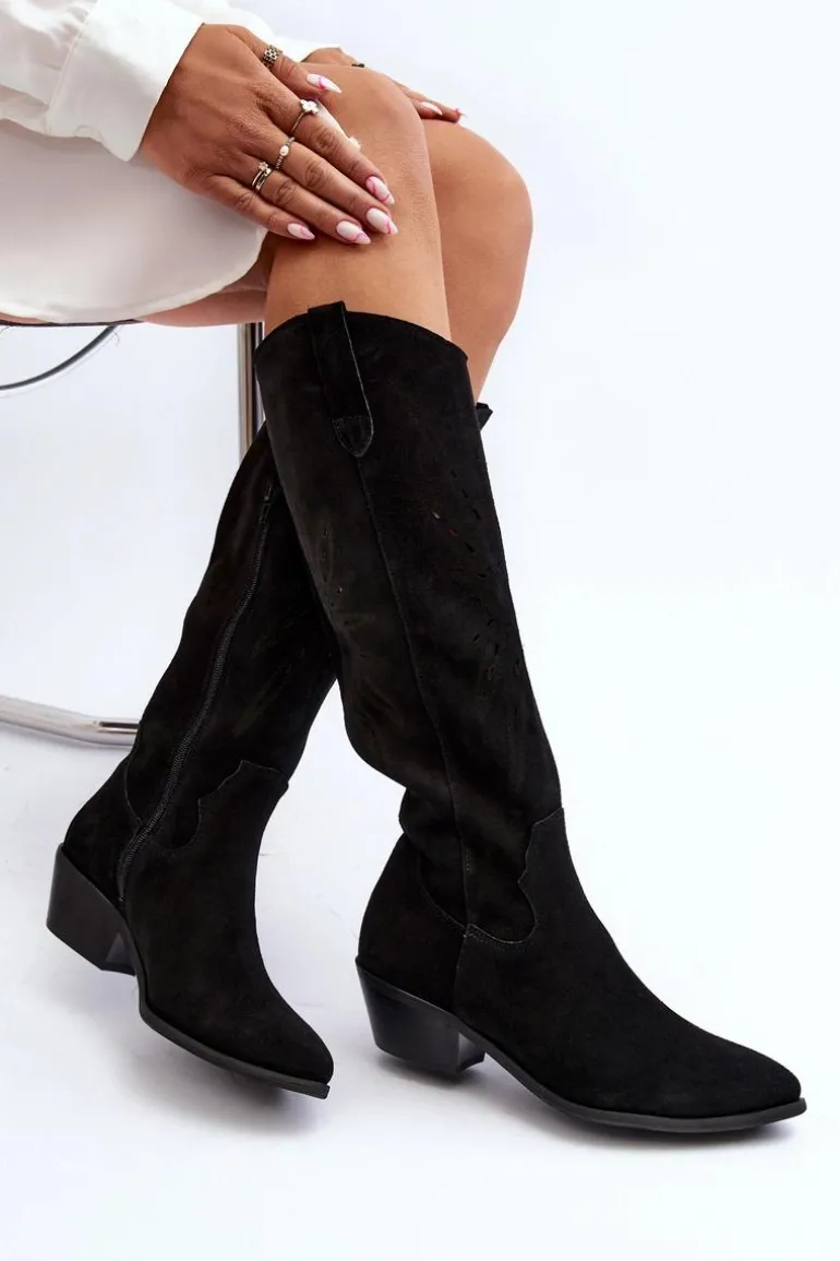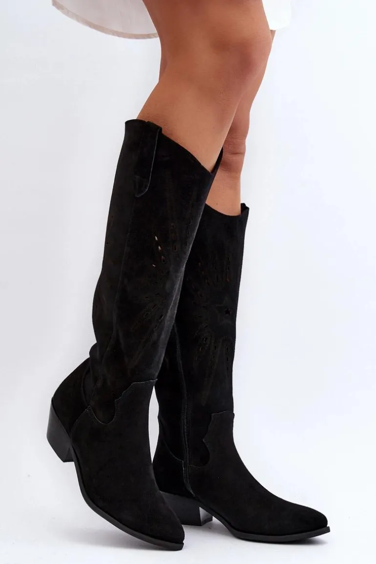 Kozaki z ażurową cholewką przed kolano. Wykonane ze skóry naturalnej. Osadzone na niskim obcasie. Model wsuwany z dodatkowym zapięciem na suwak. Noski w szpic. Lekko profilowana wkładka ze skóry naturalnej zapewni komfort podczas użytkowania. Idealne do wielu stylizacji! Koniecznie powinnaś je mieć w swojej szafie! Przy wyborze rozmiaru prosimy sugerować się tabelą rozmiarów.