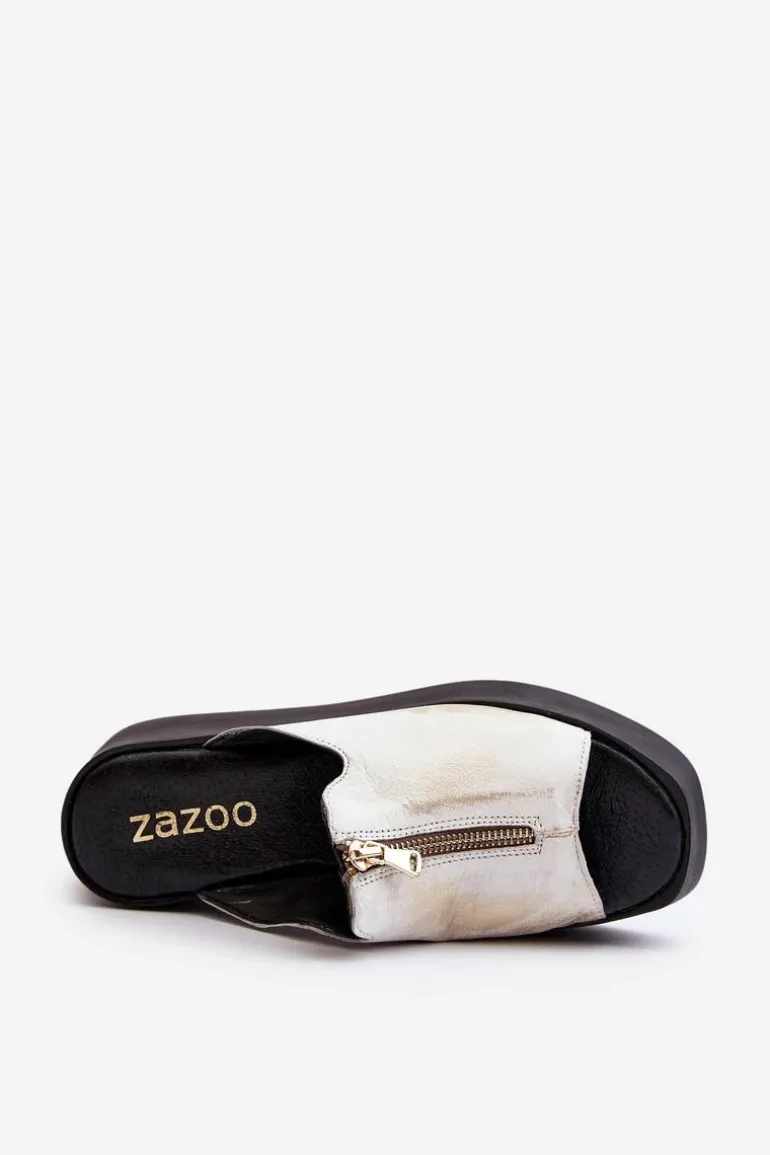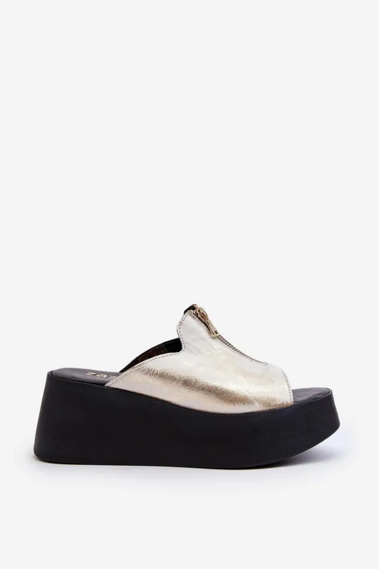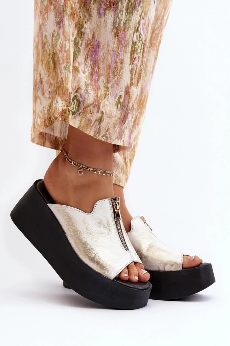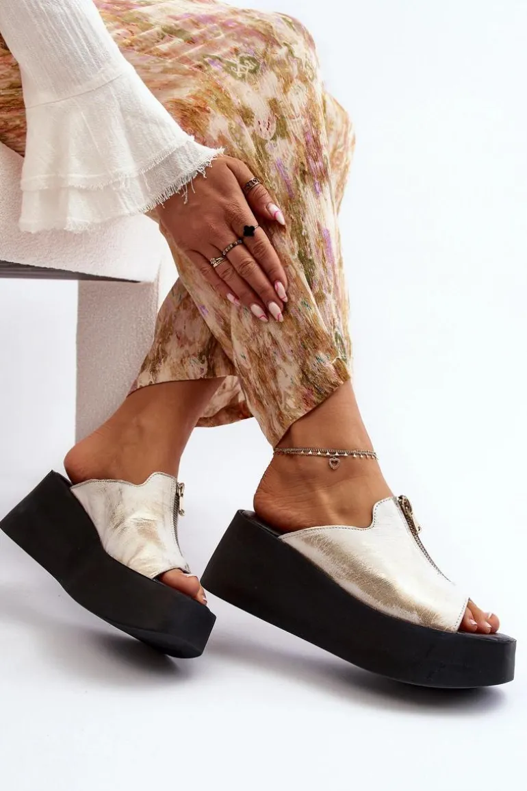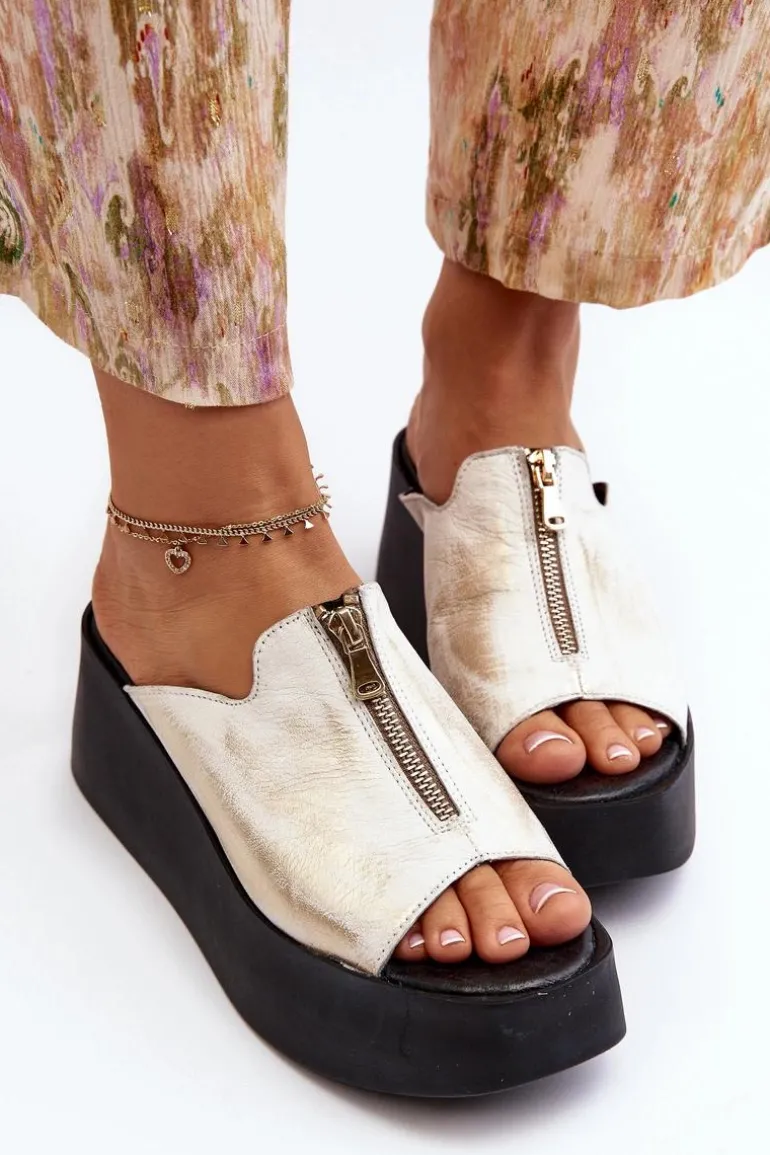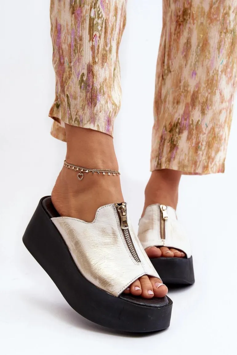 Stylowe klapki damskie osadzone na masywnej platformie. Wykonane ze skóry naturalnej. Z przodu cholewki ozdobny zamek. Miękka, skórzana wkładka zapewni komfort nawet w upalne dni! Koniecznie sprawdź całą naszą kolekcję damskich klapek! Przy wyborze rozmiaru prosimy sugerować się tabelą rozmiarów.