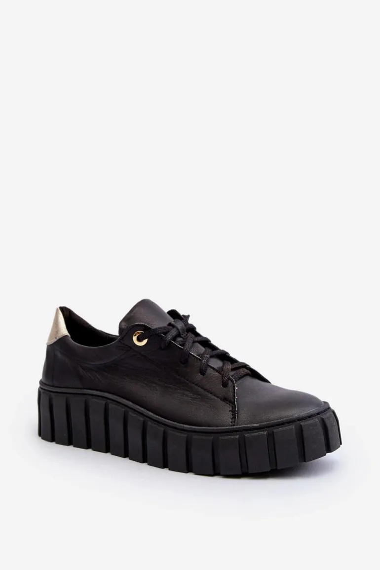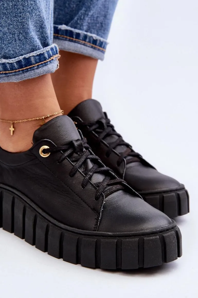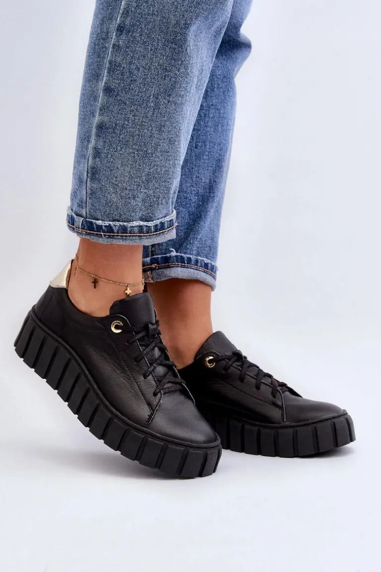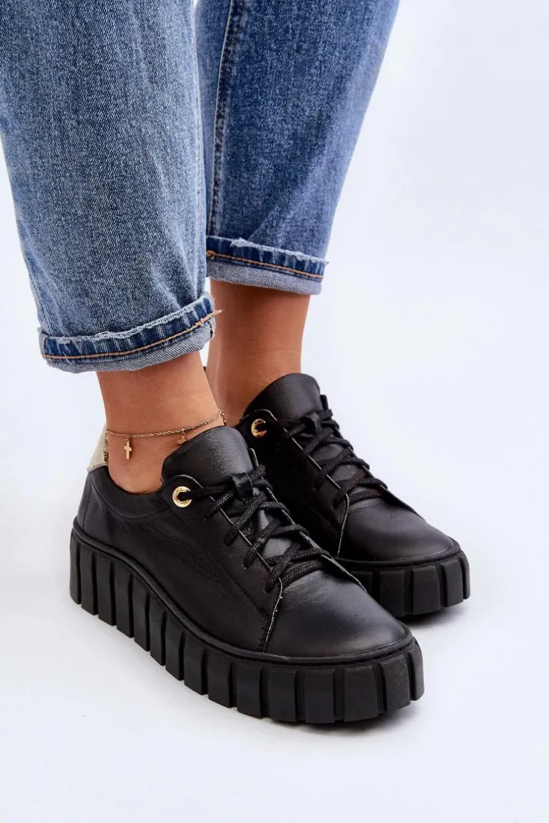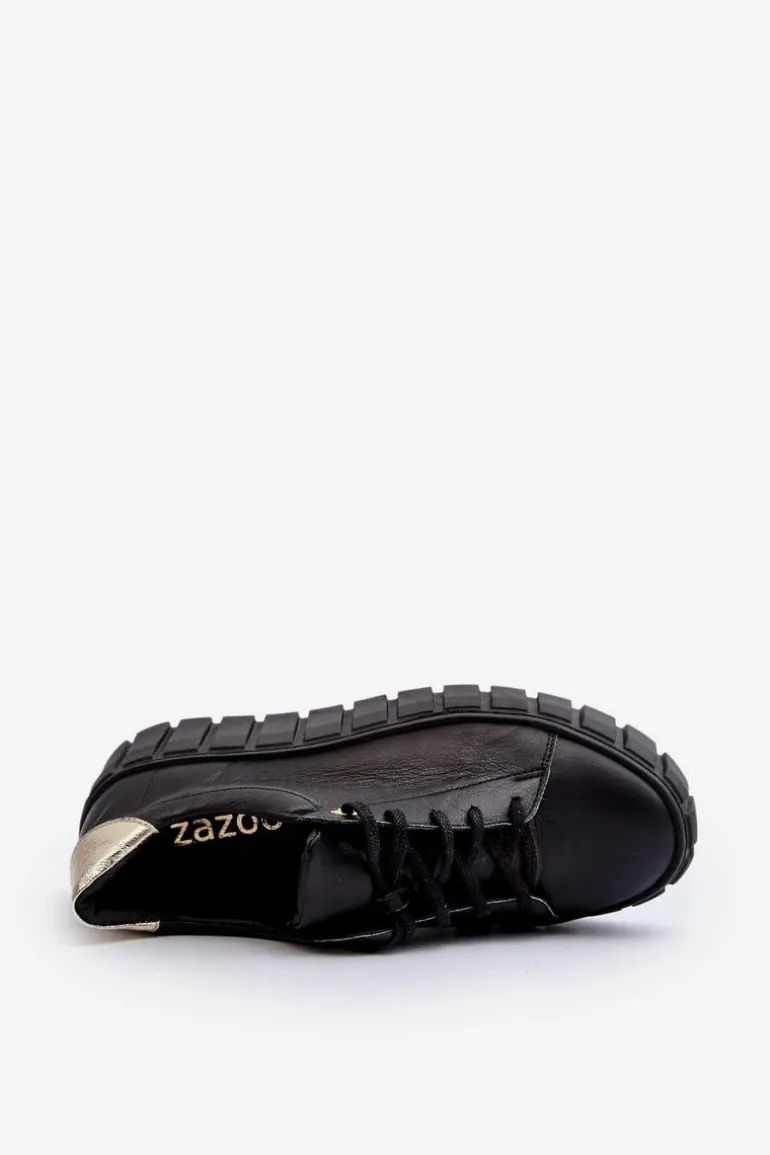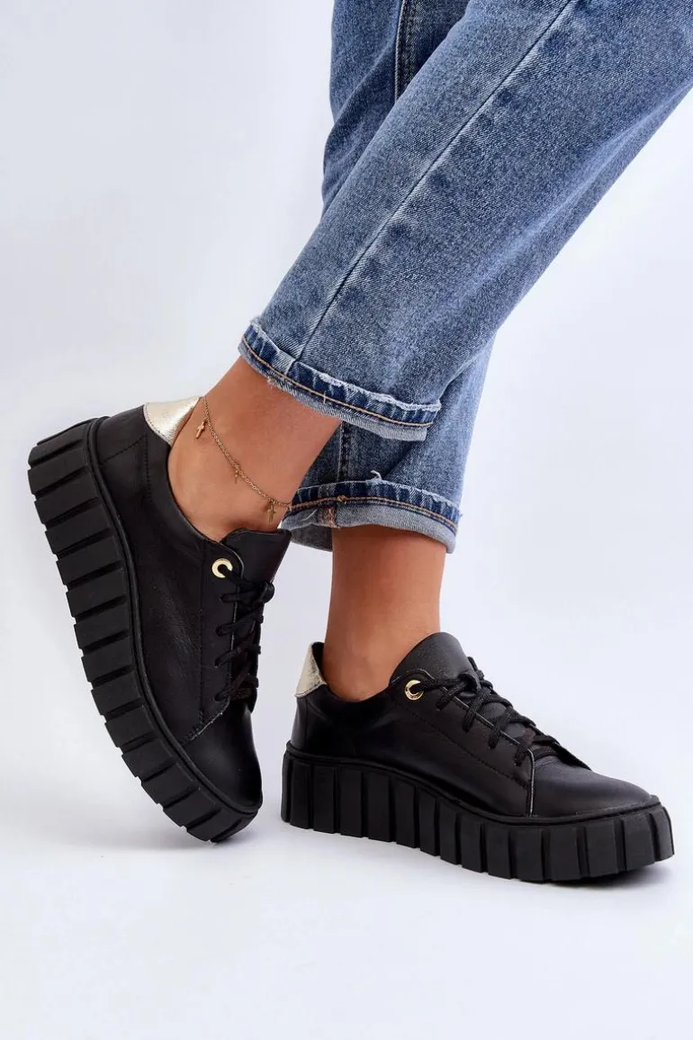 Zazoo 2919 Damskie Skórzane Półbuty Na Grubej Podeszwie Czarne