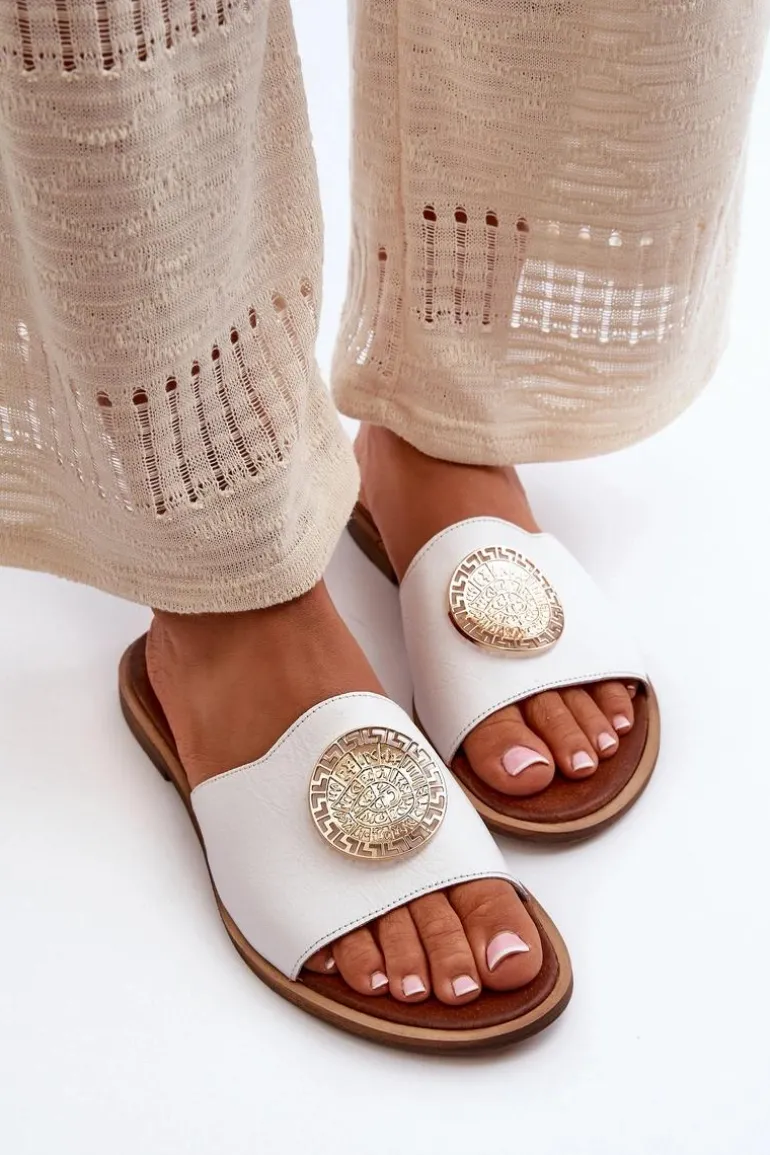 Damskie klapki wykonane ze skóry naturalnej to doskonały wybór dla kobiet, które cenią sobie elegancję i wygodę. Osadzone na płaskim obcasie, zapewniają komfort noszenia przez cały dzień, co sprawia, że są idealne zarówno do codziennych stylizacji, jak i na bardziej formalne okazje. Wzbogacone złotą ozdobą, która dodaje im wyjątkowego uroku i klasy. Dzięki starannemu wykonaniu te klapki są trwałe i stylowe, stanowiąc niezbędny element w każdej kobiecej garderobie. Przy wyborze rozmiaru prosimy sugerować się tabelą rozmiarów.