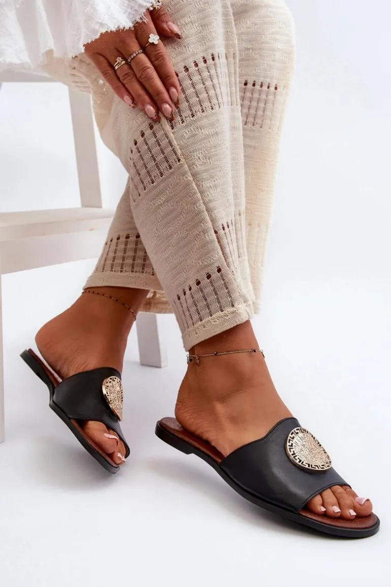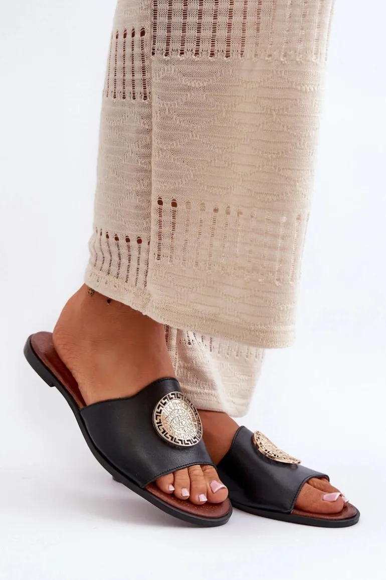 Damskie klapki wykonane ze skóry naturalnej to doskonały wybór dla kobiet, które cenią sobie elegancję i wygodę. Osadzone na płaskim obcasie, zapewniają komfort noszenia przez cały dzień, co sprawia, że są idealne zarówno do codziennych stylizacji, jak i na bardziej formalne okazje. Wzbogacone złotą ozdobą, która dodaje im wyjątkowego uroku i klasy. Dzięki starannemu wykonaniu te klapki są trwałe i stylowe, stanowiąc niezbędny element w każdej kobiecej garderobie. Przy wyborze rozmiaru prosimy sugerować się tabelą rozmiarów.