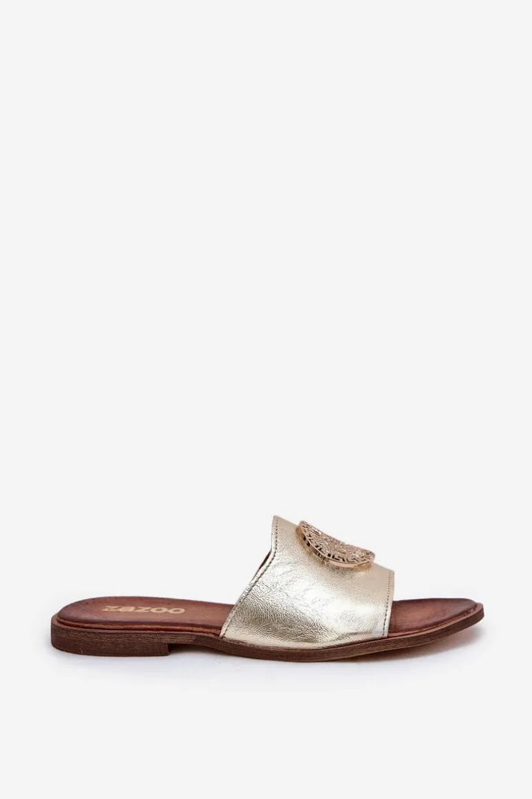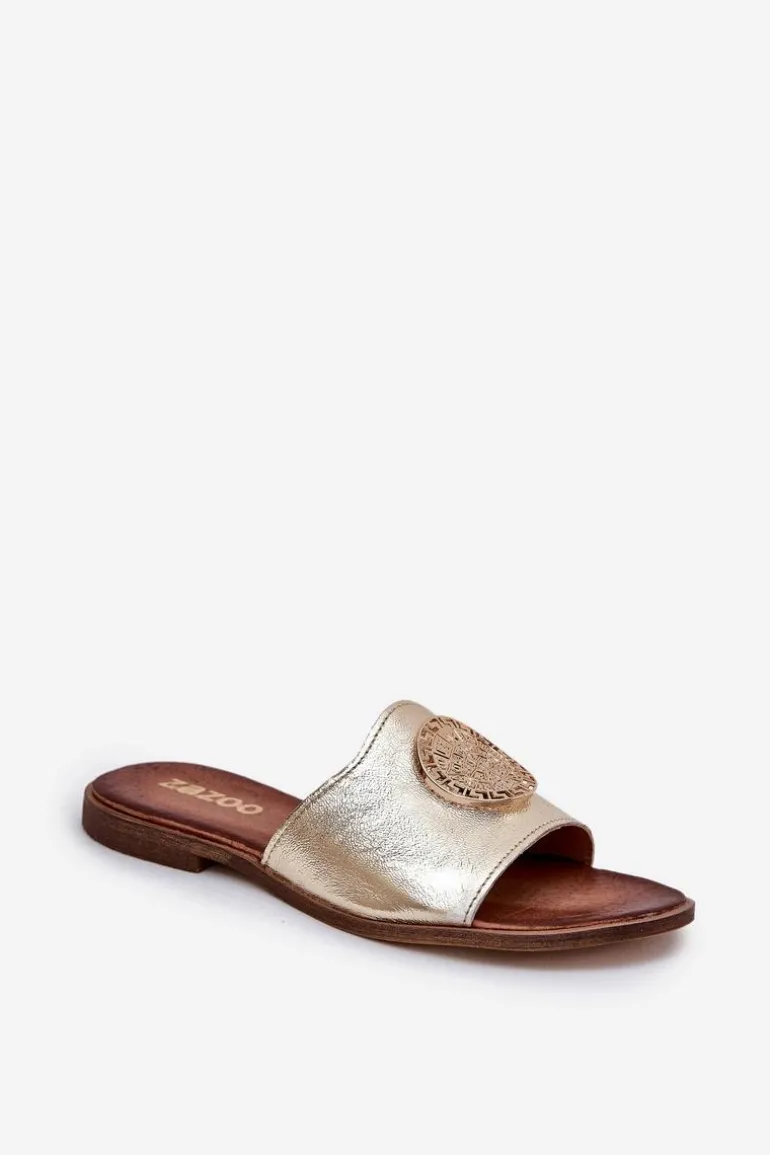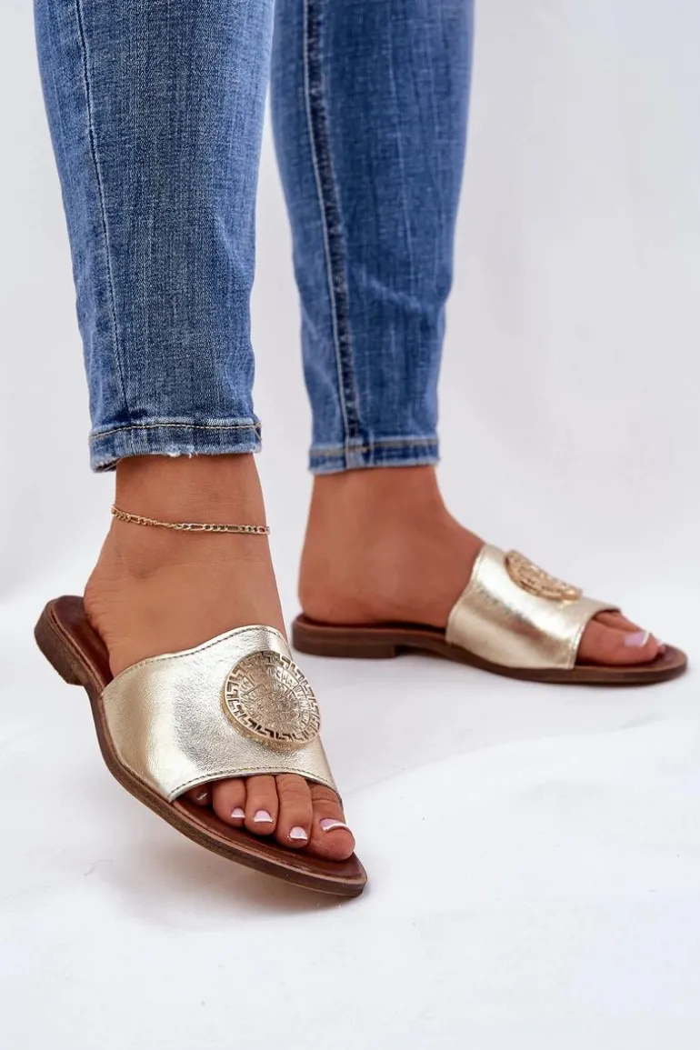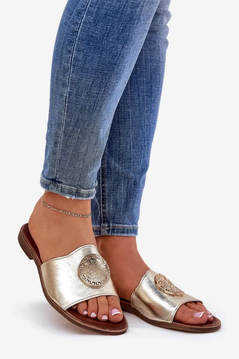 Damskie klapki wykonane ze skóry naturalnej to doskonały wybór dla kobiet, które cenią sobie elegancję i wygodę. Osadzone na płaskim obcasie, zapewniają komfort noszenia przez cały dzień, co sprawia, że są idealne zarówno do codziennych stylizacji, jak i na bardziej formalne okazje. Wzbogacone złotą ozdobą, która dodaje im wyjątkowego uroku i klasy. Dzięki starannemu wykonaniu te klapki są trwałe i stylowe, stanowiąc niezbędny element w każdej kobiecej garderobie. Przy wyborze rozmiaru prosimy sugerować się tabelą rozmiarów.