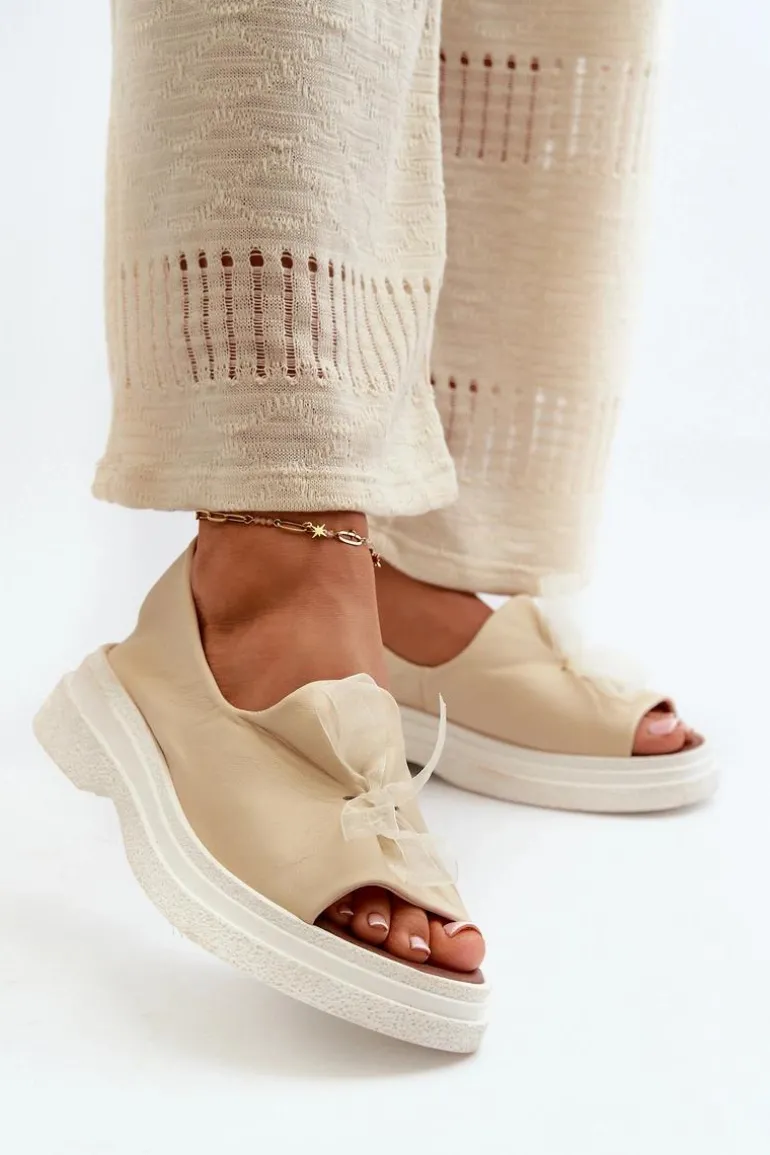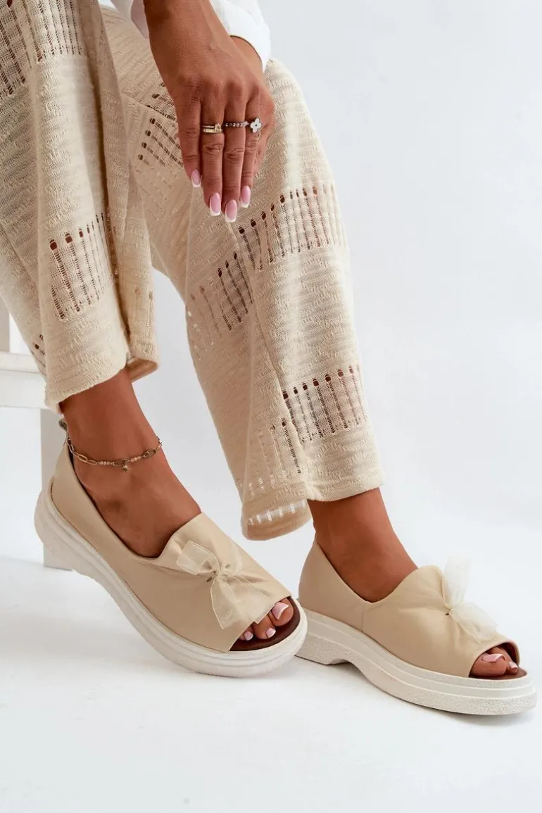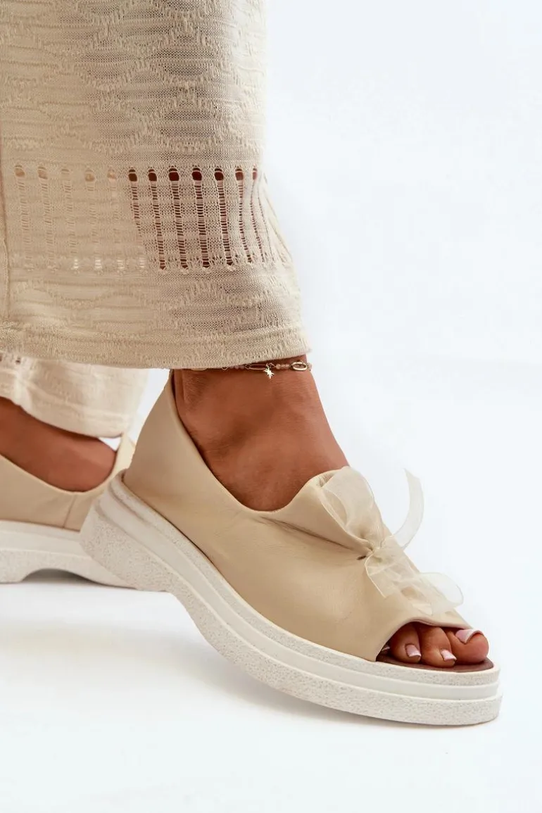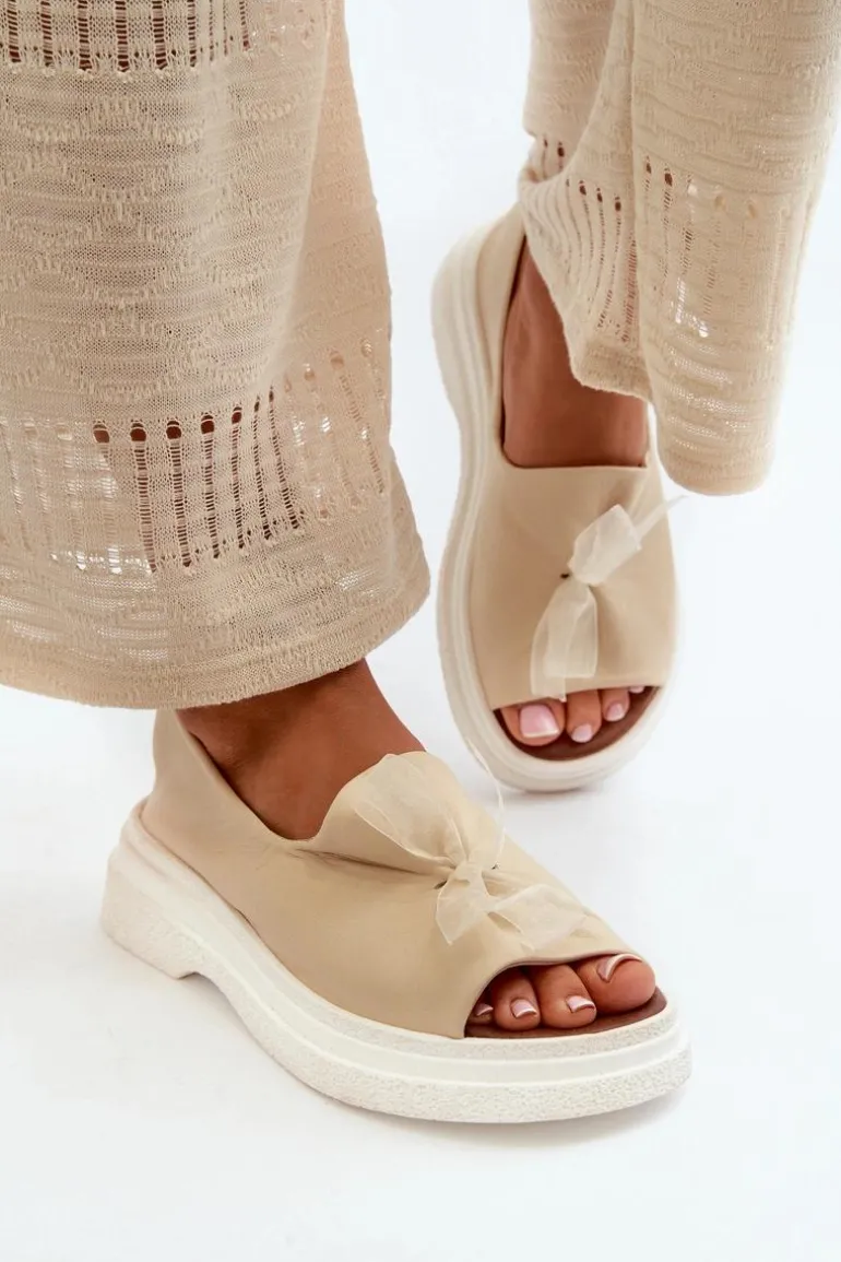 Zazoo 2939 Skórzane Sandały Damskie Z Kokardką Jasnobeżowe