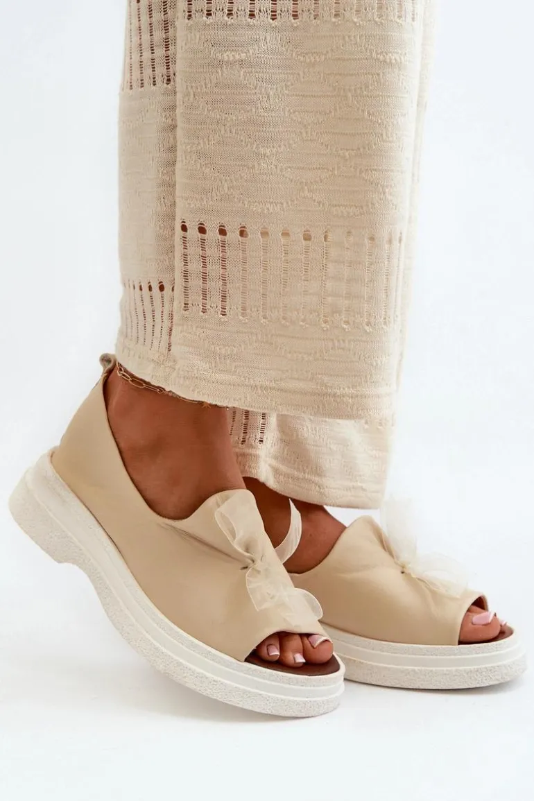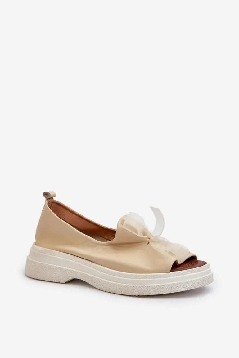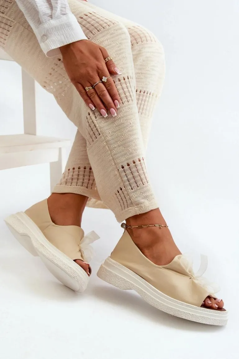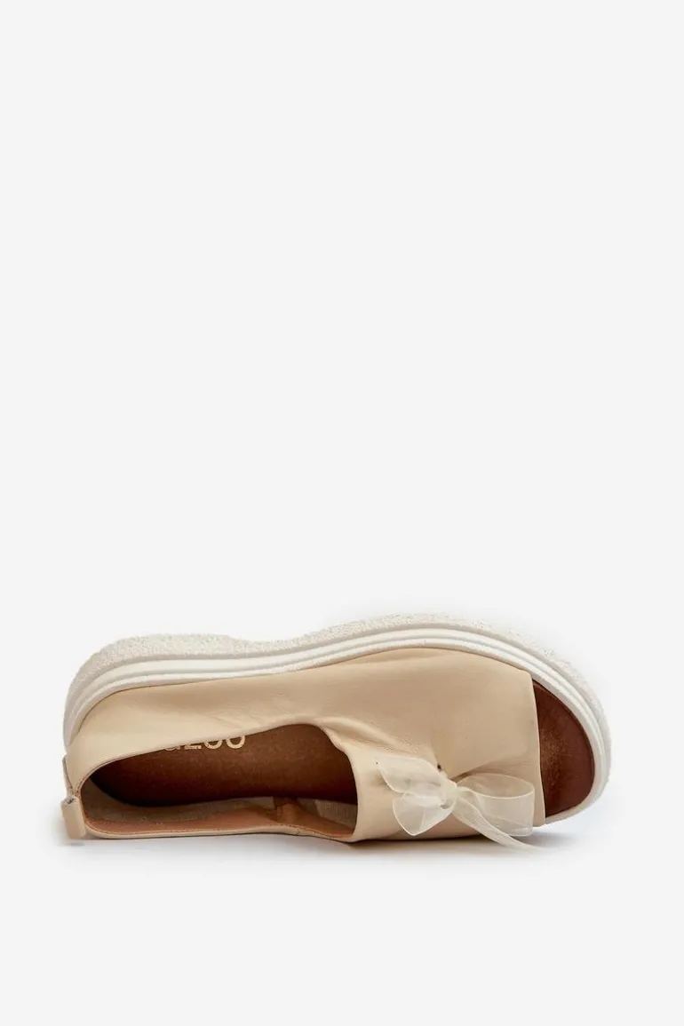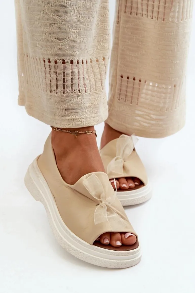 Zazoo 2939 Skórzane Sandały Damskie Z Kokardką Jasnobeżowe