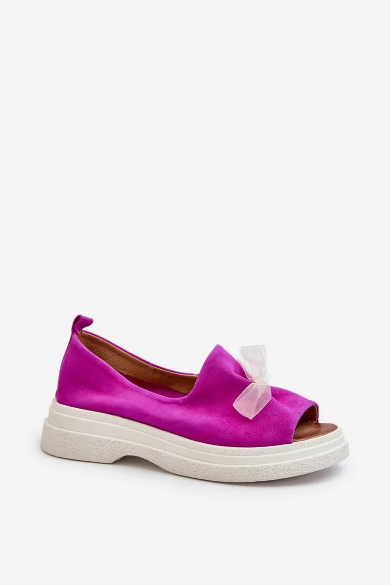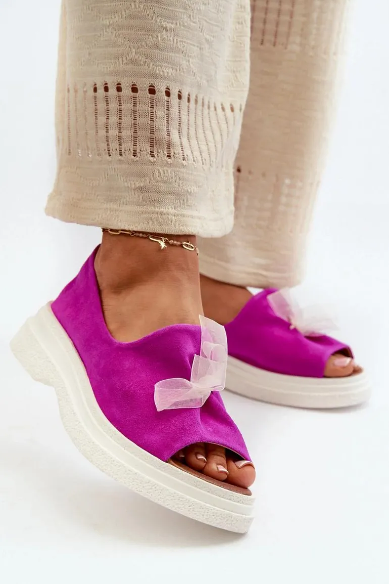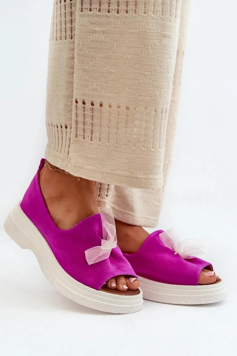 Damskie sandały wykonane z naturalnego zamszu to elegancki i komfortowy wybór na ciepłe dni. Osadzone na grubej, solidnej podeszwie, zapewniają stabilność i wygodę noszenia przez cały dzień. Miękka, skórzana wkładka dodatkowo zwiększa komfort użytkowania. Przód sandałów ozdobiony uroczą kokardką dodaje im subtelnego uroku i sprawia, że stanowią stylowy element każdej letniej stylizacji. Przy wyborze rozmiaru prosimy kierować się tabelą rozmiarów.