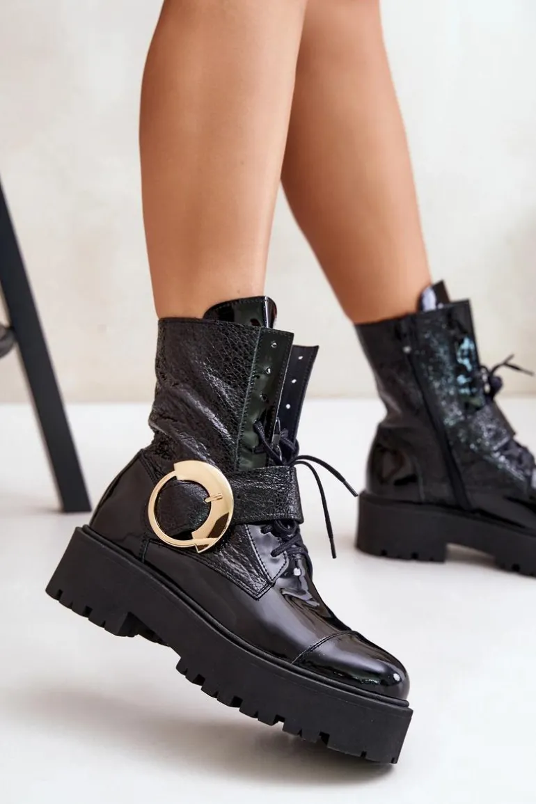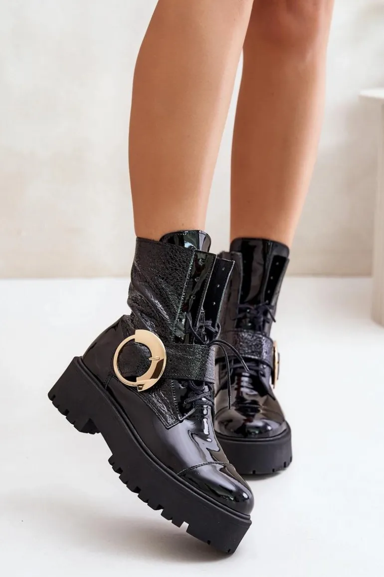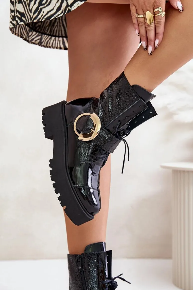 Wyjątkowe botki wykonane z naturalnej skóry. Osadzone na platformie i płaskim obcasie, zapewniają stabilność i wygodę noszenia. Model zapinany na zamek, dodatkowo posiada sznurowanie dla lepszego dopasowania. Duża klamra z paskiem na cholewce stanowi efektowny detal, który nadaje im modnego, wyrazistego charakteru. Przy wyborze rozmiaru prosimy sugerować się tabelą rozmiarów.