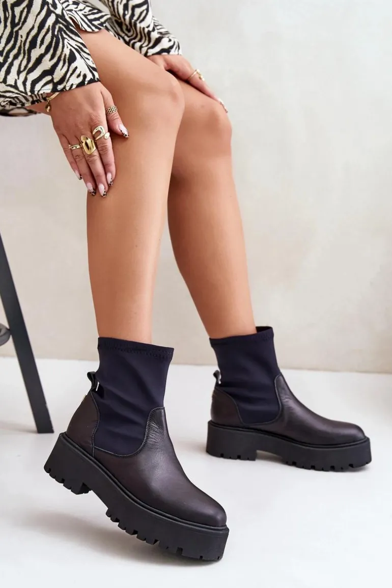 Damskie botki z cholewką za kostkę, wykonane z wysokiej jakości skóry naturalnej. Osadzone na platformie i płaskim obcasie, zapewniają wygodę podczas codziennego noszenia. Wsuwany model z zaokrąglonymi noskami łączy w sobie elegancję i komfort, doskonały na różne okazje i stylizacje. Przy wyborze rozmiaru prosimy sugerować się tabelą rozmiarów.