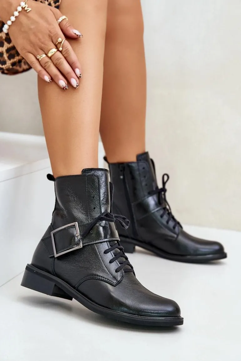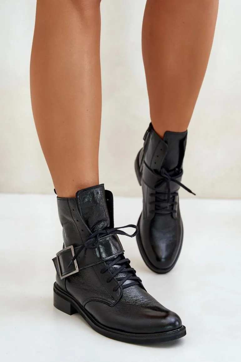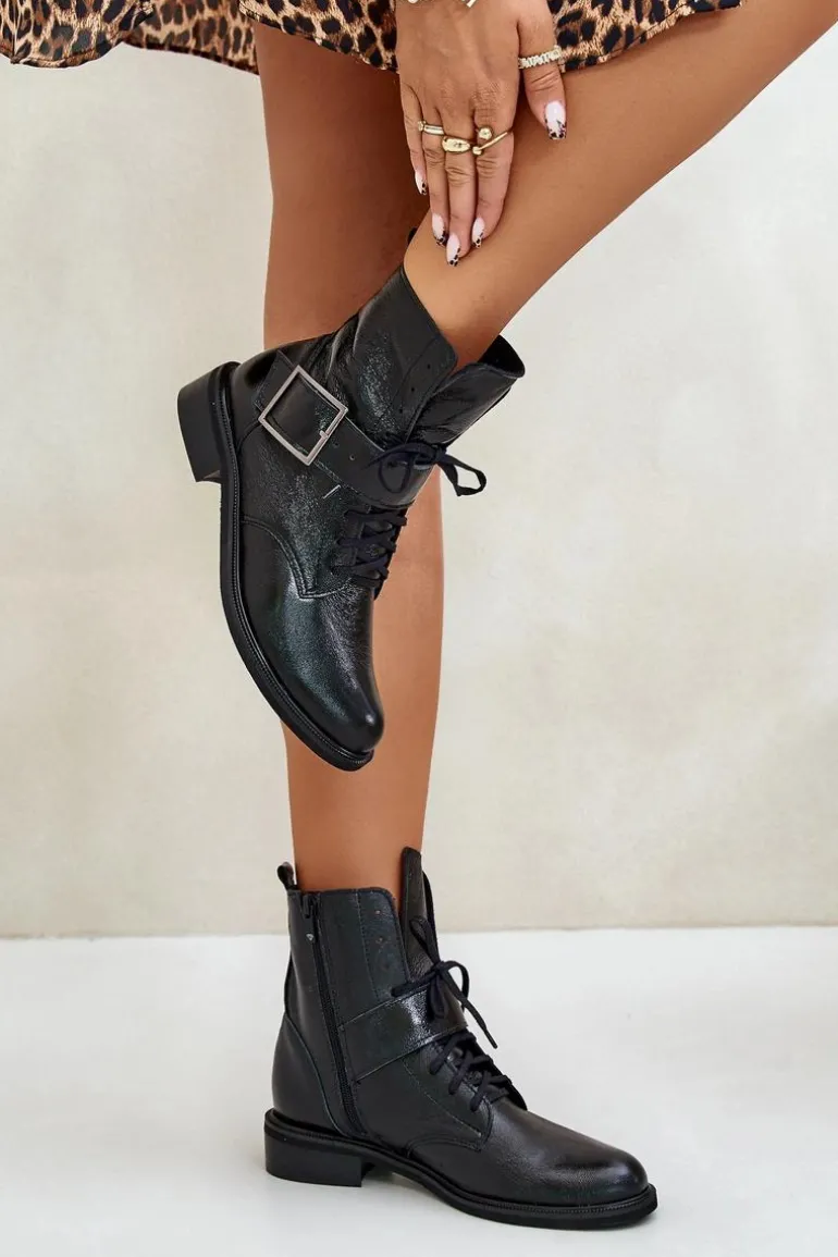 Botki damskie wykonane z wysokiej jakości skóry naturalnej. Zapinane na zamek oraz dodatkowo posiadają sznurowanie. Cholewka ozdobiona paskiem ze srebrną klamrą. Miękka wkładka zapewni komfort podczas użytkowania. Noski zaokrąglone. Usztywniony zapiętek zwiększy stabilizację stopy. Przy wyborze rozmiaru prosimy sugerować się tabelą rozmiarów.