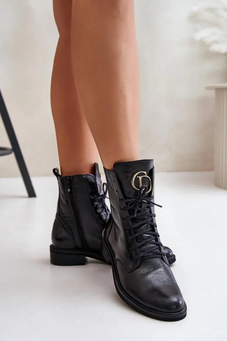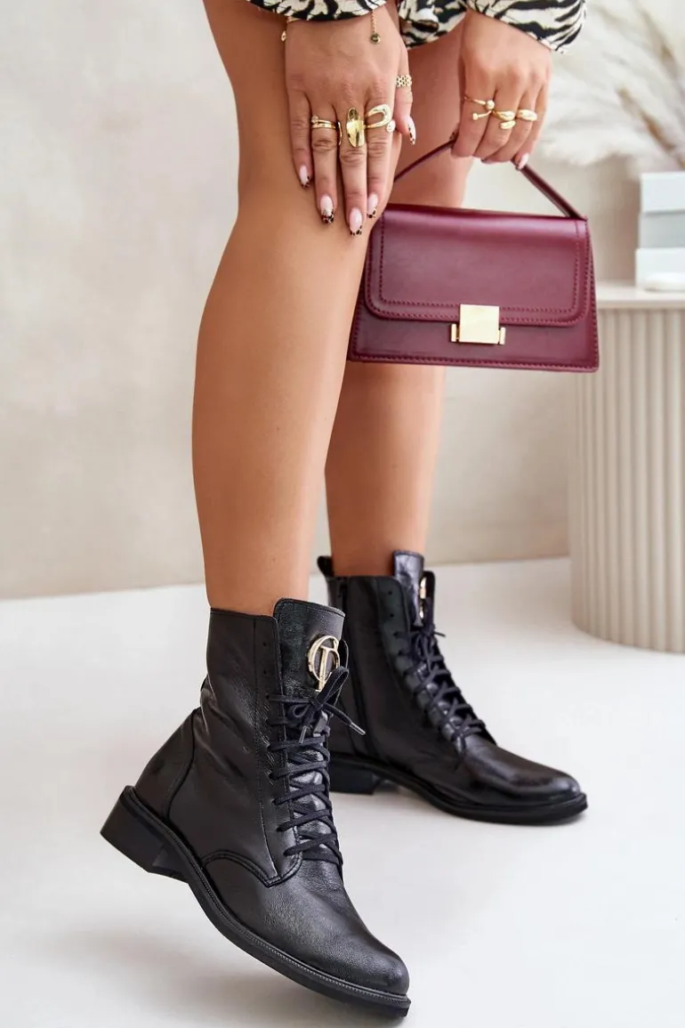 Damskie botki wykonane z wysokogatunkowej skóry naturalnej, które łączą elegancję i funkcjonalność. Model zapinany na zamek z dodatkowym sznurowaniem, co zapewnia idealne dopasowanie do stopy. Na języku umieszczono złoty detal, dodający subtelnego blasku i wyjątkowego charakteru. Przy wyborze rozmiaru prosimy sugerować się tabelą rozmiarów.