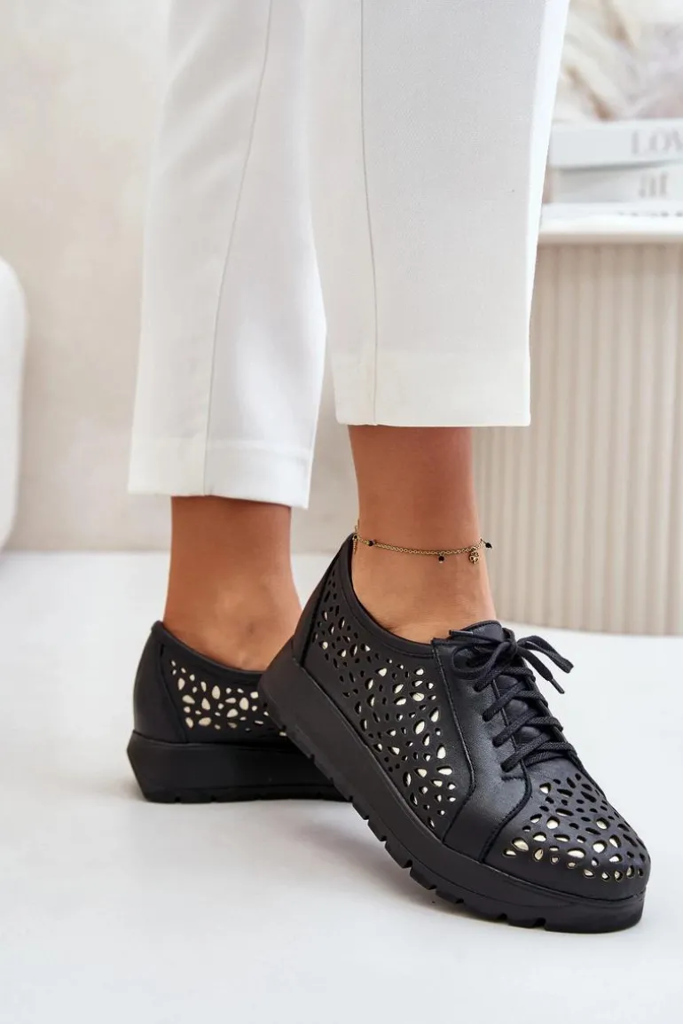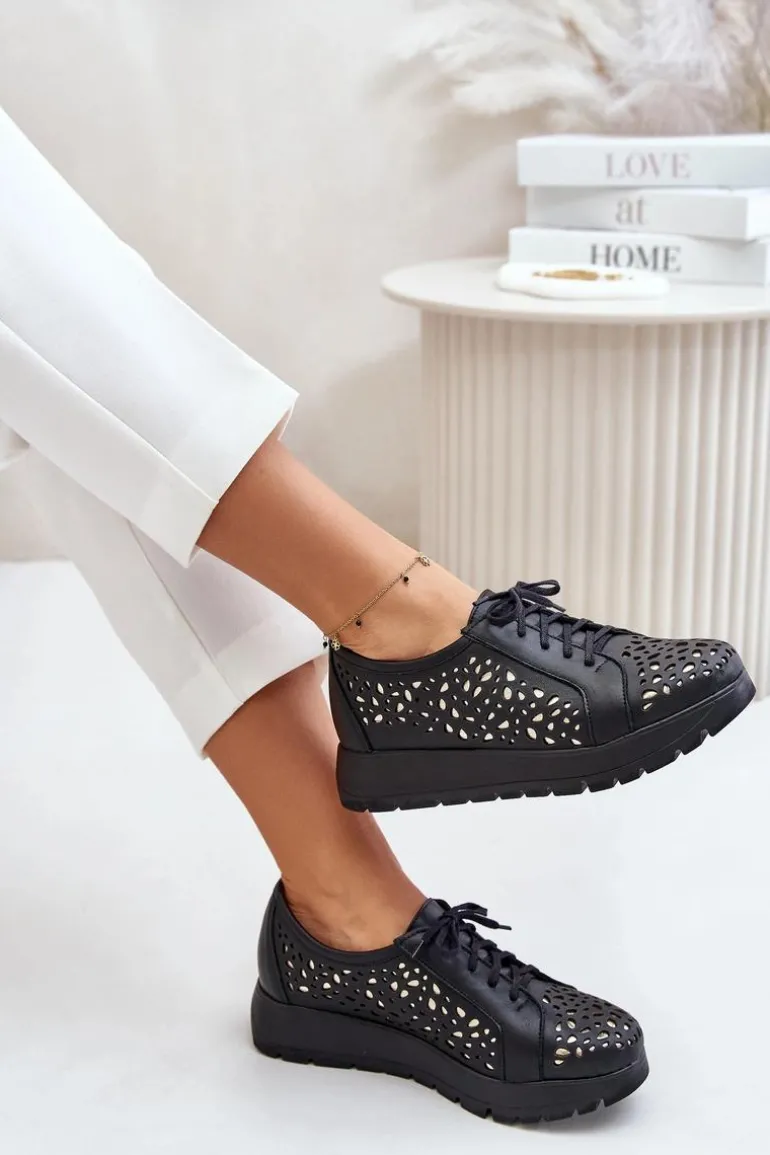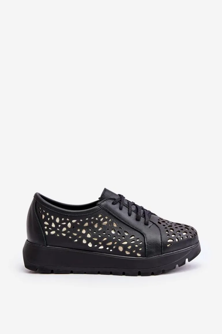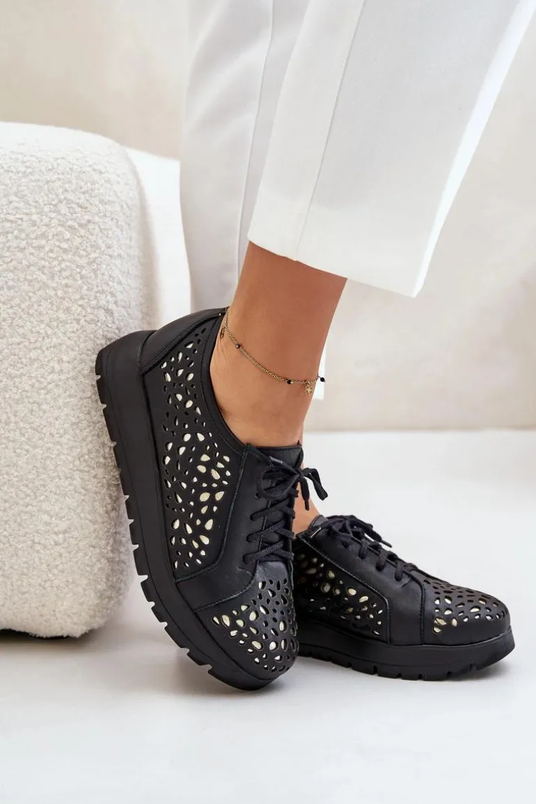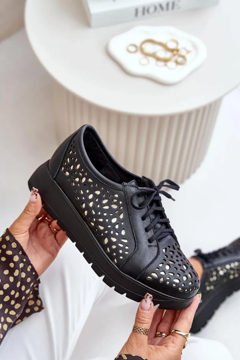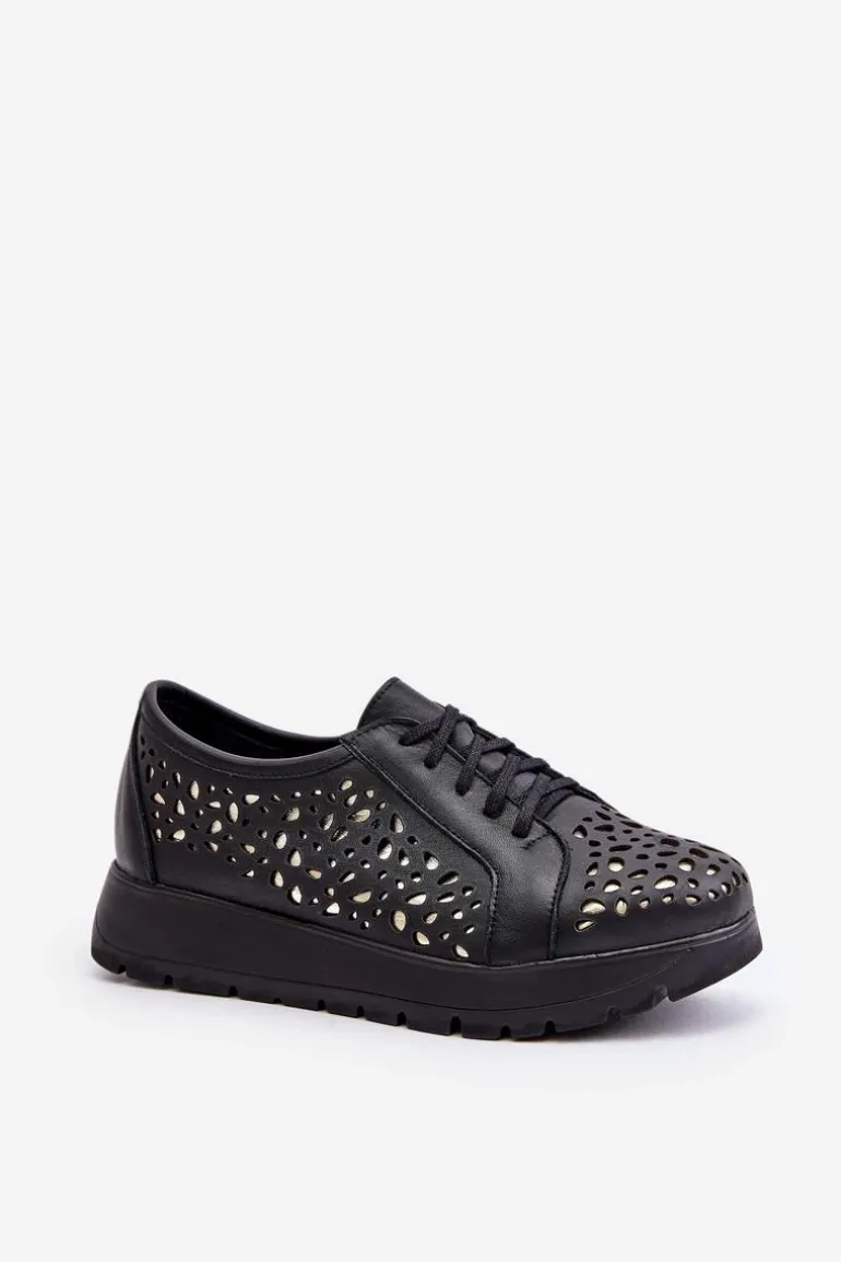Damskie półbuty wykonane ze skóry naturalnej, osadzone na platformie dla dodatkowego komfortu. Noski są zaokrąglone. Cholewka ozdobiona ażurowym wzorem, który dodaje im lekkości i stylu. Idealne do różnych stylizacji, te buty doskonale uzupełnią każdą garderobę, zapewniając modny i wygodny look na co dzień. Przy wyborze rozmiaru prosimy sugerować się tabelą rozmiarów.