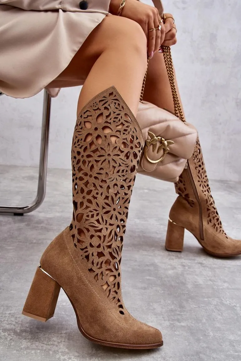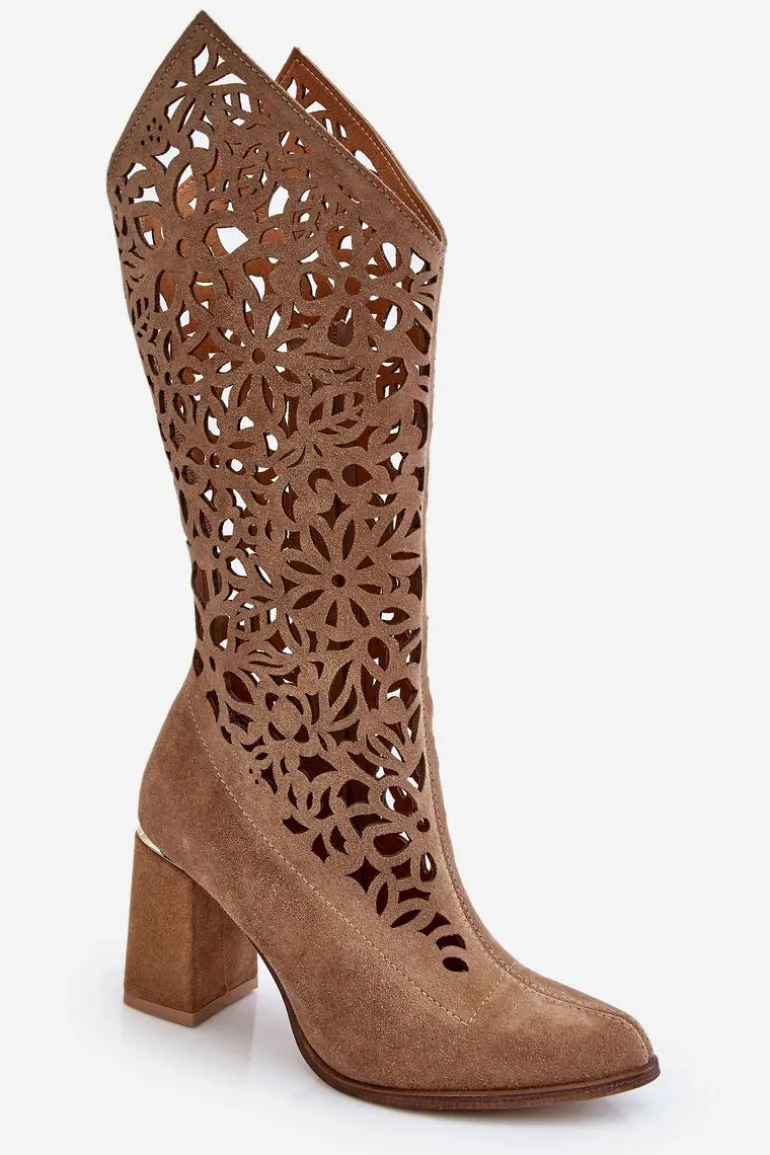 Kozaki z ażurową cholewką do kolana oraz noskiem w szpic. Zapinane na zamek błyskawiczny oraz wsuwane. Posiadają usztywniany zapiętek. Wykonane z wysokiej jakości skór naturalnych. Z tymi kozakami stworzysz wiele ciekawych stylizacji na co dzień. Miękka, skórzana wkładka oraz stabilny obcas w postaci słupka zapewnią wygodę podczas użytkowania. Przy wyborze rozmiaru prosimy sugerować się tabelą rozmiarów.