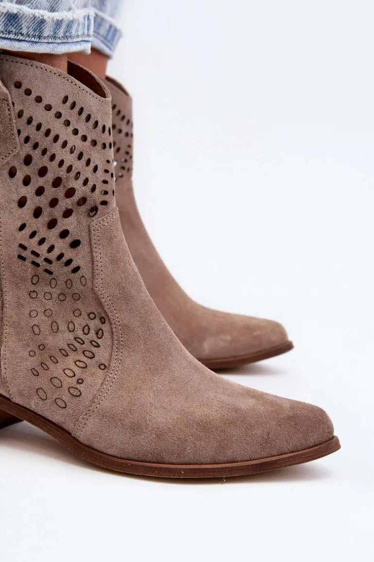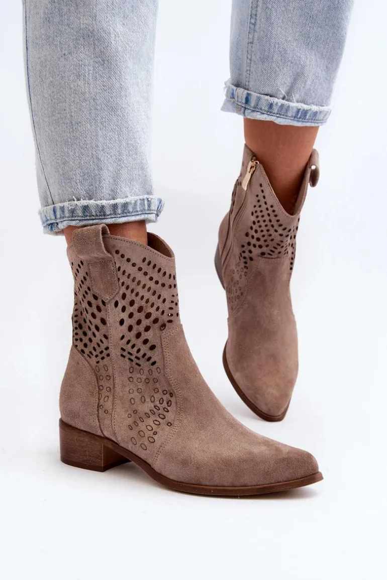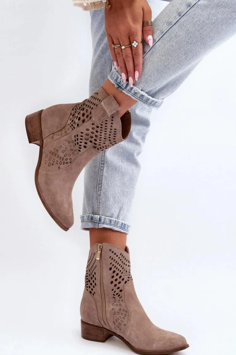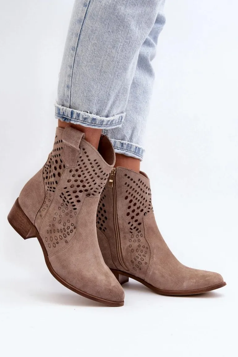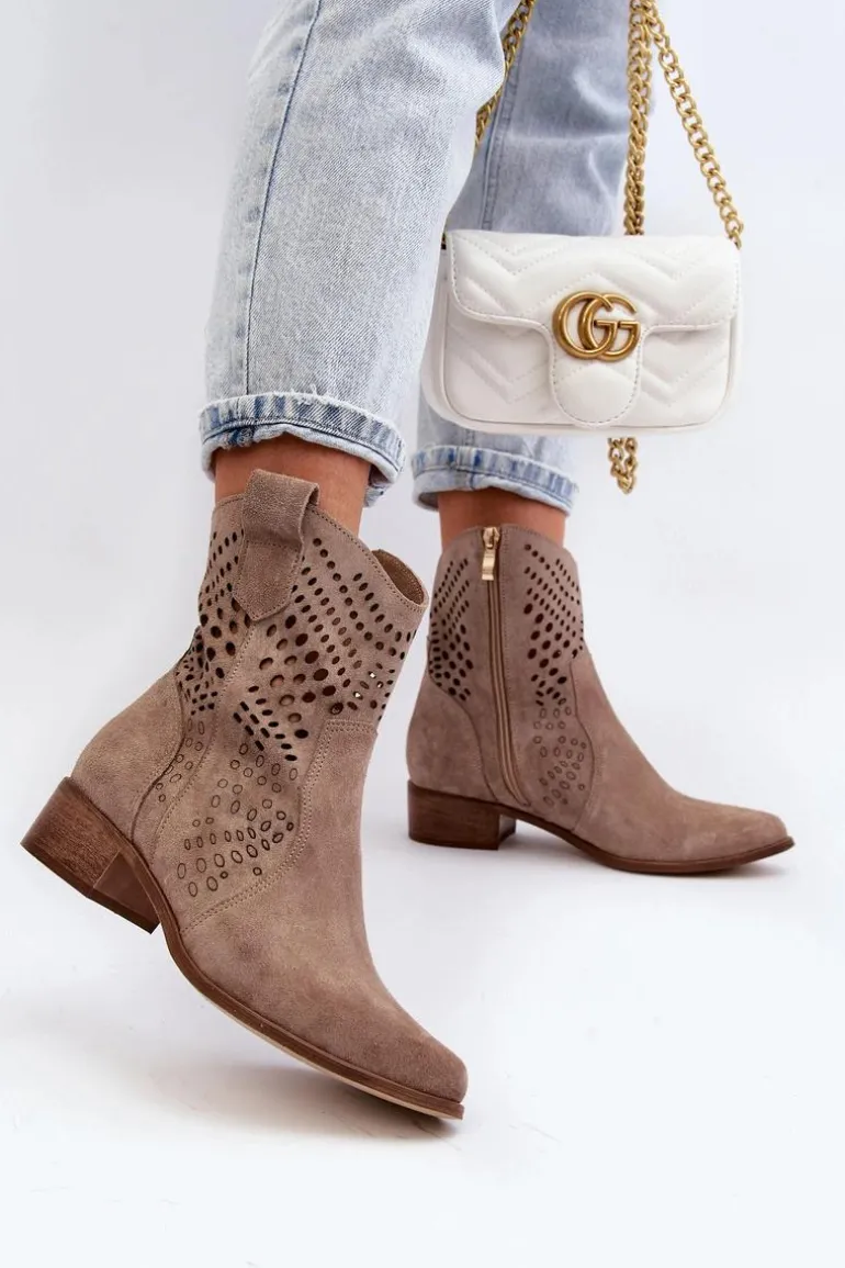 Botki damskie to doskonały wybór na sezon jesienno-zimowy! Wykonane z naturalnego zamszu. Osadzone na niskim obcasie. Ażurowy wzorek na cholewce dodaje im elegancji. Model ten zapinany jest na zamek. Miękka wkładka gwarantuje komfort noszenia. Przy wyborze rozmiaru prosimy sugerować się tabelą rozmiarów.