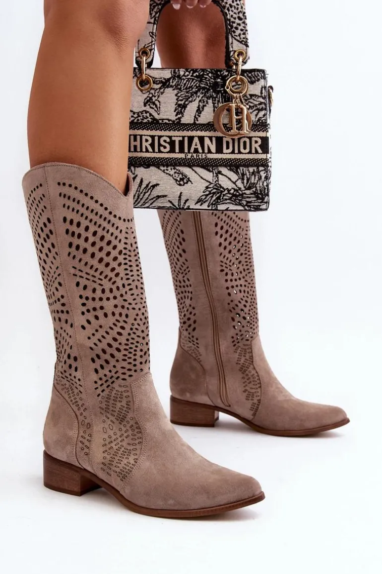 Kozaki-kowbojki zostały wykonane z naturalnego zamszu. Posiadają ażurowy wzorek na cholewce. Model ten zapinany jest na suwak z boku cholewki. Miękka, skórzana wkładka pozwoli na komfortowe użytkowanie obuwia. Dodatkowo kozaki posiadają usztywniany zapiętek. Przy wyborze rozmiaru prosimy sugerować się tabelą rozmiarów.