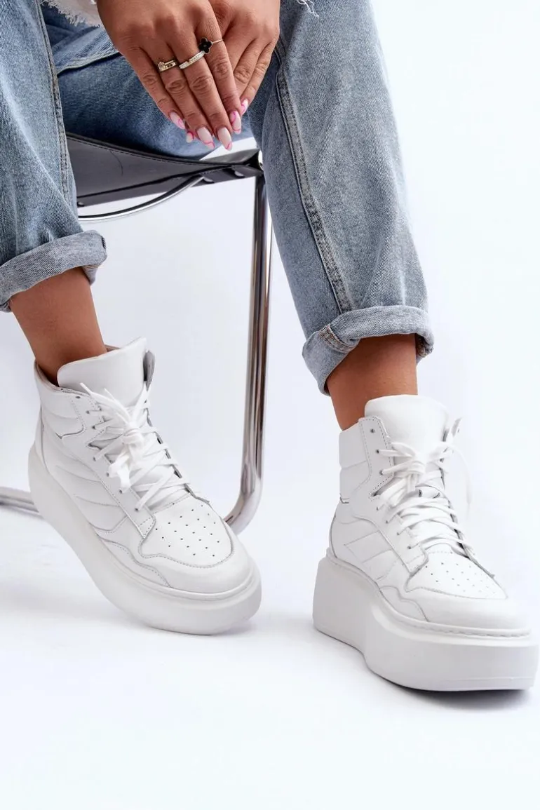 Modne buty sportowe damskie wykonane ze skóry naturalnej. Osadzone na masywnej platformie. Cholewka za kostkę. Noski zaokrąglone. Model z klasycznym sznurowaniem. Idealne na wiosenne dni! Fason ten na pewno przypadnie Ci do gustu! Przy wyborze rozmiaru prosimy kierować tabelą rozmiarów.