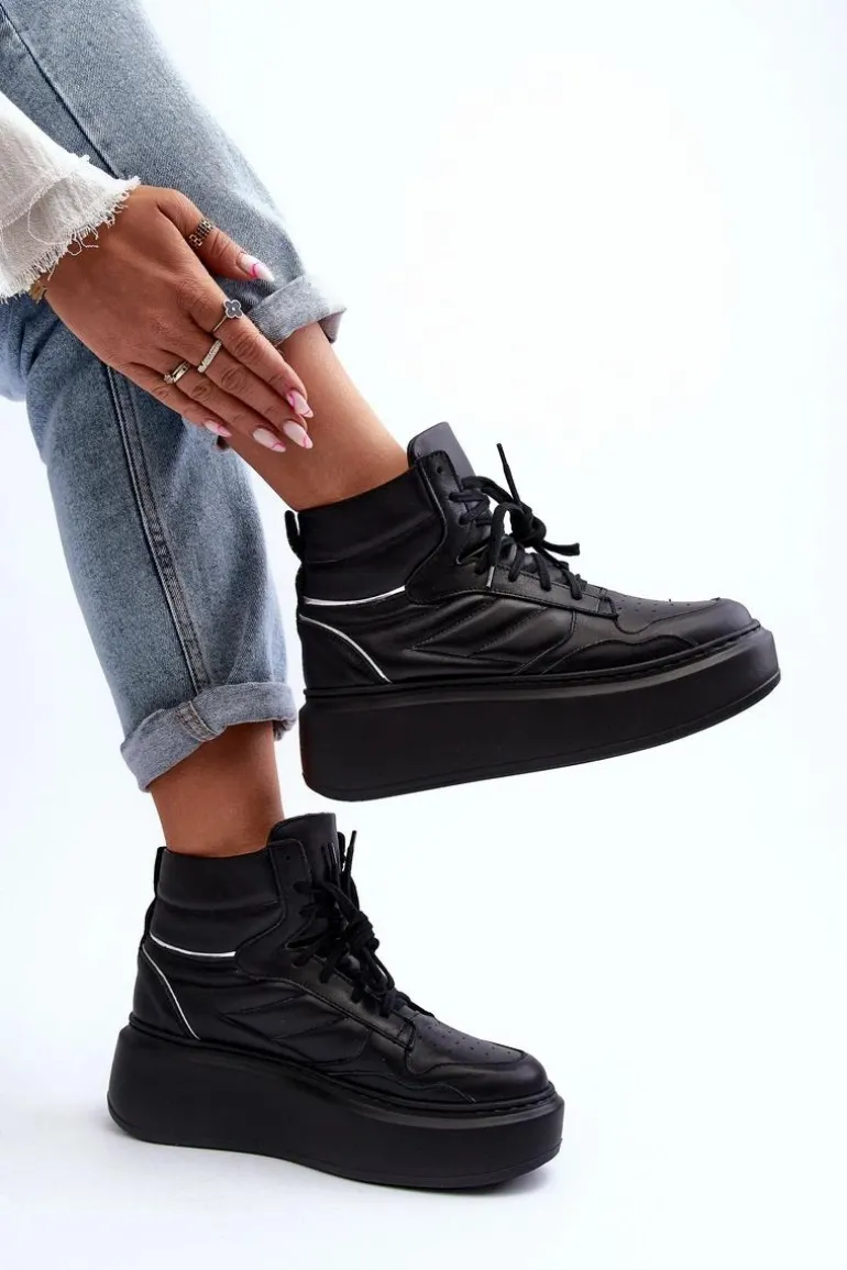 Modne buty sportowe damskie wykonane ze skóry naturalnej. Osadzone na masywnej platformie. Cholewka za kostkę. Noski zaokrąglone. Model z klasycznym sznurowaniem. Idealne na wiosenne dni! Fason ten na pewno przypadnie Ci do gustu! Przy wyborze rozmiaru prosimy kierować tabelą rozmiarów.