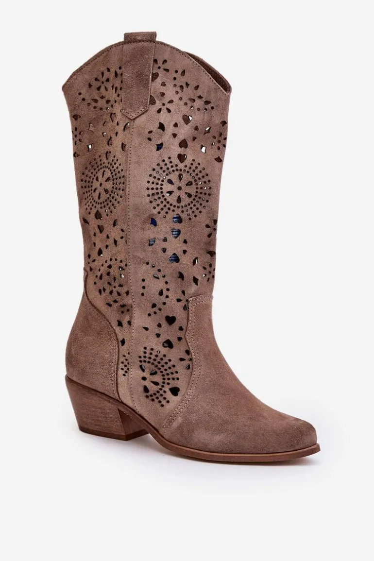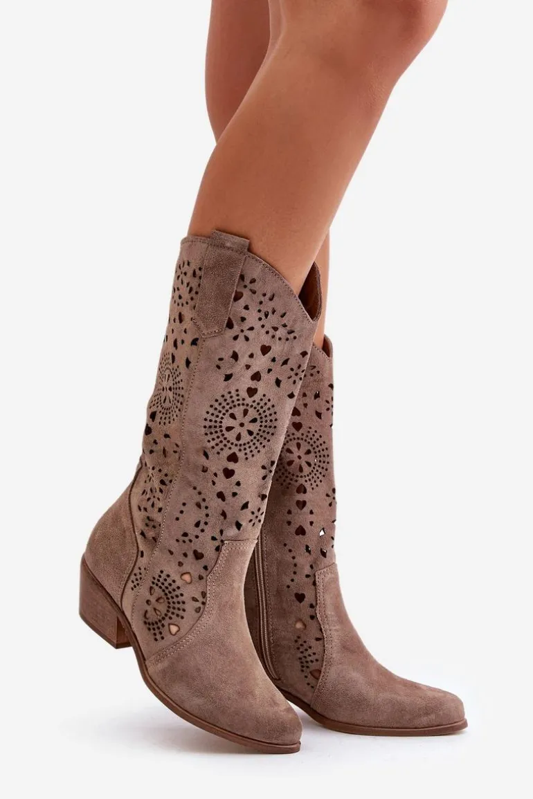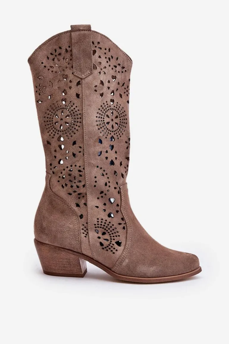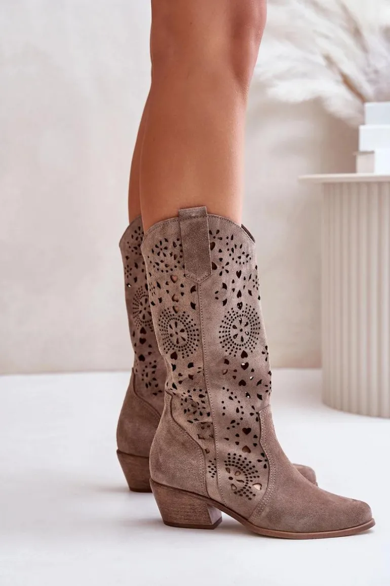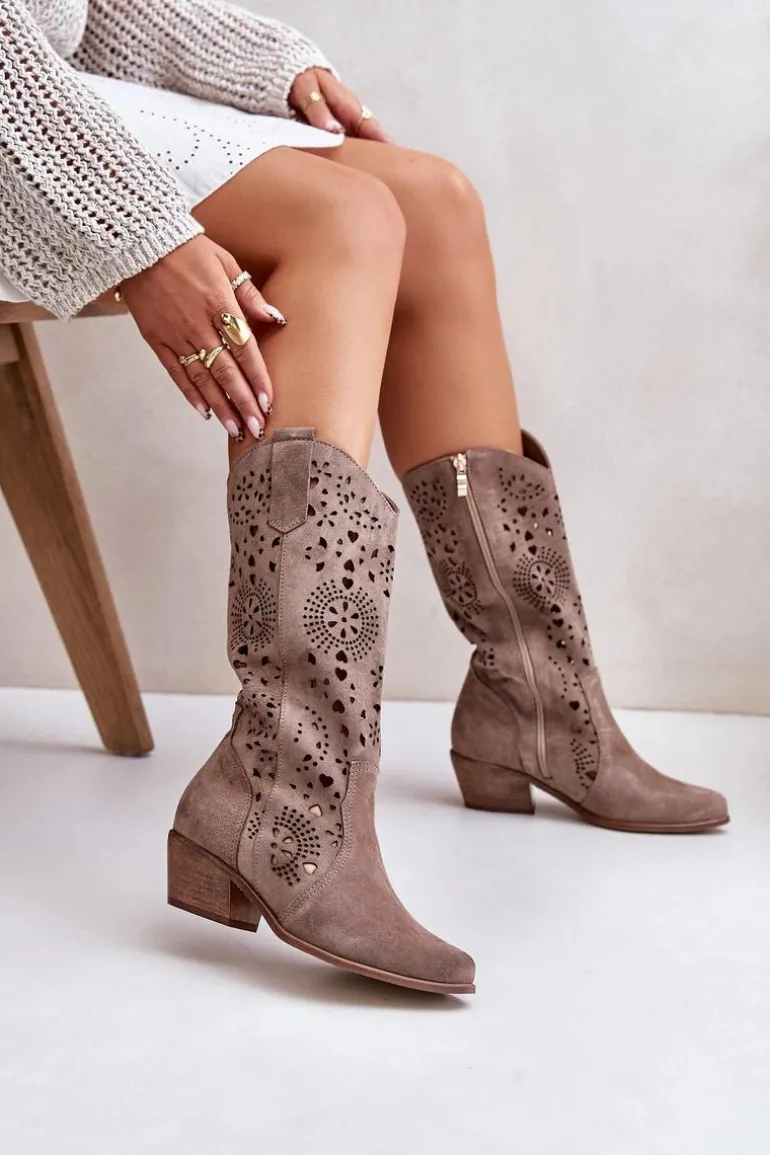 Kozaki z ażurową cholewką do połowy łydki. Model w stylu kowbojek. Zapinane na suwak. Noski w szpic optycznie wysmuklą nogi. Miękka, skórzana wkładka zapewni wygodę podczas użytkowania. Ażurowe kozaki to idealny wybór do wielu stylizacji! Przy wyborze rozmiaru prosimy sugerować się tabelą rozmiarów.
