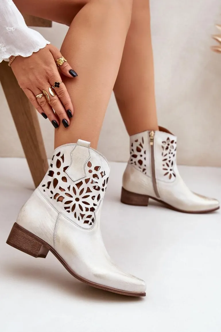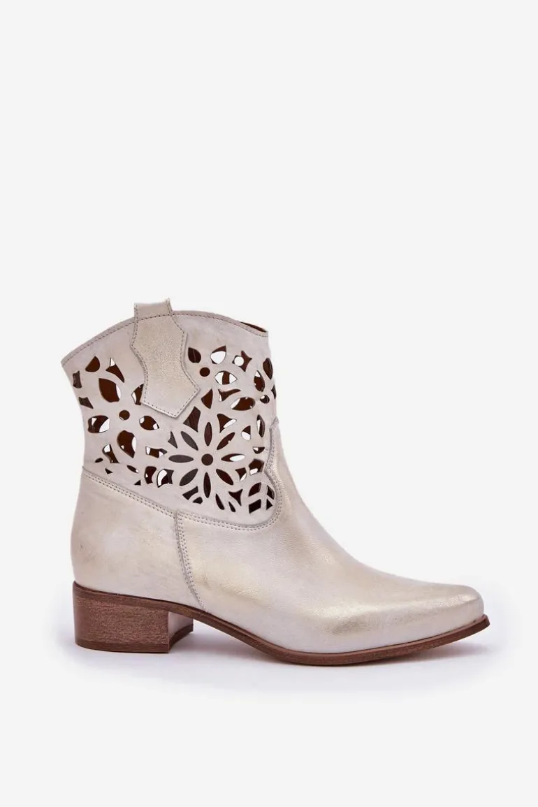 Botki damskie wykonane z naturalnej skóry. Osadzone na niskim obcasie, co sprawia, że są zarówno stylowe, jak i wygodne. Ażurowy wzorek na cholewce dodaje im elegancji. Model ten zapiany jest na zamek, co ułatwia zakładanie obuwia. Miękka wkładka gwarantuje komfort noszenia. Przy wyborze rozmiaru prosimy sugerować się tabelą rozmiarów.