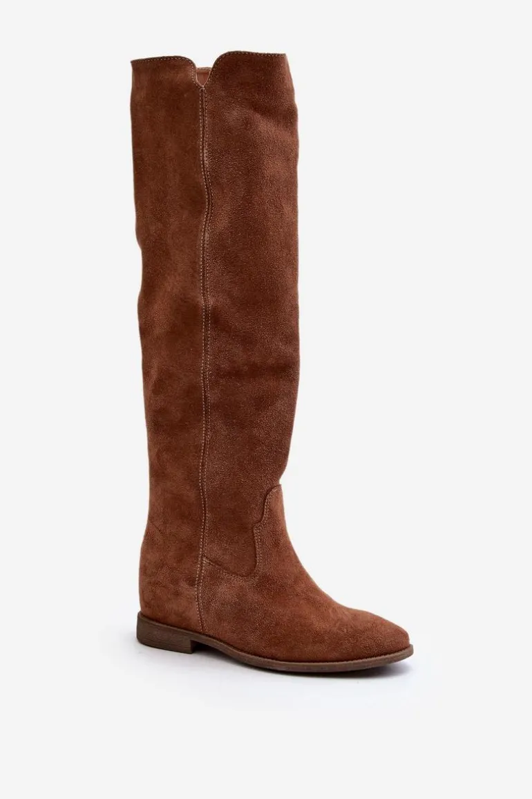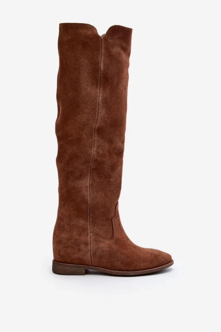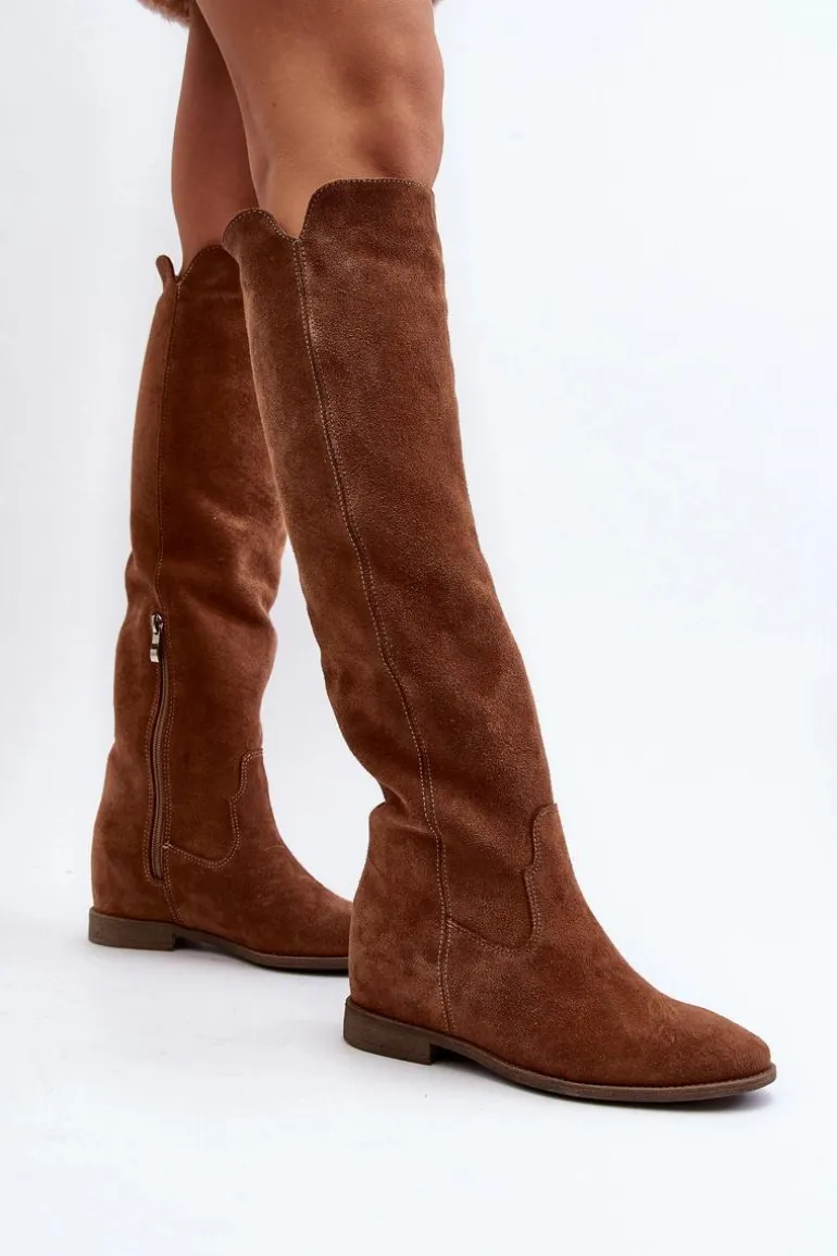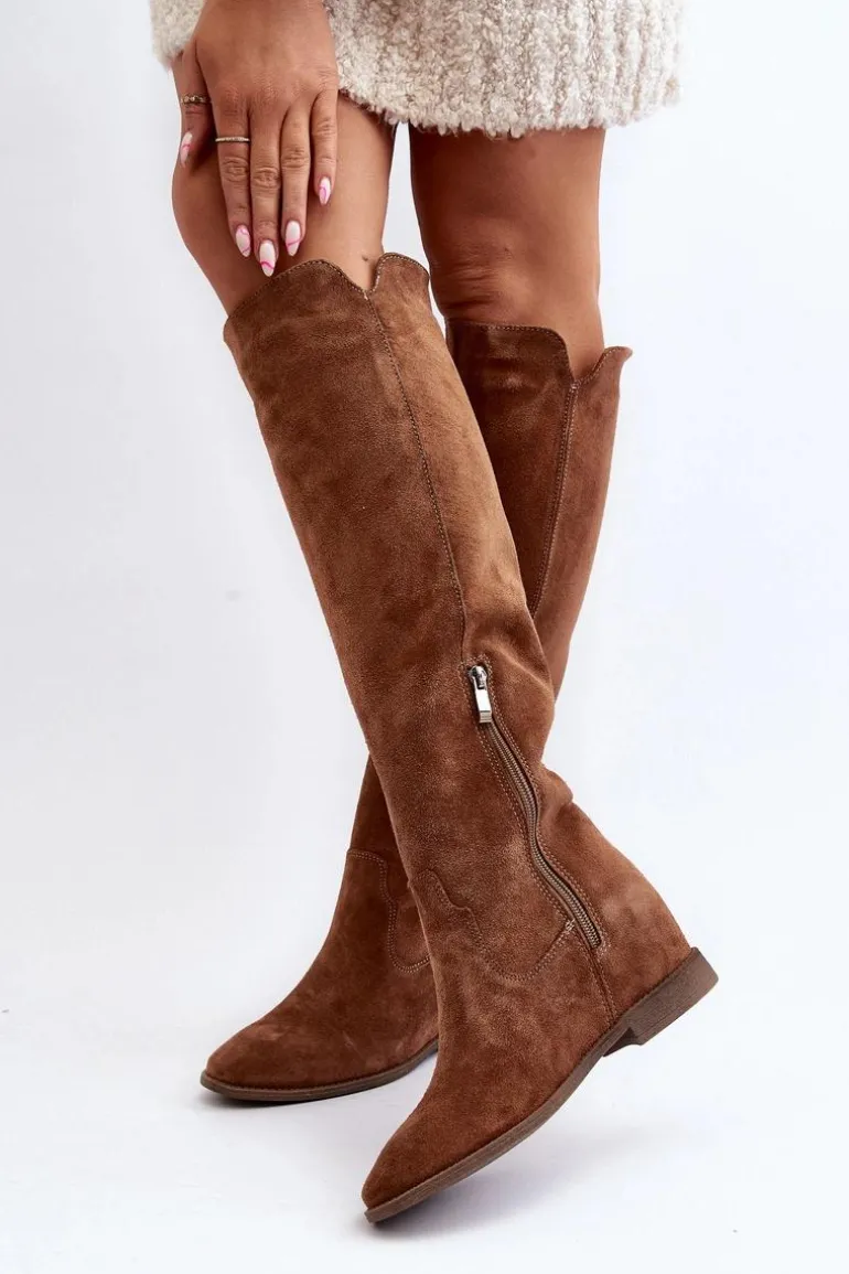 Kozaki damskie zostały wykonane z wysokiej jakości naturalnego zamszu. Osadzone na płaskim obcasie oraz ukrytym koturnie. Cholewka do kolana z wycięciami na bokach. Noski zaokrąglone. Środek lekko ocieplony kocem obuwniczym. Ten modny fason świetnie sprawdzi się w wielu wiosenno-jesiennych stylizacjach! Przy wyborze rozmiaru prosimy sugerować się tabelą rozmiarów.
