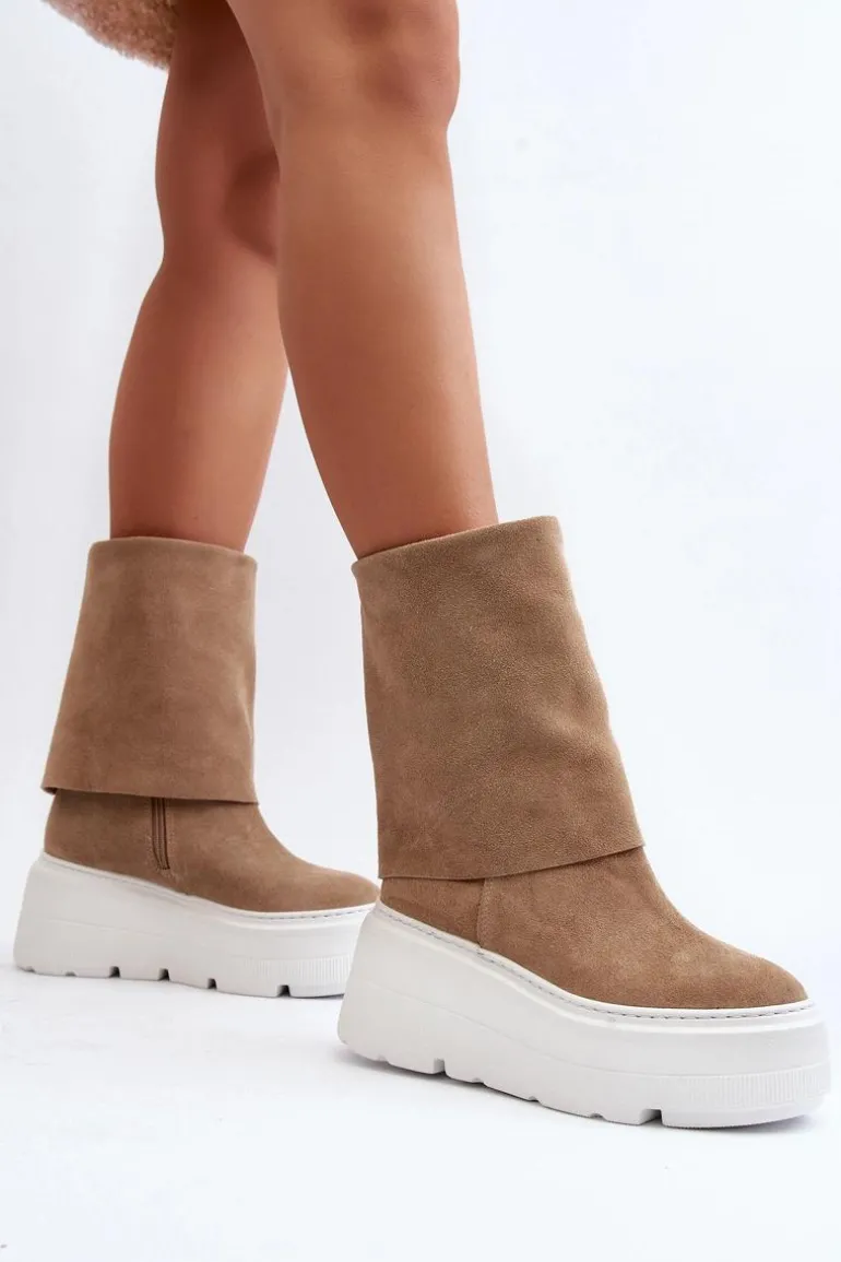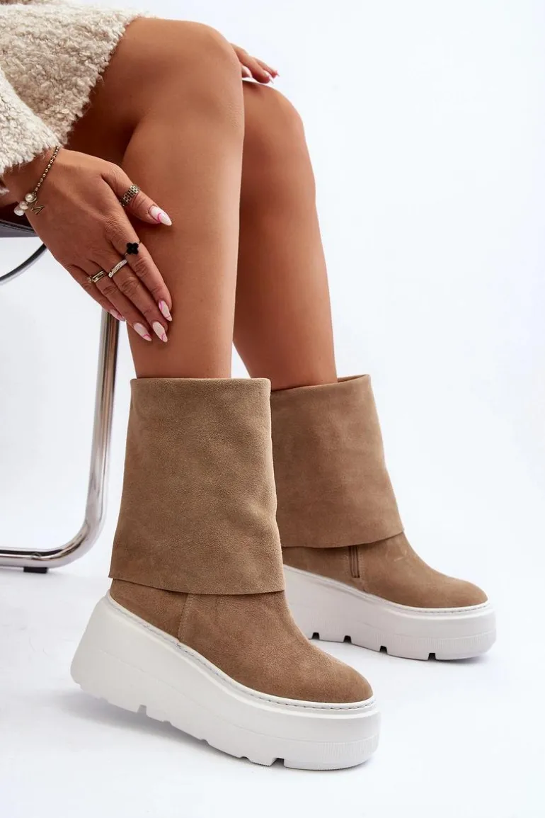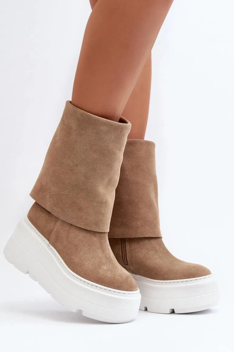 Botki damskie wykonane z naturalnego zamszu. Platforma w tym modelu jest wysoka, jednak botki są niezwykle stabilne. Posiadają zapinanie na zamek od wewnętrznej strony. Noski zaokrąglone. Stylowy fason, który z pewnością dopasujesz do niejednej wiosennej stylizacji! Przy wyborze rozmiaru prosimy sugerować się poniższą tabelą rozmiarów.